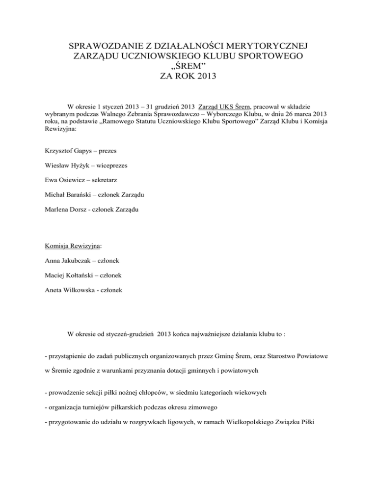 SPRAWOZDANIE Z DZIAŁALNOŚCI MERYTORYCZNEJ ZARZĄDU UCZNIOWSKIEGO KLUBU SPORTOWEGO „ŚREM” ZA ROK 2013 W okresie 1 styczeń 2013 – 31 grudzień 2013 Zarząd UKS Śrem, pracował w składzie wybranym podczas Walnego Zebrania Sprawozdawczo – Wyborczego Klubu, w dniu 26 marca 2013 roku, na podstawie „Ramowego Statutu Uczniowskiego Klubu Sportowego” Zarząd Klubu i Komisja Rewizyjna: Krzysztof Gapys – prezes Wiesław Hyżyk – wiceprezes Ewa Osiewicz – sekretarz Michał Barański – członek Zarządu Marlena Dorsz - członek Zarządu Komisja Rewizyjna: Anna Jakubczak – członek Maciej Kołtański – członek Aneta Wilkowska - członek W okresie od styczeń-grudzień 2013 końca najważniejsze działania klubu to : - przystąpienie do zadań publicznych organizowanych przez Gminę Śrem, oraz Starostwo Powiatowe w Śremie zgodnie z warunkami przyznania dotacji gminnych i powiatowych - prowadzenie sekcji piłki nożnej chłopców, w siedmiu kategoriach wiekowych - organizacja turniejów piłkarskich podczas okresu zimowego - przygotowanie do udziału w rozgrywkach ligowych, w ramach Wielkopolskiego Związku Piłki Nożnej oraz innych rozgrywkach (Koziołek, Oranje), w sezonie 2012/2013 w których brało udział 8 drużyn - utrzymanie zwiększonej w poprzednim roku liczby treningów na drużynę do 3 na drużynę bez zwiększenia wysokości składki - pozyskanie najwyższej w historii klubu wartości wpłat sponsorskich 75 053PLN - udział w ogólnopolskich turniejach w Gdyni, Łodzi oraz międzynarodowych w Barcelonie i Rimini - rozpoczęcie zajęć piłkarskich w śremskich przedszkolach - podpisanie umowy na zakup odzieży klubowej z firmami Vigo i Jako - organizacja obozów sportowych dla 6 drużyn na obiektach w Śremie i Dolsku - organizacja uroczystego zakończenia sezonu 2012/2013, które odbyło się w Serdecznej Osadzie - utworzenie pierwszej klasy piłkarskiej pod patronatem Lecha Poznań w roczniku 2003 - wysłanie 8 zawodników powołanych do kadry Wielkopolski rocznika 2001 - organizacja zajęć dla dzieci w okresie ferii zimowych (basen, łyżwy, bowling) - opracowanie cotygodniowych artykułów prasowych o bieżącej działalności Klubu - zarządzanie majątkiem i funduszami klubu, zgodnie z podjętymi uchwałami; - organizacja andrzejkowego i karnawałowego balu UKS w celu pozyskania środków na funkcjonowanie W roku 2013 w klubie, na „umowę/zlecenie” i „umowę o dzieło”pracowali: Arkadiusz Adach – trener II klasy Sebastian Białobrzeski – instruktor piłki nożnej Filip Raczkowski – instruktor piłki nożnej Tomasz Niedziela – trener klasy II Rafał Mielcarek – instruktor piłki nożnej; Marcin Szwabig – trener II klasy Krzysztof Szymandera – instruktor piłki nożnej Adam Galas – trener II klasy Dariusz Oszmałek – trener II klasy Ewa Jarczyńska -Mucha – księgowa; Ewa Drożdzyńska księgowa, Izabela Nowicka - Administrator W zajęciach piłkarskich, w roku 2013, uczestniczyło w sumie ponad 160 chłopców w wieku od 6, do 14 roku życia. Klub działał w oparciu o bazę sportową Szkoły Podstawowej nr 6, im Braci Barskich, Liceum Ekonomicznego oraz obiekty sportowe Śremskiego Sportu. Zarząd UKS Śrem Prezes Klubu Sekretarz Klubu