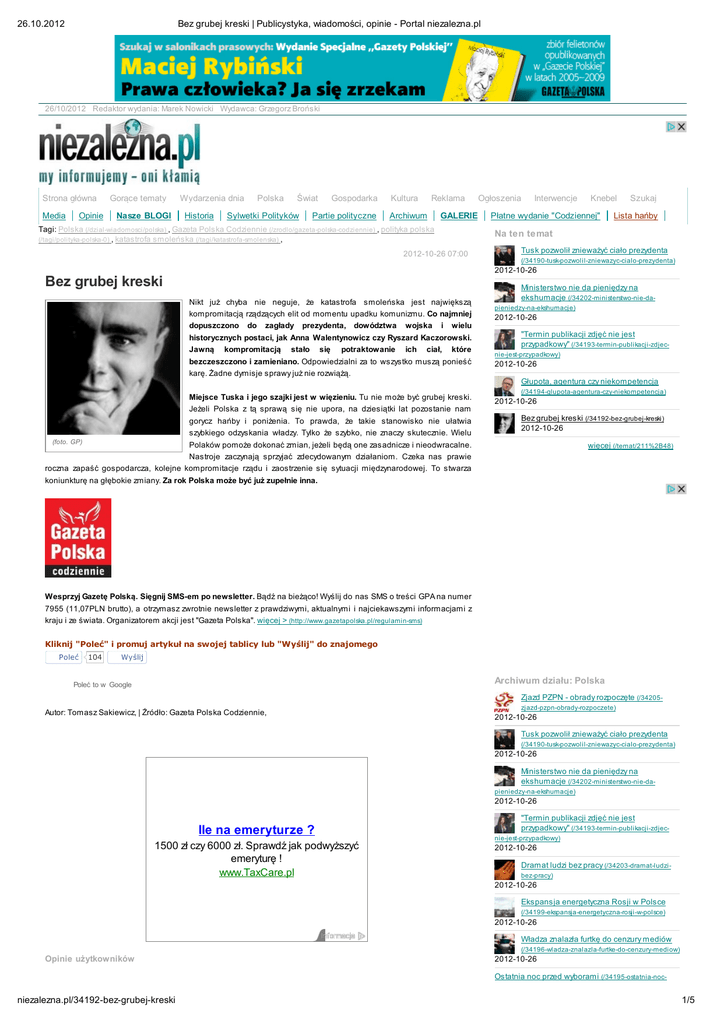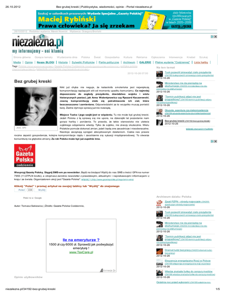 26.10.2012 Bez grubej kreski | Publicystyka, wiadomości, opinie - Portal niezalezna.pl 26/10/2012 Redaktor wydania: Marek Nowicki Wydawca: Grzegorz Broński Strona główna Media Opinie Gorące tematy Nasze BLOGI Wydarzenia dnia Historia Polska Świat Sylwetki Polityków Gospodarka Partie polityczne Kultura Reklama Archiwum GALERIE Tagi: Polska (/dzial-wiadomosci/polska) , Gazeta Polska Codziennie (/zrodlo/gazeta-polska-codziennie) , polityka polska (/tagi/polityka-polska-0) , katastrofa smoleńska (/tagi/katastrofa-smolenska) , 2012-10-26 07:00 Ogłoszenia Interwencje Knebel Płatne wydanie "Codziennej" Szukaj Lista hańby Na ten temat Tusk pozwolił znieważyć ciało prezydenta (/34190-tusk-pozwolil-zniewazyc-cialo-prezydenta) 2012-10-26 Bez grubej kreski Nikt już chyba nie neguje, że katastrofa smoleńska jest największą kompromitacją rządzących elit od momentu upadku komunizmu. Co najmniej dopuszczono do zagłady prezydenta, dowództwa wojska i wielu historycznych postaci, jak Anna Walentynowicz czy Ryszard Kaczorowski. Jawną kompromitacją stało się potraktowanie ich ciał, które bezczeszczono i zamieniano. Odpowiedzialni za to wszystko muszą ponieść karę. Żadne dymisje sprawy już nie rozwiążą. Miejsce Tuska i jego szajki jest w więzieniu. Tu nie może być grubej kreski. Jeżeli Polska z tą sprawą się nie upora, na dziesiątki lat pozostanie nam gorycz hańby i poniżenia. To prawda, że takie stanowisko nie ułatwia szybkiego odzyskania władzy. Tylko że szybko, nie znaczy skutecznie. Wielu (foto. GP) Polaków pomoże dokonać zmian, jeżeli będą one zasadnicze i nieodwracalne. Nastroje zaczynają sprzyjać zdecydowanym działaniom. Czeka nas prawie roczna zapaść gospodarcza, kolejne kompromitacje rządu i zaostrzenie się sytuacji międzynarodowej. To stwarza Ministerstwo nie da pieniędzy na ekshumacje (/34202-ministerstwo-nie-dapieniedzy-na-ekshumacje) 2012-10-26 "Termin publikacji zdjęć nie jest przypadkowy" (/34193-termin-publikacji-zdjecnie-jest-przypadkowy) 2012-10-26 Głupota, agentura czy niekompetencja (/34194-glupota-agentura-czy-niekompetencja) 2012-10-26 Bez grubej kreski (/34192-bez-grubej-kreski) 2012-10-26 więcej (/temat/211%2B48) koniunkturę na głębokie zmiany. Za rok Polska może być już zupełnie inna. Wesprzyj Gazetę Polską. Sięgnij SMS-em po newsletter. Bądź na bieżąco! Wyślij do nas SMS o treści GPA na numer 7955 (11,07PLN brutto), a otrzymasz zwrotnie newsletter z prawdziwymi, aktualnymi i najciekawszymi informacjami z kraju i ze świata. Organizatorem akcji jest "Gazeta Polska". więcej > (http://www.gazetapolska.pl/regulamin-sms) Kliknij "Poleć" i promuj artykuł na swojej tablicy lub "Wyślij" do znajomego Poleć 104 Wyślij Archiwum działu: Polska Poleć to w Google Zjazd PZPN - obrady rozpoczęte (/34205Autor: Tomasz Sakiewicz, | Źródło: Gazeta Polska Codziennie, zjazd-pzpn-obrady-rozpoczete) 2012-10-26 Tusk pozwolił znieważyć ciało prezydenta (/34190-tusk-pozwolil-zniewazyc-cialo-prezydenta) 2012-10-26 Ministerstwo nie da pieniędzy na ekshumacje (/34202-ministerstwo-nie-dapieniedzy-na-ekshumacje) 2012-10-26 Ile na emeryturze ? 1500 zł czy 6000 zł. Sprawdź jak podwyższyć emeryturę ! www.TaxCare.pl "Termin publikacji zdjęć nie jest przypadkowy" (/34193-termin-publikacji-zdjecnie-jest-przypadkowy) 2012-10-26 Dramat ludzi bez pracy (/34203-dramat-ludzibez-pracy) 2012-10-26 Ekspansja energetyczna Rosji w Polsce (/34199-ekspansja-energetyczna-rosji-w-polsce) 2012-10-26 Władza znalazła furtkę do cenzury mediów (/34196-wladza-znalazla-furtke-do-cenzury-mediow) Opinie użytkowników 2012-10-26 Ostatnia noc przed wyborami (/34195-ostatnia-noc- niezalezna.pl/34192-bez-grubej-kreski 1/5