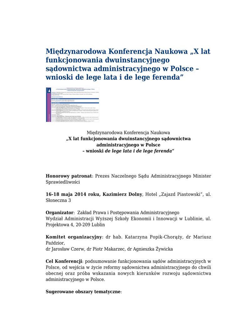 Międzynarodowa Konferencja Naukowa „X lat funkcjonowania dwuinstancyjnego sądownictwa administracyjnego w Polsce – wnioski de lege lata i de lege ferenda” Międzynarodowa Konferencja Naukowa „X lat funkcjonowania dwuinstancyjnego sądownictwa administracyjnego w Polsce – wnioski de lege lata i de lege ferenda” Honorowy patronat: Prezes Naczelnego Sądu Administracyjnego Minister Sprawiedliwości 16-18 maja 2014 roku, Kazimierz Dolny, Hotel „Zajazd Piastowski”, ul. Słoneczna 3 Organizator: Zakład Prawa i Postępowania Administracyjnego Wydział Administracji Wyższej Szkoły Ekonomii i Innowacji w Lublinie, ul. Projektowa 4, 20-209 Lublin Komitet organizacyjny: dr hab. Katarzyna Popik-Chorąży, dr Mariusz Paździor, dr Jarosław Czerw, dr Piotr Makarzec, dr Agnieszka Żywicka Cel Konferencji: podsumowanie funkcjonowania sądów administracyjnych w Polsce, od wejścia w życie reformy sądownictwa administracyjnego do chwili obecnej oraz próba wskazania nowych kierunków rozwoju sądownictwa administracyjnego w Polsce. Sugerowane obszary tematyczne: 1. Początki i rozwój sądownictwa administracyjnego w Polsce 2. Wpływ orzecznictwa sądów administracyjnych na stosowanie prawa w Polsce 3. Wpływ orzecznictwa sądów administracyjnych na prawidłowe funkcjonowanie administracji publicznej w Polsce 4. Funkcjonowanie dwuinstancyjnego sądownictwa administracyjnego w Polsce - próba oceny 5. Sądownictwo administracyjne w Europie 6. Sądownictwo administracyjne w Polsce – propozycje zmian Po Konferencji zostanie wydana recenzowana publikacja. PROGRAM KONFERENCJI 16 maja 2014 (piątek) Od 14.00 – zakwaterowanie w hotelu (Hotel „Zajazd Piastowski”) 19.00 – kolacja powitalna w plenerze (Hotel „Zajazd Piastowski”) 17 maja 2014 (sobota) 8.00-10.00 śniadanie (Hotel „Zajazd Piastowski”) Od 9.30 – rejestracja uczestników Konferencji (Hotel „Zajazd Piastowski”) 10.00 – uroczyste otwarcie Konferencji (Hotel „Zajazd Piastowski”, sala konferencyjna) 10.15-11.45 – pierwsza sesja plenarna – Moderator: dr hab. Wojciech Orłowski 10.15-10.35 dr hab. Jerzy Paśnik (Akademia Humanistyczna im. A. Gieysztora w Pułtusku) – Rewizja nadzwyczajna i skarga kasacyjna jako środki zaskarżania orzeczeń NSA w latach 1980-2003 10.35-10.55 dr Piotr Makarzec (Wyższa Szkoła Ekonomii i Innowacji w Lublinie) – Geneza sądownictwa administracyjnego w Polsce 10.55-11.15 dr Paweł Sadowski (Uniwersytet im. Marii Curie Skłodowskiej w Lublinie) – Wtórna niekonstytucyjność a postępowanie administracyjne – zagadnienia wybrane 11.15-11.35 dr Jarosław Harczuk (Wojewódzki Sąd Administracyjny w Lublinie) – Mediacja sądowoadministracyjna. Podsumowanie funkcjonowania. 11.35-11.45 – dyskusja 11.45-12.00 – przerwa kawowa 12.00-13.30 – druga sesja plenarna – Moderator: prof. dr hab. Jerzy Stelmasiak 12.00-12.20 dr Monika Kępa (Uniwersytet im. Marii Curie Skłodowskiej w Lublinie) – Wpływ orzecznictwa sądów administracyjnych na stosowanie prawa w zakresie podatku od nieruchomości – wybrane zagadnienia 12.20-12.40 dr Piotr Sawczuk (Uniwersytet im. Marii Curie Skłodowskiej w Lublinie) – Wpływ orzecznictwa sądów administracyjnych na stosowanie ogólnego (generalnego) zwolnienia w podatku od spadków i darowizn 12.40-13.00 dr Monika Augustyniak (Krakowska Akademia im. Frycza Modrzewskiego w Krakowie) – Komisje organów stanowiących jednostek samorządu terytorialnego w świetle orzecznictwa sądów administracyjnych 13.00-13.30 – dyskusja 13.30-14.30 – lunch (Hotel „Zajazd Piastowski”, restauracja) 14.30-16.10 – trzecia sesja plenarna – Moderator: prof. dr hab. Stanisław Wrzosek 14.30-14.50 dr Anna Szyszka (Uniwersytet im. Jana Kochanowskiego w Kielcach) – Wymogi formalne skargi do wojewódzkiego sądu administracyjnego 14.50-15.10 dr Jacek Leńczuk (Wyższa Szkoła Ekonomii i Innowacji w Lublinie) – Rola orzecznictwa sądów administracyjnych w procesie stosowania prawa podatkowego 15.10-15.30 mgr Łukasz Dziamski (Uniwersytet Warszawski) – Sądowoadministracyjna kontrola postępowania w sprawie aktualizacji opłaty rocznej z tytułu użytkowania wieczystego 15.30-15.50 dr Rostyslav Soplinyk (Lwowski Uniwersytet Biznesu i Prawa) – Ensure the right to defense liberty and security under the new Criminal Procedure Code Ukraine 15.50-16.10 – dyskusja 16.30-18.00 – zwiedzanie Kazimierza Dolnego z przewodnikiem 19.00 – uroczysta kolacja (Hotel „Zajazd Piastowski”, restauracja) 18 maja 2014 (niedziela) 8.00 – 10.30 – śniadanie (Hotel „Zajazd Piastowski”) 10.30-12.30 – czwarta sesja plenarna – Moderator: prof. dr hab. Bogumił Szmulik 10.30-10.50 mgr Magdalena Chraniuk-Stępniak – Zarzuty skargi kasacyjnej w świetle orzecznictwa Naczelnego Sądu Administracyjnego 10.50-11.10 dr Katarzyna Anna Kułak-Krzysiak (Katolicki Uniwersytet Lubelski) – Efektywność sądownictwa administracyjnego z punktu widzenia jednostki – wnioski de lege lata i de lege ferenda 11.10-11.30 dr Galina Boldar (Luhansk state university of internal affairs named after E.O. Didorenko) – Blanket reference as a form of inter-branch linkage of criminal and administrative law 11.30-11.50 mgr Natalia Gmurkowska (Doktorantka Zakładu Badań Etnicznych na Wydziale Politologii UMCS) – Możliwości rozwoju sądownictwa administracyjnego w kontekście reformy administracji publicznej na Ukrainie 11.50-12.10 mgr Magdalena Śliwa (Uniwersytet Warszawski) – Instytucja doręczenia elektronicznego w postępowaniu sądowoadministarcyjnym – uwagi de lege lata i de lege ferenda 12.10-12.30dr Ruslana Rudnitska (Lviv Regional Institute of Public Administration, National Academy of Public Administrational) – Role of Audit in preventing corruption – difficulties and latest development in Ukraine 12.30-12.40 – dyskusja 12.40-12.50 – przerwa kawowa 12.50-13.00 – Podsumowanie Konferencji 13.00-13.15 – uroczyste zakończenie Konfere