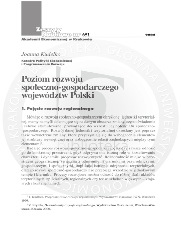 Zeszyty Naukowe nr 651 2004 Akademii Ekonomicznej w Krakowie Joanna Kude∏ko Katedra Polityki Ekonomicznej i Programowania Rozwoju Poziom rozwoju spo∏eczno-gospodarczego województw Polski 1. Poj´cie rozwoju regionalnego Mówiąc o rozwoju społeczno-gospodarczym określonej jednostki terytorialnej, mamy na myśli dokonujące się na danym obszarze zmiany, często świadomie i celowo stymulowane, prowadzące do wzrostu jej potencjału społeczno-gospodarczego. Rozwój danej jednostki terytorialnej określany jest poprzez takie wewnętrzne zmiany, które przyczyniają się do wzbogacenia elementów jej struktury wewnętrznej oraz wzbogacenie relacji zachodzących między tymi elementami1. Badając proces rozwoju społeczno-gospodarczego, należy zawsze odnosić go do konkretnej przestrzeni, gdyż odgrywa ona istotną rolę w kształtowaniu charakteru i dynamiki procesów rozwojowych2. Różnorodność miejsc w przestrzeni geograficznej, związana z odmiennymi warunkami przyrodniczymi, gospodarczymi i społecznymi, implikuje istnienie odrębności terytorialnych, dlatego rozwój społeczno-gospodarczy nie przebiega wszędzie w jednakowym tempie i kierunku. Procesy rozwojowe można odnosić do różnej skali układów terytorialnych, np. lokalnych, regionalnych czy też w układach większych – krajowych i kontynentalnych. 1 T. Kudłacz, Programowanie rozwoju regionalnego, Wydawnictwo Naukowe PWN, Warszawa 1999. 2 Z. Szymla, Determinanty rozwoju regionalnego, Wydawnictwo Ossolineum, Wrocław–Warszawa–Kraków 2000. Joanna Kudełko 76 Niezmierne istotnym problemem jest wspieranie rozwoju społeczno-gospodarczego w skali regionalnej. Każdy region rozwija się jako integralna część całej gospodarki narodowej, tak więc sukces ogólnego procesu rozwoju cywilizacyjnego uzależniony jest w dużej mierze od rozwoju poszczególnych układów regionalnych. Rozwój regionalny rozumieć należy jako nieodwracalne zmiany zmierzające do osiągania trwałego wzrostu potencjału społeczno-gospodarczego regionów. W ujęciu słownikowym rozwój regionalny definiowany jest jako „wzrost potencjału gospodarczego regionów oraz trwała poprawa ich konkurencyjności i poziomu życia mieszkańców, co przyczynia się do rozwoju społeczno-gospodarczego kraju” 3. Takie ujęcie podkreśla, że osiąganie wzrostu potencjału gospodarczego nie może następować w oderwaniu od aspektu społecznego, gdyż ostatecznym celem rozwoju regionu ma być poprawa dobrobytu i warunków życia jego ludności. Zmiany towarzyszące rozwojowi obejmują zarówno aspekt ilościowy, jak i jakościowy4. Ilościowy aspekt rozwoju dotyczy wzrostu lub zmniejszania się pewnych cech określonej jednostki terytorialnej, np. rozmiarów produkcji dóbr i usług, zmiany dochodu narodowego itp. Zmiany ilościowe wpływają zasadniczo na jakościowy aspekt rozwoju, który określany jest poprzez przekształcenia struktur społeczno-gospodarczych, nadające im nowe cechy i własności. Aby można było mówić o rozwoju, nie wystarczą tylko same zmiany ilościowe. Procesy rozwojowe muszą pociągać za sobą również pożądane zmiany strukturalne, które są jednym z głównych celów procesu wzrostu i rozwoju gospodarczego. Współczesny poziom rozwoju społeczno-gospodarczego struktur regionalnych należy traktować jako wynik złożonego procesu rozwoju cywilizacyjnego. W związku z występowaniem różnic w warunkach geograficzno-przyrodniczych, a także na skutek działania wielu niejednorodnych czynników społeczno-ekonomicznych i kulturowych, poszczególne regiony charakteryzują się odmiennością sytuacji gospodarczej, ekologiczną, a także w poziomie zagospodarowania i rozwoju. Powszechnie uważa się, że zróżnicowania regionalne są obiektywnym zjawiskiem występującym w obecnej fazie rozwoju społeczno-ekonomicznego we wszystkich krajach świata. Ze względu na różny poziom rozwoju i jego dynamikę wyróżnia się określone typy regionów. Według klasycznej typologii regionów L. Klaassena ze względu na poziom i tempo rozwoju wyróżnia się cztery zasadnicze typy regionów5: 3 Słownik rozwoju regionalnego, pod red. M. Kozaka, A. Pyszkowskiego, R. Szewczyka, Polska Agencja Rozwoju Regionalnego, Warszawa 2001. 4 Z. Szymla, op. cit. 5 L. Klaassen, Area. Economic and Social Redevelopment, Paris 1965. Poziom rozwoju społeczno-gospodarczego województw Polski 77 − wysoko rozwinięte i szybko się rozwijające, − wysoko rozwinięte, ale rozwijające się wolniej, − słabo rozwinięte, ale relatywnie szybko się rozwijające, − słabo rozwinięte i wolno się rozwijające. Różnice regionalne w poziomie rozwoju społeczno-gospodarczego stanowią kluczowy problem teorii i praktyki polityki regionalnej. Dotyczą one zarówno sfery gospodarczej, jak i społecznej, gdyż poziom rozwoju gospodarczego w sposób naturalny wpływa na poziom i jakości życia mieszkańców. Siły rynkowe działają w kierunku wzrostu naturalnych zróżnicowań w rozwoju poszczególnych regionów na terenie kraju. W tej sytuacji ważną rolę spełniają władze publiczne, które poprzez prowadzenie aktywnej polityki regionalnej mogą dążyć do niwelowania różnic regionalnych. 2. Determinanty rozwoju regionalnego Do pełnego zobrazowania zjawiska rozwoju regionalnego oraz zaproponowania sposobów podnoszenia jego poziomu, niezbędne jest zidentyfikowanie jego determinant. Jako determinanty rozwoju regionów rozumie się czynniki i uwarunkowania faktycznie i w istotny sposób wpływające na obecny stan i poprawę poziomu rozwoju regionów. Poszczególni autorzy dokonują podziału determinant rozwoju regionalnego, przyjmując różne kryteria. K. Secomski dokonuje ogólnego podziału czynników rozwoju na ekonomiczne, społeczne, ekologiczne, lokalne i przestrzenne 6. E.J. Blakely wśród determinant rozwoju wyszczególnia7: zasoby naturalne, zasoby pracy, w tym pracy kwalifikacyjnej, kapitał, zwłaszcza inwestycyjn