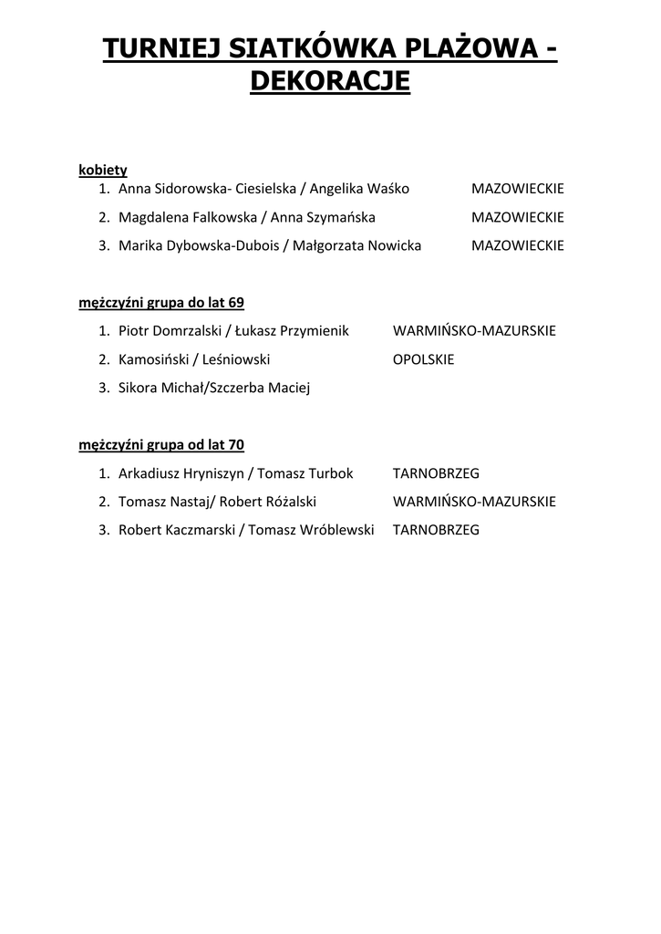 TURNIEJ SIATKÓWKA PLAŻOWA DEKORACJE kobiety 1. Anna Sidorowska- Ciesielska / Angelika Waśko MAZOWIECKIE 2. Magdalena Falkowska / Anna Szymańska MAZOWIECKIE 3. Marika Dybowska-Dubois / Małgorzata Nowicka MAZOWIECKIE mężczyźni grupa do lat 69 1. Piotr Domrzalski / Łukasz Przymienik WARMIŃSKO-MAZURSKIE 2. Kamosiński / Leśniowski OPOLSKIE 3. Sikora Michał/Szczerba Maciej mężczyźni grupa od lat 70 1. Arkadiusz Hryniszyn / Tomasz Turbok TARNOBRZEG 2. Tomasz Nastaj/ Robert Różalski WARMIŃSKO-MAZURSKIE 3. Robert Kaczmarski / Tomasz Wróblewski TARNOBRZEG