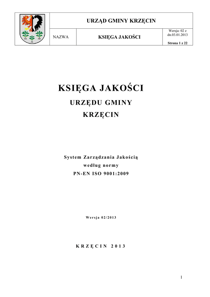 URZĄD GMINY KRZĘCIN NAZWA KSIĘGA JAKOŚCI Wersja: 02 z dn.03.01.2013 Strona 1 z 22 KSIĘGA JAKOŚCI URZĘDU GMINY KRZĘCIN S y s t e m Za r z ą d z a n i a J a k o ś c i ą według normy PN-EN ISO 9001:2009 Wersja 02/2013 KRZĘCIN 2013 1 URZĄD GMINY KRZĘCIN NAZWA KSIĘGA JAKOŚCI Wersja: 02 z dn. 03.01.2013 Strona 2 z 22 SPIS TREŚCI 1. System Zarządzania Jakością w Urzędzie Gminy Krzęcin ............................................................................ 3 1.1 Prezentacja Urzędu................................................................................................................................................. 3 1.2 Zakres stosowania Systemu Zarządzania Jakością ................................................................................................. 6 1.3 Uzasadnione wyłączenia ........................................................................................................................................ 6 2. Odpowiedzialność kierownictwa ........................................................................................................................... 6 2.1 Deklaracja Wójta Gminy ....................................................................................................................................... 6 2.2 Polityka jakości ...................................................................................................................................................... 7 2.3 Odpowiedzialności i uprawnienia .......................................................................................................................... 8 2.4 Przegląd Systemu Zarządzania Jakością ................................................................................................................ 9 2.5 Komunikacja wewnętrzna i zewnętrzna ................................................................................................................. 9 3. Zarządzanie dokumentacją ................................................................................................................................... 10 3.1 Nadzór nad dokumentacją ...................................................................................................................................... 10 3.2 Księga Jakości ........................................................................................................................................................ 12 4. Zarządzanie procesowe .......................................................................................................................................... 12 4.1 Zasady zarządzania procesami ............................................................................................................................... 12 4.2 Procesy ................................................................................................................................................................... 13 4.3 Mapa procesów ...................................................................................................................................................... 14 4.4 Monitorowanie i pomiary ....................................................................................................................................... 14 5. Zarządzanie zasobami ........................................................................................................................................... 15 5.1 Zapewnienie zasobów ............................................................................................................................................ 15 5.2 Zasoby ludzkie ....................................................................................................................................................... 16 6. Orientacja na Klienta ............................................................................................................................................ 17 6.1 Charakterystyka Klienta ......................................................................................................................................... 17 6.2 Własność Klienta ................................................................................................................................................... 18 6.3 Wytyczne badania satysfakcji i wymagań Klienta ................................................................................................. 18 7. Realizacja usług ...................................................................................................................................................... 19 7.1 Planowanie i realizacja procesów........................................................................................................................... 19 7.2 Proces zakupów...................................................................................................................................................... 19 8. Nadzór nad wyrobem niezgodnym ....................................................................................................................... 20 9. Procesy doskonalenia Systemu Zarządzania Jakością ........................................................................................ 21 10. Wykaz załączników .............................................................................................................................................. 22 11. Rejestr zmian ........................................................................................................................................................ 24 2 URZĄD GMINY KRZĘCIN NAZWA KSIĘGA JAKOŚCI Wersja: 02 z dn. 03.01.2013 Strona 3 z 22 Załączniki 1. System Zarządzania Jakością w Urzędzie Gminy Krzęcin 1.1 Prezentacja Urzędu Gmina Krzęcin położona jest na południowym krańcu województwa zachodniopomorskiego, w granicach powiatu Choszczno. Gmina Krzęcin liczy 3923 mieszk