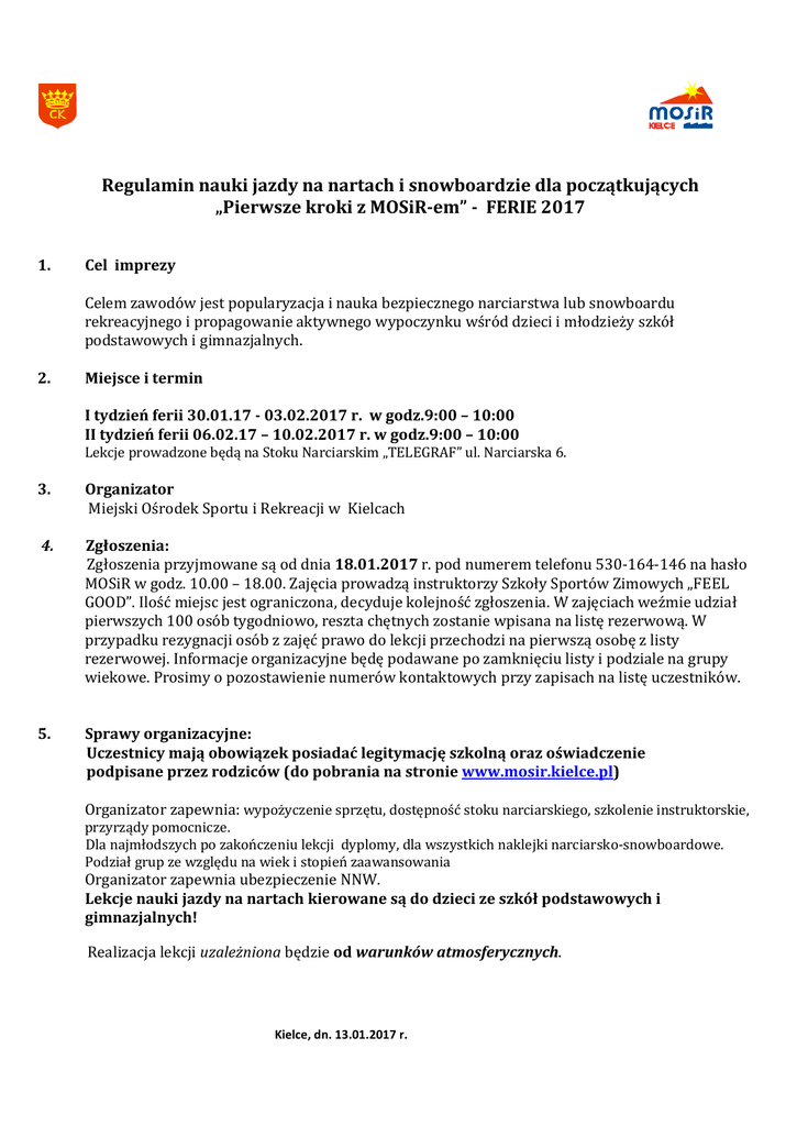 Regulamin nauki jazdy na nartach i snowboardzie dla początkujących „Pierwsze kroki z MOSiR-em” - FERIE 2017 1. Cel imprezy Celem zawodów jest popularyzacja i nauka bezpiecznego narciarstwa lub snowboardu rekreacyjnego i propagowanie aktywnego wypoczynku wśród dzieci i młodzieży szkół podstawowych i gimnazjalnych. 2. Miejsce i termin I tydzień ferii 30.01.17 - 03.02.2017 r. w godz.9:00 – 10:00 II tydzień ferii 06.02.17 – 10.02.2017 r. w godz.9:00 – 10:00 Lekcje prowadzone będą na Stoku Narciarskim „TELEGRAF” ul. Narciarska 6. 3. Organizator Miejski Ośrodek Sportu i Rekreacji w Kielcach 4. Zgłoszenia: Zgłoszenia przyjmowane są od dnia 18.01.2017 r. pod numerem telefonu 530-164-146 na hasło MOSiR w godz. 10.00 – 18.00. Zajęcia prowadzą instruktorzy Szkoły Sportów Zimowych „FEEL GOOD”. Ilość miejsc jest ograniczona, decyduje kolejność zgłoszenia. W zajęciach weźmie udział pierwszych 100 osób tygodniowo, reszta chętnych zostanie wpisana na listę rezerwową. W przypadku rezygnacji osób z zajęć prawo do lekcji przechodzi na pierwszą osobę z listy rezerwowej. Informacje organizacyjne będę podawane po zamknięciu listy i podziale na grupy wiekowe. Prosimy o pozostawienie numerów kontaktowych przy zapisach na listę uczestników. 5. Sprawy organizacyjne: Uczestnicy mają obowiązek posiadać legitymację szkolną oraz oświadczenie podpisane przez rodziców (do pobrania na stronie www.mosir.kielce.pl) Organizator zapewnia: wypożyczenie sprzętu, dostępność stoku narciarskiego, szkolenie instruktorskie, przyrządy pomocnicze. Dla najmłodszych po zakończeniu lekcji dyplomy, dla wszystkich naklejki narciarsko-snowboardowe. Podział grup ze względu na wiek i stopień zaawansowania Organizator zapewnia ubezpieczenie NNW. Lekcje nauki jazdy na nartach kierowane są do dzieci ze szkół podstawowych i gimnazjalnych! Realizacja lekcji uzależniona będzie od warunków atmosferycznych. Kielce, dn. 13.01.2017 r.
