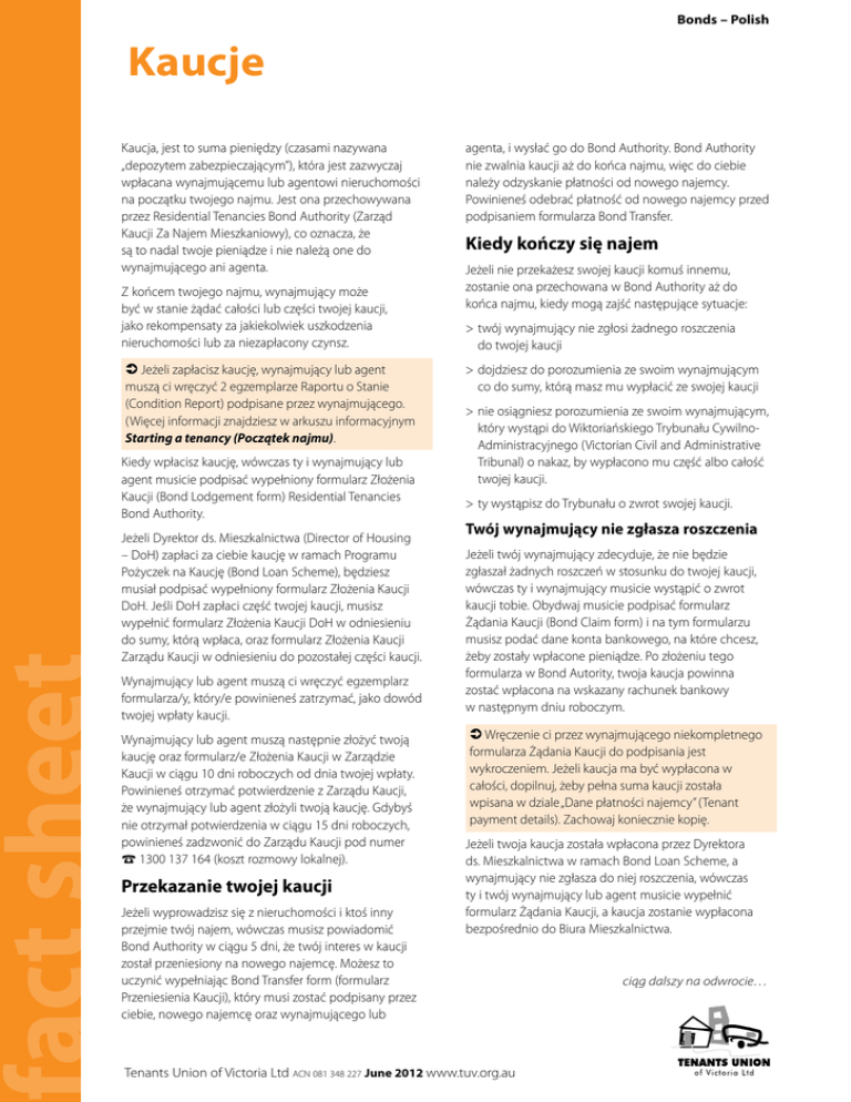 fact act sheet Bonds – Polish Kaucje Kaucja, jest to suma pieniędzy (czasami nazywana „depozytem zabezpieczającym”), która jest zazwyczaj wpłacana wynajmującemu lub agentowi nieruchomości na początku twojego najmu. Jest ona przechowywana przez Residential Tenancies Bond Authority (Zarząd Kaucji Za Najem Mieszkaniowy), co oznacza, że są to nadal twoje pieniądze i nie należą one do wynajmującego ani agenta. Z końcem twojego najmu, wynajmujący może być w stanie żądać całości lub części twojej kaucji, jako rekompensaty za jakiekolwiek uszkodzenia nieruchomości lub za niezapłacony czynsz. 7 Jeżeli zapłacisz kaucję, wynajmujący lub agent muszą ci wręczyć 2 egzemplarze Raportu o Stanie (Condition Report) podpisane przez wynajmującego. (Więcej informacji znajdziesz w arkuszu informacyjnym Starting a tenancy (Początek najmu). Kiedy wpłacisz kaucję, wówczas ty i wynajmujący lub agent musicie podpisać wypełniony formularz Złożenia Kaucji (Bond Lodgement form) Residential Tenancies Bond Authority. Jeżeli Dyrektor ds. Mieszkalnictwa (Director of Housing – DoH) zapłaci za ciebie kaucję w ramach Programu Pożyczek na Kaucję (Bond Loan Scheme), będziesz musiał podpisać wypełniony formularz Złożenia Kaucji DoH. Jeśli DoH zapłaci część twojej kaucji, musisz wypełnić formularz Złożenia Kaucji DoH w odniesieniu do sumy, którą wpłaca, oraz formularz Złożenia Kaucji Zarządu Kaucji w odniesieniu do pozostałej części kaucji. Wynajmujący lub agent muszą ci wręczyć egzemplarz formularza/y, który/e powinieneś zatrzymać, jako dowód twojej wpłaty kaucji. Wynajmujący lub agent muszą następnie złożyć twoją kaucję oraz formularz/e Złożenia Kaucji w Zarządzie Kaucji w ciągu 10 dni roboczych od dnia twojej wpłaty. Powinieneś otrzymać potwierdzenie z Zarządu Kaucji, że wynajmujący lub agent złożyli twoją kaucję. Gdybyś nie otrzymał potwierdzenia w ciągu 15 dni roboczych, powinieneś zadzwonić do Zarządu Kaucji pod numer ☎ 1300 137 164 (koszt rozmowy lokalnej). Przekazanie twojej kaucji Jeżeli wyprowadzisz się z nieruchomości i ktoś inny przejmie twój najem, wówczas musisz powiadomić Bond Authority w ciągu 5 dni, że twój interes w kaucji został przeniesiony na nowego najemcę. Możesz to uczynić wypełniając Bond Transfer form (formularz Przeniesienia Kaucji), który musi zostać podpisany przez ciebie, nowego najemcę oraz wynajmującego lub agenta, i wysłać go do Bond Authority. Bond Authority nie zwalnia kaucji aż do końca najmu, więc do ciebie należy odzyskanie płatności od nowego najemcy. Powinieneś odebrać płatność od nowego najemcy przed podpisaniem formularza Bond Transfer. Kiedy kończy się najem Jeżeli nie przekażesz swojej kaucji komuś innemu, zostanie ona przechowana w Bond Authority aż do końca najmu, kiedy mogą zajść następujące sytuacje: >twój wynajmujący nie zgłosi żadnego roszczenia do twojej kaucji >dojdziesz do porozumienia ze swoim wynajmującym co do sumy, którą masz mu wypłacić ze swojej kaucji >nie osiągniesz porozumienia ze swoim wynajmującym, który wystąpi do Wiktoriańskiego Trybunału CywilnoAdministracyjnego (Victorian Civil and Administrative Tribunal) o nakaz, by wypłacono mu część albo całość twojej kaucji. >ty wystąpisz do Trybunału o zwrot swojej kaucji. Twój wynajmujący nie zgłasza roszczenia Jeżeli twój wynajmujący zdecyduje, że nie będzie zgłaszał żadnych roszczeń w stosunku do twojej kaucji, wówczas ty i wynajmujący musicie wystąpić o zwrot kaucji tobie. Obydwaj musicie podpisać formularz Żądania Kaucji (Bond Claim form) i na tym formularzu musisz podać dane konta bankowego, na które chcesz, żeby zostały wpłacone pieniądze. Po złożeniu tego formularza w Bond Autority, twoja kaucja powinna zostać wpłacona na wskazany rachunek bankowy w następnym dniu roboczym. 7 Wręczenie ci przez wynajmującego niekompletnego formularza Żądania Kaucji do podpisania jest wykroczeniem. Jeżeli kaucja ma być wypłacona w całości, dopilnuj, żeby pełna suma kaucji została wpisana w dziale „Dane płatności najemcy” (Tenant payment details). Zachowaj koniecznie kopię. Jeżeli twoja kaucja została wpłacona przez Dyrektora ds. Mieszkalnictwa w ramach Bond Loan Scheme, a wynajmujący nie zgłasza do niej roszczenia, wówczas ty i twój wynajmujący lub agent musicie wypełnić formularz Żądania Kaucji, a kaucja zostanie wypłacona bezpośrednio do Biura Mieszkalnictwa. Tenants Union of Victoria Ltd ACN 081 348 227 June 2012 www.tuv.org.au ciąg dalszy na odwrocie… Doszedłeś do porozumienia ze swoim wynajmującym Wystąpienie do Trybunału o zwrot swojej kaucji Jeżeli zgodzisz się, że wynajmujący jest uprawniony do części lub całości twojej kaucji, możesz się zgodzić, że suma ta zostanie mu wypłacona. Zarówno ty, jak i wynajmujący musicie wypełnić formularz Bond Claim, stwierdzając, jaka suma kaucji ma zostać wypłacona wynajmującemu i ile ma zostać wypłacone tobie. Możesz również przygotować swój własny wniosek do Trybunału, jeżeli sądzisz, że część lub całość kaucji powinna być tobie zwrócona. Załącz do wniosku egzemplarz pokwitowania twojej kaucji. 7 Jeżeli kaucja ma zostać podzielona pomiędzy ciebie i wynajmującego, dopilnuj, by wpisać odpowiednie sumy w dziale „Dane płatności najemcy” (Tenant payment details) oraz w dziale „Całkowita suma do wypłacenia wynajmującemu/agentowi, w stosownych przypadkach” (Total amount payable to Landlord/Agent if applicable). Sprawdź, czy te sumy tworzą razem całkowitą sumę kaucji. Bond Claim form nie należy wypełniać aż do ostatniego tygodnia twojego najmu. Jeżeli formularz jest datowany więcej niż 7 dni przed końcem twojego najmu, Bond Authority go nie zaakceptuje. Jeżeli twoja kaucja została wpłacona przez Biuro Mieszkalnictwa w ramach Bond Loan Scheme, nie będziesz mógł s