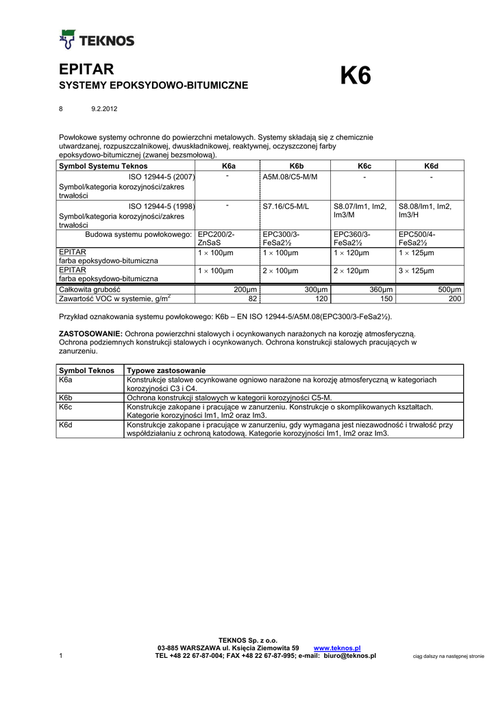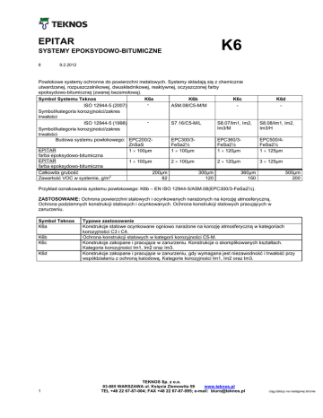 EPITAR K6 SYSTEMY EPOKSYDOWO-BITUMICZNE 8 9.2.2012 Powłokowe systemy ochronne do powierzchni metalowych. Systemy składają się z chemicznie utwardzanej, rozpuszczalnikowej, dwuskładnikowej, reaktywnej, oczyszczonej farby epoksydowo-bitumicznej (zwanej bezsmołową). Symbol Systemu Teknos K6a ISO 12944-5 (2007) Symbol/kategoria korozyjności/zakres trwałości ISO 12944-5 (1998) Symbol/kategoria korozyjności/zakres trwałości Budowa systemu powłokowego: EPC200/2ZnSaS EPITAR 1 100µm farba epoksydowo-bitumiczna EPITAR 1 100µm farba epoksydowo-bitumiczna Całkowita grubość 200µm Zawartość VOC w systemie, g/m2 82 K6b A5M.08/C5-M/M K6c - K6d - S7.16/C5-M/L S8.07/Im1, Im2, Im3/M S8.08/Im1, Im2, Im3/H EPC300/3FeSa2½ 1 100µm EPC360/3FeSa2½ 1 120µm EPC500/4FeSa2½ 1 125µm 2 100µm 2 120µm 3 125µm 300µm 120 360µm 150 500µm 200 Przykład oznakowania systemu powłokowego: K6b – EN ISO 12944-5/A5M.08(EPC300/3-FeSa2½). ZASTOSOWANIE: Ochrona powierzchni stalowych i ocynkowanych narażonych na korozję atmosferyczną. Ochrona podziemnych konstrukcji stalowych i ocynkowanych. Ochrona konstrukcji stalowych pracujących w zanurzeniu. Symbol Teknos K6a K6b K6c K6d 1 Typowe zastosowanie Konstrukcje stalowe ocynkowane ogniowo narażone na korozję atmosferyczną w kategoriach korozyjności C3 i C4. Ochrona konstrukcji stalowych w kategorii korozyjności C5-M. Konstrukcje zakopane i pracujące w zanurzeniu. Konstrukcje o skomplikowanych kształtach. Kategorie korozyjności Im1, Im2 oraz Im3. Konstrukcje zakopane i pracujące w zanurzeniu, gdy wymagana jest niezawodność i trwałość przy współdziałaniu z ochroną katodową. Kategorie korozyjności Im1, Im2 oraz Im3. TEKNOS Sp. z o.o. 03-885 WARSZAWA ul. Księcia Ziemowita 59 www.teknos.pl TEL +48 22 67-87-004; FAX +48 22 67-87-995; e-mail: [email protected] ciąg dalszy na następnej stronie Przygotowanie powierzchni Usunąć z podłoża wszelkie zanieczyszczenia, które mogą wpływać niekorzystnie na oczyszczoną powierzchnię oraz na malowanie. Usunąć rozpuszczalne w wodzie sole stosując odpowiednie metody. Powierzchnie należy przygotować zależnie od rodzaju materiału podłoża: Powierzchnie stalowe: Usunąć zgorzelinę i rdzę przy pomocy obróbki strumieniowo-ściernej do uzyskania stopnia czystości Sa 2½ (ISO 8501-1). Zszorstkowanie powierzchni cienkiej blachy poprawia adhezję powłoki do podłoża. Powierzchnie ocynkowane: Konstrukcje stalowe pokryte ogniowo powłoką cynkową, które są eksponowane w warunkach atmosferycznych można malować po omieceniu ścierniwem (SaS) do uzyskania matowej powierzchni. Odpowiednie środki czyszczące to: np. tlenek aluminium i naturalny piasek. Nie zaleca się malowania konstrukcji ze stali ocynkowanej, które mają być eksploatowane w zanurzeniu. aleca się by nowe konstrukcje z cienkich blach ocynkowanych były lekko przepiaskowane (SaS). Powierzchnie eksponowane w warunkach atmosferycznych, które uległy zmatowieniu można oczyścić także środkiem myjącym PELTIPESU. Aluminium: Powierzchnie należy oczyścić środkiem myjącym PELTIPESU. Powierzchnie, które będą eksponowane w warunkach atmosferycznych, podobnie jak podłoża cynkowe, należy także zszorstkować przez lekkie omiecenie ścierniwem (AlSaS) lub szlifowanie. Miejsce i czas czyszczenia należy wybrać tak, by przygotowana powierzchnia nie uległa zabrudzeniu lub zawilgoceniu przed kolejnymi operacjami. Dodatkowe informacje na temat przygotowania powierzchni można znaleźć w normie ISO 12944-4 i ISO 8501-2. Grunt do Systemy powłokowe można nakładać na grunt epoksydowy do czasowej ochrony KORRO E, grunt czasowej ochrony epoksydowo-cynkowy do czasowej ochrony KORRO SE i grunt krzemianowo-cynkowy do czasowej ochrony KORRO SS. 2 TEKNOS Sp. z o.o. 03-885 WARSZAWA ul. Księcia Ziemowita 59 www.teknos.pl TEL +48 22 67-87-004; FAX +48 22 67-87-995; e-mail: [email protected] ciąg dalszy na następnej stronie Nakładanie Renowacja Przed użyciem wymieszać dokładnie składniki farby. Wymieszać dokładnie bazę z utwardzaczem według podanej na etykiecie proporcji. Należy przygotowywać farbę w ilości umożliwiającej zużycie w podanym czasie przydatności do stosowania. Farbę najkorzystniej jest nakładać natryskiem bezpowietrznym, ponieważ tylko ta metoda zapewnia nałożenie powłoki o zalecanej grubości w jednej warstwie. Temperatura powietrza i podłoża a także wilgotność względna powietrza w czasie malowania i w okresie schnięcia muszą odpowiadać wartościom podanym w poniższej tabeli. Wyższa temperatura przyspiesza proces wysychania. Powierzchnia musi być sucha i wolna od kurzu. Dane techniczne farby podane są w poniższej tabeli i w karcie informacyjnej wyrobu. Zaprawki: Powierzchnie o stopniu skorodowania Ri 1 do Ri 3 mogą być naprawiane przez zaprawkowanie. Usunąć łuszczącą się farbę i rdzę z uszkodzonych obszarów przy użyciu skrobaków i obróbki strumieniowo-ściernej. Przygotowanie powierzchni rozszerzyć poza krawędzie uszkodzeń. Jeśli to konieczne należy sfazować krawędzie przygotowywanych obszarów. Pokryć przygotowane podłoże powłoką zaprawkową systemu do właściwej grubości zestawu. Jeśli wymagany jest jednolity wygląd, cała powierzchnia powinna być oczyszczona (zszorstkowana) a następnie pokryta powłoką nawierzchniową systemu. Całkowita naprawa: Powierzchnie o stopniu skorodowania Ri 4 powinny być całkowicie przemalowane. Należy przygotować powierzchnię za pomocą obróbki strumieniowo-ściernej do uzyskania stopnia czystości Sa 2½ i nakładać powłoki od gruntu do warstwy nawierzchniowej tak jak dla nowych wymalowań. Dane techniczne Farba Karta Informacyjna Rodzaj farby Kolory Wygląd powłoki Rozcieńczalnik Metody nakładania Dysza do natrysku hydrodynamicznego Warunki nakładania - min. temperatura - maks. wilg. względna Oznakowanie bezpieczeństwa Zawartość substancji stałych, objętościowo Całkowita masa subs