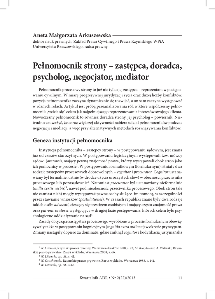 Aneta Małgorzata Arkuszewska doktor nauk prawnych, Zakład Prawa Cywilnego i Prawa Rzymskiego WPiA Uniwersytetu Rzeszowskiego, radca prawny Pełnomocnik strony – zastępca, doradca, psycholog, negocjator, mediator Pełnomocnik procesowy strony to już nie tylko jej zastępca – reprezentant w postępowaniu cywilnym. W miarę progresywnej jurydyzacji życia oraz dużej liczby konfliktów, pozycja pełnomocnika zaczyna dynamicznie się rozwijać, a on sam zaczyna występować w różnych rolach. Artykuł jest próbą przeanalizowania ról, w które współczesny pełnomocnik „wciela się” celem jak najpełniejszego reprezentowania interesów swojego klienta. Nowoczesny pełnomocnik to również doradca strony, jej psycholog – powiernik. Nietrudno zauważyć, że coraz większej aktywności nabiera udział pełnomocników podczas negocjacji i mediacji, a więc przy alternatywnych metodach rozwiązywania konfliktów. Geneza instytucji pełnomocnika Instytucja pełnomocnika – zastępcy strony – w postępowaniu sądowym, jest znana już od czasów starożytnych. W postępowaniu legislacyjnym występowali tzw. mówcy sądowi (oratores), mający pewną znajomość prawa, którzy występowali obok stron jako ich pomocnicy w procesie1. W postępowaniu formułkowym (formularnym) istniały dwa rodzaje zastępców procesowych dobrowolnych – cognitor i procurator. Cognitor ustanawiany był formalnie, ustnie (w drodze użycia uroczystych słów) w obecności przeciwnika procesowego lub pozasądownie2. Natomiast procurator był ustanawiany nieformalnie (nullis certis verbis)3, nawet pod nieobecność przeciwnika procesowego. Obok stron (ale nie zamiast nich) mogły występować pewne osoby służące im pomocą, w szczególności przez stawianie wniosków (postulationes). W czasach republiki znane były dwa rodzaje takich osób: advocati, cieszący się prestiżem osobistym i mający często znajomość prawa oraz patroni, oratores występujący w drugiej fazie postępowania, których celem było psychologiczne oddziaływanie na sąd4. Zasady dotyczące zastępstwa procesowego wyrobione w procesie formularnym obowiązywały także w postępowaniu kognicyjnym (cognitio extra ordinem) w okresie pryncypatu. Zmiany nastąpiły dopiero za dominatu, gdzie zniknął cognitor i kodyfikacja justyniańska 1 W. Litewski, Rzymski proces cywilny, Warszawa–Kraków 1988, s. 22; M. Kuryłowicz, A. Wiliński, Rzym- skie prawo prywatne. Zarys wykładu, Warszawa 2008, s. 66. 2 W. Litewski, op. cit., s. 41. 3 W. Osuchowski, Rzymskie prawo prywatne. Zarys wykładu, Warszawa 1988, s. 141. 4 W. Litewski, op. cit., s 42. Kwartalnik ADR • Nr 2(22)/2013 11 Arkuszewska znała tylko procuratora. Oprócz zastępców procesowych występowali nadal pomocnicy stron – advocati. Za czasów dominatu określano ich, jako iuris periti, causidici, scholastici i togati. Adwokatura nie była już wolnym zawodem, ale została zorganizowana w przymusową korporację. Zasadniczo funkcja procesowa adwokatów nie uległa zmianie, jednak w praktyce byli oni ustanawiani także jako zastępcy procesowi (procuratores)5. W polskim procesie okresu średniowiecza istniała instytucja pomocników strony – rzeczników (advocati lub prolocutor) oraz zastępców (procuratores). Rzecznik działał obok strony, natomiast procurator był zastępcą strony nieobecnej, ustanawiany za pomocą pisemnego pełnomocnictwa6. Pełnomocnictwo jego rozciąga się bądź to na cały proces bądź na poszczególne fazy procesowe. Poza tym zastępcą strony nieobecnej był tzw. responsales, a także nuncius7. Statuty Kazimierza Wielkiego pozwalały każdej osobie ustanowić zastępcę. Można go było ustanowić w sądzie, w domu lub pisemnie. W sądach powstały specjalne księgi pełnomocnictw, a zastępstwo umowne mogło być szczegółowe – do dokonania tylko określonych czynności procesowych, lub generalne – uprawniało do prowadzenia całego procesu8. Rozpowszechnieniu zastępstwa procesowego sprzyjało pojawienie się na przełomie XV i XVI w. odpłatnego zawodowego zastępstwa procesowego. Zajmować się nim mogła szlachta. Za swoje czynności pobierali wynagrodzenie (honorarium). Samodzielny zastępca procesowy określany był patronem, a jego pomocnik to dependent. Ogół zaś osób trudniących się zawodowo zastępstwem procesowym określono mianem palestry 9. W okresie monarchii konstytucyjnej nastąpiło ograniczanie liczby patronów mogących występować przed poszczególnymi sądami (system list zamkniętych). Starano się jednocześnie podnieść poziom wiedzy prawniczej, trybu życia i zachowania się dependentów. Zbiór praw sądowych A. Zamoyskiego zawierał postanowienia mające na celu wzmożenie wśród członków palestry poczucia odpowiedzialności za wykonywanie czynności10. Po odzyskaniu przez Polskę niepodległości w 1918 r. i przeprowadzeniu unifikacji oraz kodyfikacji ustawodawstwa cywilnego, którego wyrazem był Kodeks postępowania cywilnego z 1932 r.11 przyjęto trzy grupy pełnomocników: 1. adwokata, 2. współuczestnika sporu oraz osoby sprawujące zarząd majątkiem lub interesami strony, oraz 3. rodziców, małżonka, rodzeństwo lub dzieci (art. 85). W obecnym stanie prawnym zgodnie z art. 87 § 1 KPC12 w sądowym postępowaniu cywilnym można wyróżnić również trzy grupy podmiotów uprawnionych do występowania w charakterze pełnomocników. Do pierwszej należą adwokaci i radcy prawni 5 Ibidem, s. 83. 6 R. Taubenschlag, Proces polski XIII i XIV wieku do Statutów Kazimierza Wielkiego, Studya nad historią prawa polskiego X.8., s. 22; K. Sójka-Zielińska, Historia prawa, Warszawa 1989, s. 199. 7 R. Taubenschlag, op. cit., s. 25. 8 S. Płaza, Historia prawa w Polsce. Zarys wykładu. Część I. Polska przedrozbiorowa, Kraków 1991, s. 329. 9 Z. Zdrójkowski, [w:] Z. Kaczmarczyk, B. Leśniodorski, Historia państwa i prawa Polski od połowy XV w. do r. 1795, red. J. Bardach, Warszaw 1971, s. 381