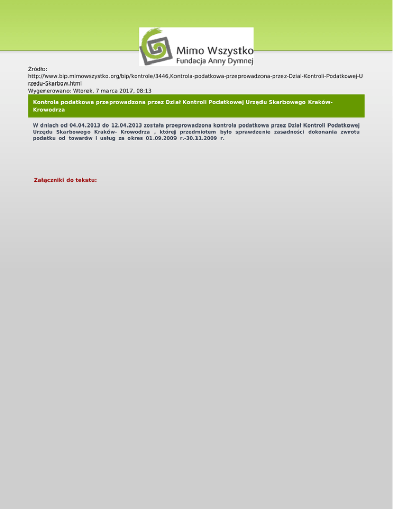Źródło: http://www.bip.mimowszystko.org/bip/kontrole/3446,Kontrola-podatkowa-przeprowadzona-przez-Dzial-Kontroli-Podatkowej-U rzedu-Skarbow.html Wygenerowano: Wtorek, 7 marca 2017, 08:13 Kontrola podatkowa przeprowadzona przez Dział Kontroli Podatkowej Urzędu Skarbowego KrakówKrowodrza W dniach od 04.04.2013 do 12.04.2013 została przeprowadzona kontrola podatkowa przez Dział Kontroli Podatkowej Urzędu Skarbowego Kraków- Krowodrza , której przedmiotem było sprawdzenie zasadności dokonania zwrotu podatku od towarów i usług za okres 01.09.2009 r.-30.11.2009 r. Załączniki do tekstu: