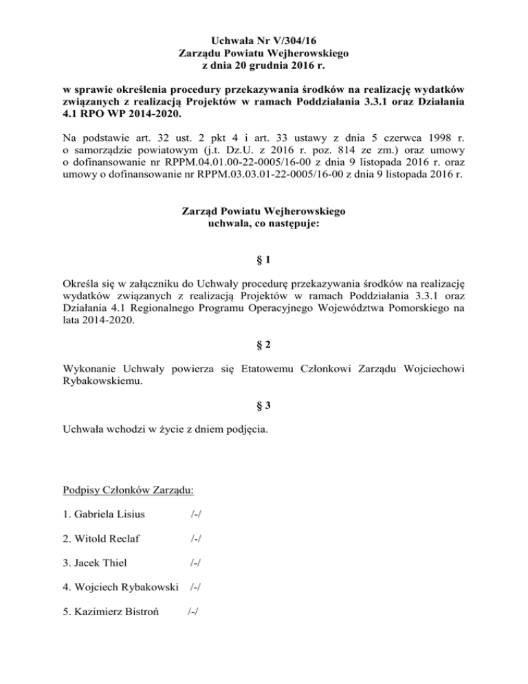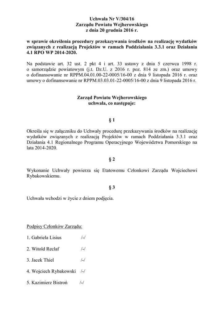 Uchwała Nr V/304/16 Zarządu Powiatu Wejherowskiego z dnia 20 grudnia 2016 r. w sprawie określenia procedury przekazywania środków na realizację wydatków związanych z realizacją Projektów w ramach Poddziałania 3.3.1 oraz Działania 4.1 RPO WP 2014-2020. Na podstawie art. 32 ust. 2 pkt 4 i art. 33 ustawy z dnia 5 czerwca 1998 r. o samorządzie powiatowym (j.t. Dz.U. z 2016 r. poz. 814 ze zm.) oraz umowy o dofinansowanie nr RPPM.04.01.00-22-0005/16-00 z dnia 9 listopada 2016 r. oraz umowy o dofinansowanie nr RPPM.03.03.01-22-0005/16-00 z dnia 9 listopada 2016 r. Zarząd Powiatu Wejherowskiego uchwala, co następuje: §1 Określa się w załączniku do Uchwały procedurę przekazywania środków na realizację wydatków związanych z realizacją Projektów w ramach Poddziałania 3.3.1 oraz Działania 4.1 Regionalnego Programu Operacyjnego Województwa Pomorskiego na lata 2014-2020. §2 Wykonanie Uchwały powierza się Etatowemu Członkowi Zarządu Wojciechowi Rybakowskiemu. §3 Uchwała wchodzi w życie z dniem podjęcia. Podpisy Członków Zarządu: 1. Gabriela Lisius /-/ 2. Witold Reclaf /-/ 3. Jacek Thiel /-/ 4. Wojciech Rybakowski /-/ 5. Kazimierz Bistroń /-/ Załącznik do Uchwały Nr V/304/16 Zarządu Powiatu Wejherowskiego z dnia 20 grudnia 2016 r. Procedura przekazywania środków na realizację wydatków związanych z realizacją Projektów w ramach Poddziałania 3.3.1 oraz Działania 4.1 RPO WP 2014-2020. 1. Przekaz środków na realizację Projektów pomiędzy Instytucją Zarządzającą, a Powiatem Wejherowskim odbywa się za pośrednictwem rachunków wskazanych w odnośnych umowach o dofinansowaniu Projektów. 2. Starostwo Powiatowe w Wejherowie do ponoszenia wydatków związanych z realizacją Projektów otwiera dwa odrębne rachunki pod nazwą: a) „Projekt zawodowy powiatu wejherowskiego w Starostwie Powiatowym w Wejherowie – Poddziałanie 3.3.1”, b) „Projekt zawodowy powiatu wejherowskiego w Starostwie Powiatowym w Wejherowie – Działanie 4.1”. 3. Do ponoszenia części wydatków upoważnia się 5 szkół oraz Powiatowy Zespół Poradni Psychologiczno-Pedagogicznych w Wejherowie, które uczestniczą w realizacji Projektów. 4. Oświatowe jednostki organizacyjne powiatu biorące udział w Projektach, do rozliczania otwierają dwa odrębne rachunki pod nazwą: a) „Projekt zawodowy powiatu wejherowskiego w (nazwa jednostki) – Poddziałanie 3.3.1”, b) „Projekt zawodowy powiatu wejherowskiego w (nazwa jednostki) – Działanie 4.1”. 5. Informacja o założonych rachunkach zostanie przesłana przez Wydział Edukacji do Instytucji Zarządzającej. 6. Zafakturowane usługi, dostawy lub roboty budowlane należy odwoływać do numeru umowy z wykonawcą lub do numeru i daty zlecenia. Koszty zakończonych robót budowlanych lub częściowy odbiór robót powinien dokumentować protokół odbioru. 7. Wydatki na wynagrodzenia osób biorących udział w projekcie dokonywane są zgodnie z: a) Kartą Nauczyciela (j.t. Dz. U. z 2016 r. poz. 1379), b) zawartymi umowami zlecenia, c) przyznanymi dodatkami specjalnymi. 8. Informacje dotyczące wysokości poniesionych kosztów pośrednich Projektu w ramach Poddziałania 3.3.1 ze wskazaniem klasyfikacji budżetowej, sporządzane są przy składaniu wniosku o płatność oraz przed końcem roku kalendarzowego. 9. Wskazana kwota poniesionych kosztów pośrednich zostanie przekazana z rachunku do obsługi Projektu w ramach Poddziałania 3.3.1 na rachunek Starostwa Powiatowego w Wejherowie nr 18 8350 0004 0000 5005 2000 0080. 10. Zapotrzebowanie na środki finansowe na realizację Projektów w Starostwie Powiatowym w Wejherowie składa Wydział Edukacji. 11. Dokonywanie wydatków w jednostkach oświatowych następuje po: a) akceptacji przez Wydział Edukacji skanów dokumentów przesłanych drogą mailową (umowy, faktury, protokoły odbioru, sprawozdania), b) złożeniu drogą mailową zapotrzebowania na środki finansowe do Wydziału Finansowego (oraz podanie do wiadomości w Wydziale Edukacji), c) otrzymaniu środków finansowych na otwarte konto określone w pkt 4 procedury. 12. Wszystkie dokumenty wydatkowe w ramach Projektów powinny zostać opisane i opatrzone pieczęciami wg schematu określonego odrębnie zgodnie z wytycznymi określonymi w pkt 17 a) niniejszej procedury oraz przesłane do Wydziału Edukacji w formie skanu. 13. Zwrot niewykorzystanych środków finansowych przez jednostki następuje na konto Powiatu Wejherowskiego – w ciągu 1 dnia roboczego od zrealizowania płatności. 14. Zwrot do Instytucji Zarządzającej całej kwoty niewykorzystanych środków finansowych zostanie wykonany na wniosek Wydziału Edukacji, ze wskazaniem klasyfikacji budżetowej. 15. Ewidencja księgowa powinna być tak prowadzona, aby umożliwiła ustalenie poniesionych kosztów odrębnie dla każdego z realizowanych Projektów. 16. Wszelkie dokumenty finansowe dotyczące Projektów gromadzone są w jednostkach oświatowych zgodnie z wytycznymi określonymi w pkt 17 b) niniejszej procedury. 17. W niniejszej procedurze mają zastosowanie zapisy: a) Wytycznych dotyczących kwalifikowalności wydatków w ramach Regionalnego Programu Operacyjnego Województwa Pomorskiego na lata 2014-2020, stanowiące załącznik nr 4 do Zasad Wdrażania RPO WP 2014-2020, b) Wytycznych w zakresie zasad przechowywania i udostępniania dokumentów związanych z realizacją Projektów dofinansowanych w ramach RPO WP na lata 2014-2020. „Projekt Zintegrowany – Rozwój publicznego szkolnictwa zawodowego w Powiecie Wejherowskim poprzez wzrost jakości edukacji zawodowej oraz rozbudowę i doposażenie infrastruktury publicznych ponadgimnazjalnych szkół zawodowych w ramach przedsięwzięcia strategicznego – Kształtowanie sieci ponadgimnazjalnych szkół zawodowych uwzględniającej potrzeby subregionalnych i regionalnego rynku pracy”.