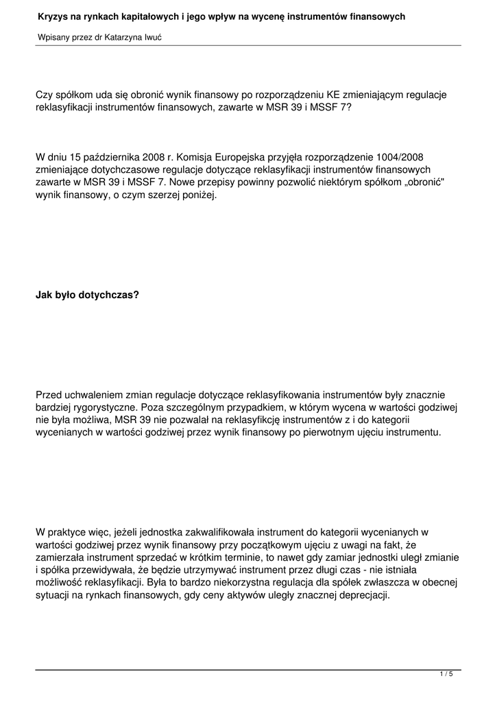Kryzys na rynkach kapitałowych i jego wpływ na wycenę instrumentów finansowych Wpisany przez dr Katarzyna Iwuć Czy spółkom uda się obronić wynik finansowy po rozporządzeniu KE zmieniającym regulacje reklasyfikacji instrumentów finansowych, zawarte w MSR 39 i MSSF 7? W dniu 15 października 2008 r. Komisja Europejska przyjęła rozporządzenie 1004/2008 zmieniające dotychczasowe regulacje dotyczące reklasyfikacji instrumentów finansowych zawarte w MSR 39 i MSSF 7. Nowe przepisy powinny pozwolić niektórym spółkom „obronić" wynik finansowy, o czym szerzej poniżej. Jak było dotychczas? Przed uchwaleniem zmian regulacje dotyczące reklasyfikowania instrumentów były znacznie bardziej rygorystyczne. Poza szczególnym przypadkiem, w którym wycena w wartości godziwej nie była możliwa, MSR 39 nie pozwalał na reklasyfikcję instrumentów z i do kategorii wycenianych w wartości godziwej przez wynik finansowy po pierwotnym ujęciu instrumentu. W praktyce więc, jeżeli jednostka zakwalifikowała instrument do kategorii wycenianych w wartości godziwej przez wynik finansowy przy początkowym ujęciu z uwagi na fakt, że zamierzała instrument sprzedać w krótkim terminie, to nawet gdy zamiar jednostki uległ zmianie i spółka przewidywała, że będzie utrzymywać instrument przez długi czas - nie istniała możliwość reklasyfikacji. Była to bardzo niekorzystna regulacja dla spółek zwłaszcza w obecnej sytuacji na rynkach finansowych, gdy ceny aktywów uległy znacznej deprecjacji. 1/5 Kryzys na rynkach kapitałowych i jego wpływ na wycenę instrumentów finansowych Wpisany przez dr Katarzyna Iwuć W celu lepszego zobrazowania wpływu dotychczasowych regulacji na sprawozdania finansowe danych podmiotów wyobraźmy sobie, że przykładowa Spółka zakupiła w lipcu 2008 r. akcje KGHM za 99,90 zł/akcja (kurs z 1 lipca 2008 r.) z zamiarem odsprzedaży w krótkim terminie. Skoro Spółka miała taki cel, musiała zakwalifikować akcje KGHM do aktywów finansowych wycenianych w wartości godziwej. W tym czasie sytuacja na giełdzie uległa zmianie, kurs akcji gwałtownie spadł i sprzedaż akcji KGHM obecnie przyniosłaby znaczną stratę. Spółka zrewidowała więc swój zamiar trzymania akcji przez krótki czas i obecnie zamierza je mieć przez dłuższy okres. Co do zasady, takie akcje, które Spółka chce utrzymywać przez dłuższy czas, a nie podlegają one konsolidacji, powinny być zaliczone nie do aktywów finansowych wycenianych w wartości godziwej przez wynik finansowy lecz do aktywów dostępnych do sprzedaży. Spółka nie miała jednak możliwości przekwalifikowania akcji do kategorii dostępnych do sprzedaży, ponieważ kwalifikacja do aktywów wycenianych w wartości godziwej przez wynik finansowy była nieodwołalna. W jaki sposób taka reklasyfikacja przysłużyłaby się jednostce? Szukając odpowiedzi na to pytanie należy odnieść się do przepisów o wycenie instrumentów finansowych. Otóż inaczej wycenia się aktywa wyceniane w wartości godziwej przez wynik finansowy, a inaczej aktywa dostępne do sprzedaży. Aktywa wyceniane w wartości godziwej przez wynik finansowy wycenia się zawsze w wartości godziwej, a skutki wyceny odnosi się w bieżący wynik. Aktywa dostępne do sprzedaży również wycenia się w wartości godziwej, lecz skutki wyceny obciążają nie bieżący wynik, ale kapitał własny. Zazwyczaj tworzony jest odrębny składnik kapitału, nazwany przykładowo kapitałem z aktualizacji wyceny. Załóżmy, że nasza spółka miała sporządzić sprawozdanie kwartalne na dzień 30 września 2008 r. Skoro spółka zakwalifikowała akcje przy początkowym ujęciu do kategorii wycenianych w wartości godziwej przez wynik finansowy, to musi wycenić akcje KGHM na 30 września 2008 r. po kursie rynkowym (49,95 zł/akcja - kurs z 30 września br.) a różnice z wyceny odnieść w bieżący wynik. W naszym przykładzie spółka musiałaby ująć w rachunku wyników stratę w kwocie 49,95 zł/akcja (99,90 zł - 49,95 zł). Spółka zmieniła zamiar co do czasu trzymania akcji i obecnie zamierza przeczekać spadki na giełdzie. Instrumenty kapitałowe, co do których nie 2/5 Kryzys na rynkach kapitałowych i jego wpływ na wycenę instrumentów finansowych Wpisany przez dr Katarzyna Iwuć przewiduje się sprzedaży w krótkim terminie (a nie podlegają konsolidacji) powinny być, tak jak już wspomniałam, zakwalifikowane do kategorii dostępnych do sprzedaży, a wówczas strata w kwocie 49,95 zł powinna być ujęta w kapitale, a nie w bieżącym wyniku. Niestety, dawne regulacje nie pozwalały na reklasyfikację instrumentów. Jak jest obecnie? Zmienione regulacje MSR 39 pozwalają na reklasyfikację instrumentów, co do których zmienił się zamiar utrzymywania przez krótki czas. Spółka może przenieść akcje do kategorii dostępnych do sprzedaży ze skutkiem od dnia 1 lipca 2008 r. Co to oznacza w praktyce? Spółka może przykładowo 30 września stwierdzić, że akcje KGHM będą utrzymywane przez dłuższy czas i wówczas może (nie musi - taka reklasyfikacja jest dobrowolna) przenieść akcje KGHM do kategorii dostępnych do sprzedaży. Chociaż decyzja podjęta jest w dniu 30 września 2008 r., to spadki wartości akcji w okresie lipiec-wrzesień mogą być ujęte w kapitale własnym. Pamiętajmy o tym, że retrospektywne zastosowanie zmienionych regulacji jest możliwe tylko w odniesieniu do reklasyfikacji dokonanych przed 1 listopada 2008. Każde przekwalifikowanie składnika aktywów finansowych przeprowadzone w dniu 1 listopada 2008 r. i później staje się skuteczne z dniem, w którym dokonano przekwalifikowania. Zyski i straty, które do dnia przeklasyfikowania zostały odniesione w wynik finansowy pozostają w wyniku finansowym, a wartość godziwa na dzień reklasyfikacji jest uznawana za nowy koszt składnika aktywów. Powyżej omówiliśmy postępowanie w przypadku instrumentów kapitałowych. Czy zmiany