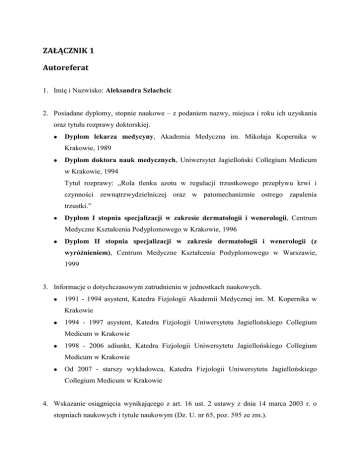 ZAŁĄCZNIK 1 Autoreferat 1. Imię i Nazwisko: Aleksandra Szlachcic 2. Posiadane dyplomy, stopnie naukowe – z podaniem nazwy, miejsca i roku ich uzyskania oraz tytułu rozprawy doktorskiej. Dyplom lekarza medycyny, Akademia Medyczna im. Mikołaja Kopernika w Krakowie, 1989 Dyplom doktora nauk medycznych, Uniwersytet Jagielloński Collegium Medicum w Krakowie, 1994 Tytuł rozprawy: „Rola tlenku azotu w regulacji trzustkowego przepływu krwi i czynności zewnątrzwydzielniczej oraz w patomechanizmie ostrego zapalenia trzustki.” Dyplom I stopnia specjalizacji w zakresie dermatologii i wenerologii, Centrum Medyczne Kształcenia Podyplomowego w Krakowie, 1996 Dyplom II stopnia specjalizacji w zakresie dermatologii i wenerologii (z wyróżnieniem), Centrum Medyczne Kształcenia Podyplomowego w Warszawie, 1999 3. Informacje o dotychczasowym zatrudnieniu w jednostkach naukowych. 1991 - 1994 asystent, Katedra Fizjologii Akademii Medycznej im. M. Kopernika w Krakowie 1994 - 1997 asystent, Katedra Fizjologii Uniwersytetu Jagiellońskiego Collegium Medicum w Krakowie 1998 - 2006 adiunkt, Katedra Fizjologii Uniwersytetu Jagiellońskiego Collegium Medicum w Krakowie Od 2007 - starszy wykładowca, Katedra Fizjologii Uniwersytetu Jagiellońskiego Collegium Medicum w Krakowie 4. Wskazanie osiągnięcia wynikającego z art. 16 ust. 2 ustawy z dnia 14 marca 2003 r. o stopniach naukowych i tytule naukowym (Dz. U. nr 65, poz. 595 ze zm.). tytuł osiągnięcia naukowego: ”Rola hormonów kontrolujących przyjmowanie pokarmu w mechanizmach odpowiedzialnych za utrzymanie integralności błony śluzowej żołądka i w procesie gojenia przewlekłych wrzodów żołądka.” autor/autorzy, tytuł/tytuły publikacji, rok wydania, nazwa wydawnictwa: 1. Jaworek J, Bonior J, Konturek SJ, Bilski J, Szlachcic A, Pawlik WW. Role of leptin in the control of postprandial pancreatic enzyme secretion. J Physiol Pharmacol 2003, (54) 4, 591- 602. 2. Szlachcic A, Brzozowski T, Majka J, Pajdo R, Konturek PC, Pawlik M, Kwiecień S, Drozdowicz D, Bielański W, Konturek SJ, Pawlik WW. Involvement of orexigenic peptides in the mechanism of gastric mucosal integrity and healing of chronic gastric ulcers. Curr Pharm Des 2010, 16 (10), 1214 - 1223. 3. Konturek PC, Brzozowski T, Burnat G, Szlachcic A, Kozieł J, Kwiecień S, Konturek SJ, Harsch IA. Gastric ulcer healing and stress-lesion preventive properties of pioglitazone are attenuated in diabetic rats. J Physiol Pharmacol 2010, 61(4), 429 436. 4. Szlachcic A, Surmiak M, Majka J, Brzozowski T. Nesfatyna1 - nowy hormon uczestniczący w kontroli przyjmowania pokarmu oraz w mechanizmach uszkodzenia i ochrony błony śluzowej żołądka. (Nesfatin-1: a new hormone in the control of food intake and the mechanism of damage and protection of gastric mucosa). Prz Gastroenterol 2012, 7, 6, 339 - 350. 5. Szlachcic A, Śliwowski Z, Krzysiek-Mączka G, Majka J, Surmiak M, Pajdo R, Drozdowicz D, Konturek SJ, Brzozowski T. New satiety hormone nesfatin-1 protects gastric mucosa against stress-induced injury: Mechanistic roles of prostaglandins, nitric oxide, sensory nerves and vanilloid receptors. Peptides 2013, 49 C, 9 - 20. 6. Szlachcic A, Majka J, Strzałka M, Szmyd J, Pajdo R, Ptak-Belowska A, Kwiecień S, Brzozowski T. Experimental healing of preexisting gastric ulcers induced by hormones controlling food intake ghrelin, orexin-A, nesfatin-1 is impaired under diabetic conditions. A key to understand the diabetic gastropathy? J Physiol Pharmacol 2013, 64, 5, 625 - 637. omówienie celu naukowego ww. prac i osiągniętych wyników wraz z omówieniem ich ewentualnego wykorzystania: Przedstawiony cykl publikacji prezentuje wyniki prac badawczych, których tematem przewodnim było zjawisko gastroprotekcji, mechanizm gojenia wrzodów żołądka oraz kontrola aktywności wydzielniczej żołądka i trzustki. Jednakże naczelnym punktem zainteresowania był udział wybranych peptydów kontrolujących przyjmowanie pokarmu w mechanizmach wydzielniczych i odpowiedzialnych za ochronę oraz regenerację błony śluzowej żołądka narażonej na działanie czynników uszkadzających. Utrzymanie integralności błony śluzowej żołądka, pomimo działania czynników ulcerogennych, jest możliwe dzięki licznym mechanizmom obronnym i regeneracyjnym. Niewątpliwie jednym z czynników protekcyjnych są prostaglandyny (PG) produkowane przez błonę śluzową żołądka, których działanie polega na zwiększaniu żołądkowego przepływu krwi, pobudzaniu produkcji śluzu i jonów wodorowęglanowych (HCO3- ) oraz mobilizacji grup sulfhydrylowych. Obok PG własności ochronne względem błony śluzowej żołądka wykazuje szereg innych czynników, takich jak: 1) czynniki wzrostowe np. epidermalny czynnik wzrostu (EGF, epidermal growth factor), transformujący czynnik wzrostu-α (TGF-α, transforming growth factor-α), 2) poliaminy (spermina, spermidyna, putrescyna), 3) naczynioruchowe neuropeptydy uwalniane z zakończeń aferentnych włókien czuciowych (peptyd związany z genem kalcytoniny - calcitonin gene related peptide, CGRP), 4) tlenek azotu (NO) pochodzący ze śródbłonka naczyń, zakończeń aferentnych włókien czuciowych lub z komórek nabłonkowych błony śluzowej żołądka, czy 5) żołądkowo-jelitowe hormony, a zwłaszcza gastryna i cholecytokinina (CCK), jak również insulina i hormony płciowe. Kontrola aktywności wydzielniczej żołądka i trzustki, podobnie jak gastroprotekcja ma charakter złożonego mechanizmu, w którym kluczowa rola przypada czynnikom nerwowym i hormonalnym. Jednakże istotny udział w regulacji wydzielania w warunkach podstawowych, jak i poposiłkowych posiadają również substancje, takie jak: NO, CGRP oraz GRP (peptyd uwalniający gastrynę, gastrin-realising peptide). Odkrycie peptydów głodu i sytości oraz obserwacje sugerujące, że zakres ich biologicznego działania wykracza poza udział w kontroli przyjmowania pokarmu było inspiracją do przeprowadze