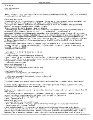 Strona Gminy Łapanów Wybory Autor: Grzegorz Statek 25.09.2015. Wybory do Sejmu Rzeczypospolitej Polskiej i do Senatu Rzeczypospolitej Polskiej Obwodowych Komisji Wyborczych Informacja o składach czytaj treść informacji Zarządzenie Nr 43/2015 Wójta Gminy Łapanów - Kierownika Urzędu z dnia 05 października 2015 r. w sprawie powołania Obwodowych Komisji Wyborczych czytaj treść Zarządzenia Druk zgłoszenia zamiaru głosowania korespondencyjnego w wyborach do Sejmu Rzeczypospolitej Polskiej i do Senatu Rzeczypospolitej Polskiej pobierz Druk wniosku o dopisanie do spisu wyborców pobierz InformacjaZgłoszenia kandydatów na członków Obwodowych Komisji Wyborczych przyjmowane są w terminie do 02 października 2015 r. do godz. 15.00 w pokoju nr 1 Urzędu Gminy w Łapanowie Obwieszczenie Wójta Gminy Łapanów z dnia 21 września 2015 r. o numerach i granicach stałych obwodów głosowania, o siedzibach obwodowych komisji wyborczych oraz o lokalach obwodowych komisji wyborczych przystosowanych do potrzeb wyborców niepełnosprawnych i przeznaczonych do głosowania korespondencyjnego i przez pełnomocnika w wyborach do Sejmu Rzeczypospolitej Polskiej i do Senatu Rzeczypospolitej Polskiej zarządzonych na dzień 25 października 2015 roku czytaj treść Obwieszczenia Obwieszczenie Państwowej Komisji Wyborczej z dnia 24 sierpnia 2015 r. o okręgu wyborczym w wyborach do Sejmu Rzeczypospolitej Polskiej i do Senatu Rzeczypospolitej Polskiej, zarządzonych na dzień 25 października 2015 r. czytaj treść Obwieszczenia WYBORY PREZYDENCKIE 2015 10 maja 2015 r. Obwieszczenie Państwowej Komisji Wyborczej z dnia 12 maja 2015 r. czytaj treść Obwieszczenia Obwieszczenie Państwowej Komisji Wyborczej z dnia 11 maja 2015 r. o wynikach głosowania i wyniku wyborów Prezydenta Rzeczypospolitej Polskiej, zarządzonych na dzień 10 maja 2015 r. czytaj treść Obwieszczenia czytaj treść załącznika nr 1 czytaj treść załącznika nr 2 Link do strony ze wszystkimi komunikatami PKW http://goo.gl/3kTneD Informacja w formie plakatu jak należy głosować Informacja o składach Obwodowych Komisji Wyborczych czytaj treść informacji InformacjaSprawdzanie spisów osób uprawnionych do głosowania w godzinach pracy Urzędu Gminy. Wyborcy przebywający czasowo ma terenie tut. Gminy są dopisywani do spisu wyborców na własny wniosek złożony najpóźniej do dnia 05 maja 2015 r.. Wydawanie zaświadczeń o prawie do głosowania w dowolnie wybranym obwodzie głosowania do dnia 08 maja 2015 r. Zarządzenie Nr 21/2015 Wójta Gminy Łapanów - Kierownika Urzędu z dnia 20 kwietnia 2015 r. w sprawie powołania Obwodowych Komisji Wyborczych czytaj treść Zarządzenia Informacja Państwowej Komisji Wyborczej z dnia 14 kwietnia 2015 r. czytaj treść informacji Informacja Państwowej Komisji Wyborczej z dnia 10 kwietnia 2015 r. dotycząca głosowania korespondencyjnego czytaj treść informacji Obwieszczenie Wójta Gminy Łapanów z dnia 08 kwietnia 2015 r. o numerach i granicach stałych obwodów głosowania, o siedzibach obwodowych komisji wyborczych oraz o lokalach obwodowych komisji wyborczych przystosowanych do potrzeb wyborców niepełnosprawnych i przeznaczonych do głosowania korespondencyjnego i przez pełnomocnika w wyborach Prezydenta Rzeczypospolitej Polskiej zarządzonych na dzień 10 maja 2015 http://www.lapanow.pl Kreator PDF Utworzono 7 March, 2017, 07:13 Strona Gminy Łapanów r. czytaj treść Obwieszczenia Informacja Wójta Gminy Łapanów dla wyborców niepełnosprawnych dotycząca możliwości głosowania w wyborach Prezydenta Rzeczypospolitej Polskiej zarządzonych na dzień 10 maja 2015 r. czytaj treść informacji WYBORY SAMORZĄDOWE 2014 16 listopada 2014 r. Wizualizacja Wyborów Samorządowych w Gminie Łapanów Obwieszczenia komisarzy wyborczych o wynikach wyborów samorządowych WOJEWÓDZTWO MAŁOPOLSKIE Obwieszczenie Komisarza Wyborczego w sprawie wyborów do rad Obwieszczenie Komisarza Wyborczego w sprawie wyborów wójtów, burmistrzów i prezydentów miast Protokół wyników głosowania i wyników wyborów Wójta Gminy Łapanów sporządzony dnia 18.11.2014 r. przez Gminną Komisję Wyborczą w Łapanowie czytaj treść protokołu PROTOKÓŁ Z WYBORÓW do Rady Gminy Łapanów sporządzony dnia 18.11.2014 r. przez Gminną Komisję Wyborczą w Łapanowie czytaj treść Protokołu Obwieszczenie Gminnej Komisji Wyborczej w Łapanowie z dnia 23 października 2014 r. o zarejestrowanych kandydatach na Wójta Gminy Łapanów w wyborach do rad gmin, rad powiatów i sejmików województw oraz wyborach wójtów, burmistrzów i prezydentów miast zarządzonych na dzień 16 listopada 2014 r. czytaj treść obwieszczenia Obwieszczenie Gminnej Komisji Wyborczej w Łapanowie z dnia 22 października 2014 r. o zarejestrowanych listach kandydatów na radnych do Rady Gminy Łapanów w wyborach do rad gmin, rad powiatów i sejmików województw oraz wyborach wójtów, burmistrzów i prezydentów miast zarządzonych na dzień 16 listopada 2014 r. czytaj treść obwieszczenia Uchwała Nr 2/2014 Gminnej Komisji Wyborczej w Łapanowie z dnia 20 października 2014 r. w sprawie powołania Obwodowych Komisji Wyborczych czytaj treść Uchwały Informacja Gminnej Komisji Wyborczej w Łapanowie o terminie losowania składów Obwodowych Komisji Wyborczych czytaj treść informacji Obwieszczenie Gminnej Komisji Wyborczej w Łapanowie z dnia 14 października 2014 r. o nieprzeprowadzeniu wyborów do Rady Gminy Łapanów w okręgu wyborczym nr 11 czytaj treść obwieszczenia Obwieszczenie Gminnej Komisji Wyborczej w Łapanowie z dnia 14 października 2014 r. o nieprzeprowadzeniu wyborów do Rady Gminy Łapanów w okręgu wyborczym nr 6 czytaj treść obwieszczenia Obwieszczenie Gminnej Komisji Wyborczej w Łapanowie z dnia 14 października 2014 r. o nieprzeprowadzeniu wyborów do Rady Gminy Łapanów w okręgu wyborczym nr 3 czytaj treść obwieszczenia Informacje o uprawnieniach dla wyborców niepełnosprawn