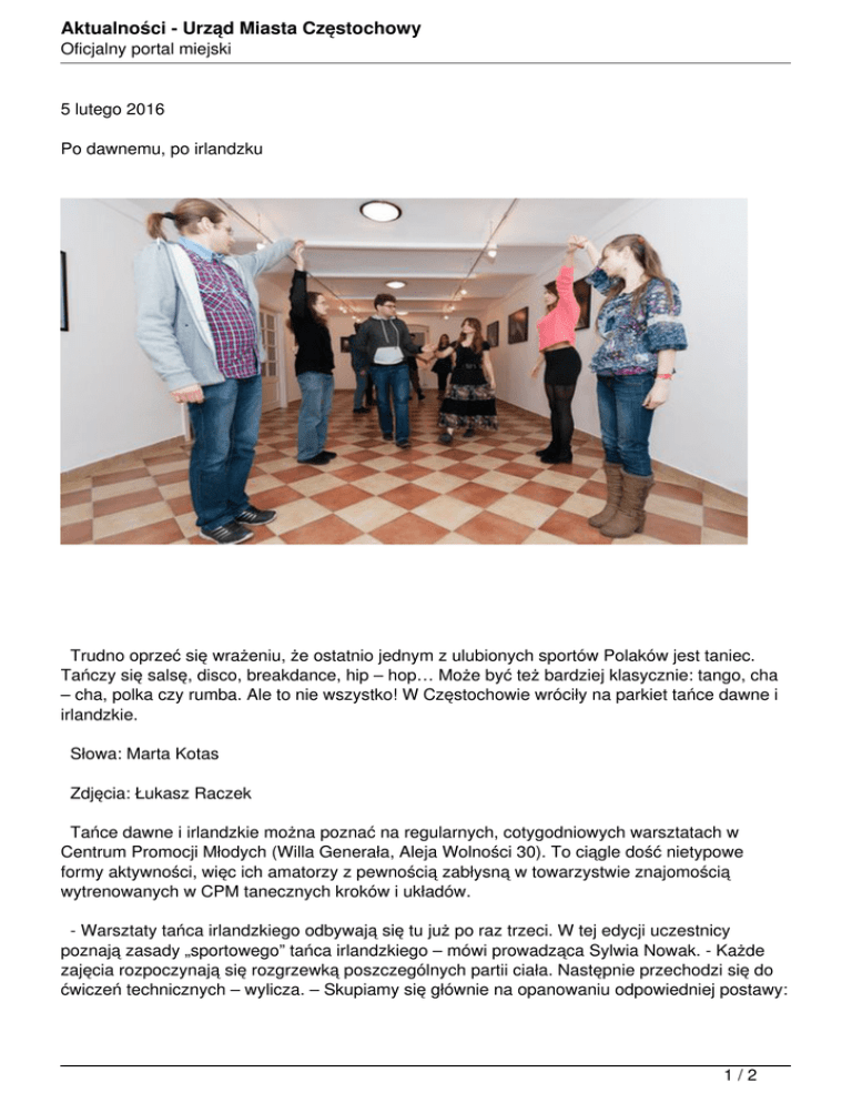Aktualności - Urząd Miasta Częstochowy Oficjalny portal miejski 5 lutego 2016 Po dawnemu, po irlandzku Trudno oprzeć się wrażeniu, że ostatnio jednym z ulubionych sportów Polaków jest taniec. Tańczy się salsę, disco, breakdance, hip – hop… Może być też bardziej klasycznie: tango, cha – cha, polka czy rumba. Ale to nie wszystko! W Częstochowie wróciły na parkiet tańce dawne i irlandzkie. Słowa: Marta Kotas Zdjęcia: Łukasz Raczek Tańce dawne i irlandzkie można poznać na regularnych, cotygodniowych warsztatach w Centrum Promocji Młodych (Willa Generała, Aleja Wolności 30). To ciągle dość nietypowe formy aktywności, więc ich amatorzy z pewnością zabłysną w towarzystwie znajomością wytrenowanych w CPM tanecznych kroków i układów. - Warsztaty tańca irlandzkiego odbywają się tu już po raz trzeci. W tej edycji uczestnicy poznają zasady „sportowego” tańca irlandzkiego – mówi prowadząca Sylwia Nowak. - Każde zajęcia rozpoczynają się rozgrzewką poszczególnych partii ciała. Następnie przechodzi się do ćwiczeń technicznych – wylicza. – Skupiamy się głównie na opanowaniu odpowiedniej postawy: 1/2 Aktualności - Urząd Miasta Częstochowy Oficjalny portal miejski ustawienie stóp, wyprostowana i lekko usztywniona sylwetka, ręce ułożone wzdłuż tułowia. Później mamy powtórkę wyuczonych kroków i poznajemy nowe elementy. Ostatni etap to wspólne ćwiczenie choreografii. Zajęcia taneczne prowadzone są w taki sposób, by nowe osoby mogły dołączyć do grupy w dowolnym momencie. Nie trzeba zatem czekać na nowy cykl warsztatów. Taniec irlandzki jest bardzo dynamiczny, skoczny i wymaga sporego wysiłku fizycznego, jednak nawet osoby o słabej kondycji poradzą sobie z nim bez problemu. Przychodząc na trening trzeba mieć ze sobą odpowiednie obuwie zmienne (baletki, trampki), wygodny strój oraz wodę do picia. Alternatywą dla osób zainteresowanych mniej intensywnymi ćwiczeniami jest taniec dawny, którego uczą w Centrum Promocji Młodych jego miłośnicy. Poza warsztatami przygotowują także pokazy, występują z Garnizonem Fortecy Częstochowskiej. Na zajęciach w CPM początkowo postawili na taniec średniowieczny. - Obecnie repertuar jest poszerzony o te pochodzące z osiemnastego i dziewiętnastego wieku. Pavany, saltarella, galiardy, czy brandzle to tylko kilka z form, które poznajemy w czasie warsztatów – mówi instruktorka Sara Rykała. Podczas każdych zajęć uczymy czegoś nowego, a to pozwala zainteresowanym dołączyć do grupy w dowolnym momencie. Opanowanie jednego tańca zwykle zajmuje niewiele czasu. Kroki są stosunkowo proste i nie wymagają silnej kondycji. Wystarczy odrobina zaangażowania i dobrych chęci, by po kilkunastu minutach przyswoić podstawy – dodaje instruktorka. Zaletą zajęć jest ich elastyczność. Poziom trudności tańców dopasowany jest do możliwości uczestników. Można tu też poznać kawałek historii i samemu poczuć się jak na prawdziwym dawnym balu. Bezpłatne warsztaty tańca irlandzkiego w Centrum Promocji Młodych odbywają się we wtorki w godzinach 17.30 – 19.00, a tańca dawnego w środy o tej samej porze. Nie ma ograniczeń wiekowych, biorą w nich udział zarówno młodsi (najmłodsze uczestniczki miały 6-10 lat) jak i starsi (powyżej 50 roku życia). Nie ma też wydzielonych poziomów trudności. Instruktorzy gwarantują świetną zabawę i nowe doświadczenia. Pozostałe aktualności 2/2 Powered by TCPDF (www.tcpdf.org)