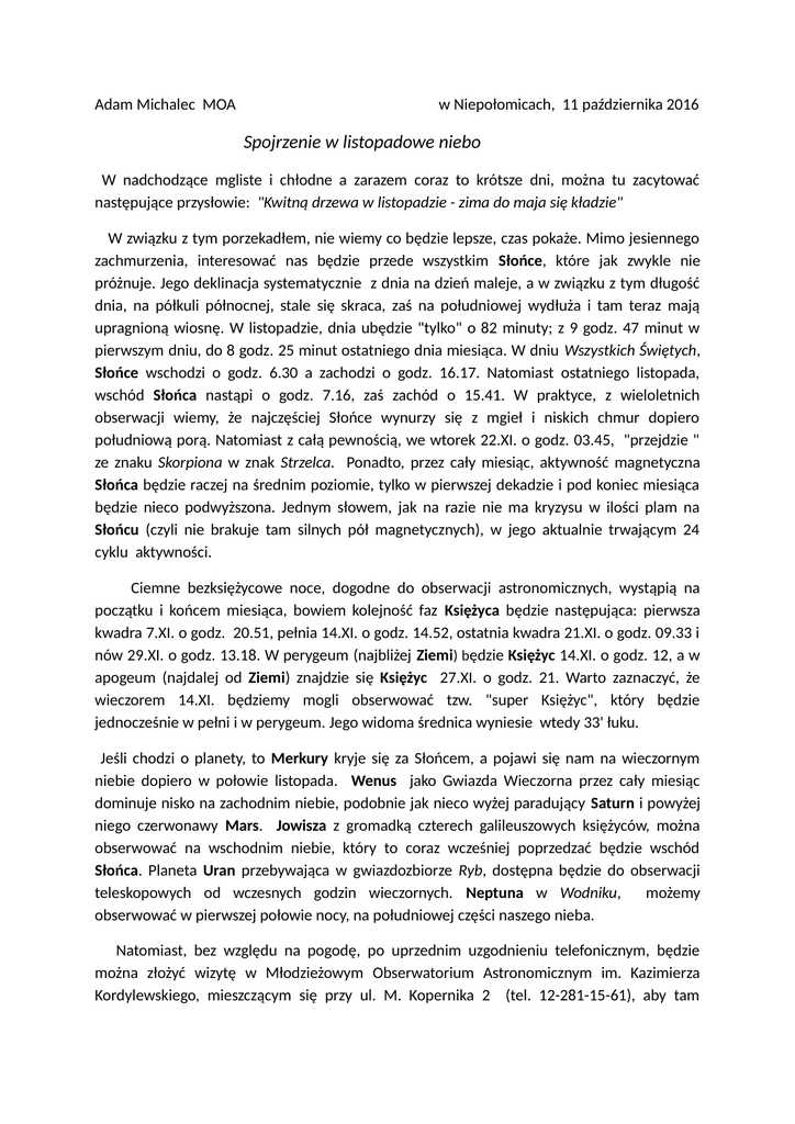 Adam Michalec MOA w Niepołomicach, 11 października 2016 Spojrzenie w listopadowe niebo W nadchodzące mgliste i chłodne a zarazem coraz to krótsze dni, można tu zacytować następujące przysłowie: "Kwitną drzewa w listopadzie - zima do maja się kładzie" W związku z tym porzekadłem, nie wiemy co będzie lepsze, czas pokaże. Mimo jesiennego zachmurzenia, interesować nas będzie przede wszystkim Słońce, które jak zwykle nie próżnuje. Jego deklinacja systematycznie z dnia na dzień maleje, a w związku z tym długość dnia, na półkuli północnej, stale się skraca, zaś na południowej wydłuża i tam teraz mają upragnioną wiosnę. W listopadzie, dnia ubędzie "tylko" o 82 minuty; z 9 godz. 47 minut w pierwszym dniu, do 8 godz. 25 minut ostatniego dnia miesiąca. W dniu Wszystkich Świętych, Słońce wschodzi o godz. 6.30 a zachodzi o godz. 16.17. Natomiast ostatniego listopada, wschód Słońca nastąpi o godz. 7.16, zaś zachód o 15.41. W praktyce, z wieloletnich obserwacji wiemy, że najczęściej Słońce wynurzy się z mgieł i niskich chmur dopiero południową porą. Natomiast z całą pewnością, we wtorek 22.XI. o godz. 03.45, "przejdzie " ze znaku Skorpiona w znak Strzelca. Ponadto, przez cały miesiąc, aktywność magnetyczna Słońca będzie raczej na średnim poziomie, tylko w pierwszej dekadzie i pod koniec miesiąca będzie nieco podwyższona. Jednym słowem, jak na razie nie ma kryzysu w ilości plam na Słońcu (czyli nie brakuje tam silnych pół magnetycznych), w jego aktualnie trwającym 24 cyklu aktywności. Ciemne bezksiężycowe noce, dogodne do obserwacji astronomicznych, wystąpią na początku i końcem miesiąca, bowiem kolejność faz Księżyca będzie następująca: pierwsza kwadra 7.XI. o godz. 20.51, pełnia 14.XI. o godz. 14.52, ostatnia kwadra 21.XI. o godz. 09.33 i nów 29.XI. o godz. 13.18. W perygeum (najbliżej Ziemi) będzie Księżyc 14.XI. o godz. 12, a w apogeum (najdalej od Ziemi) znajdzie się Księżyc 27.XI. o godz. 21. Warto zaznaczyć, że wieczorem 14.XI. będziemy mogli obserwować tzw. "super Księżyc", który będzie jednocześnie w pełni i w perygeum. Jego widoma średnica wyniesie wtedy 33' łuku. Jeśli chodzi o planety, to Merkury kryje się za Słońcem, a pojawi się nam na wieczornym niebie dopiero w połowie listopada. Wenus jako Gwiazda Wieczorna przez cały miesiąc dominuje nisko na zachodnim niebie, podobnie jak nieco wyżej paradujący Saturn i powyżej niego czerwonawy Mars. Jowisza z gromadką czterech galileuszowych księżyców, można obserwować na wschodnim niebie, który to coraz wcześniej poprzedzać będzie wschód Słońca. Planeta Uran przebywająca w gwiazdozbiorze Ryb, dostępna będzie do obserwacji teleskopowych od wczesnych godzin wieczornych. Neptuna w Wodniku, możemy obserwować w pierwszej połowie nocy, na południowej części naszego nieba. Natomiast, bez względu na pogodę, po uprzednim uzgodnieniu telefonicznym, będzie można złożyć wizytę w Młodzieżowym Obserwatorium Astronomicznym im. Kazimierza Kordylewskiego, mieszczącym się przy ul. M. Kopernika 2 (tel. 12-281-15-61), aby tam zobaczyć sztuczne niebo w planetarium, lub zaobserwować przez lunetę planetę Uran lub Neptuna, czy też odbyć wycieczkę po górach, kraterach i morzach lawy na Księżycu. W listopadzie promieniują dwa silne roje meteorów: Taurydy i Leonidy. Taurydy mają podwójny radiant (południowy - S i północny - N) w gwiazdozbiorze Byka. Maksimum ich aktywności przypada na 6.XI. (S) i 12.XI. (N). Ten rój meteorów, to pozostałość po warkoczu krótkookresowej (obiegała Słońce w ciągu 3.3 lat) komety Enckego, która swego czasu rozpadła się na dwie części. Obserwuje się przeciętnie z tego roju, od 10 do 15 "spadających gwiazd" na godzinę. Stosunkowo często, występują też jasne bolidy, wybiegające z obszaru nieba w pobliżu gromad gwiazd: Plejad i Hiad. W tym roku, obserwacjom wieczornym obu rojów będzie przeszkadzał Księżyc podążający do pełni. Leonidy zaś, promieniują z konstelacji Lwa, od 10 do 23 listopada (do 20 przelotów na godzinę), z maksimum 18.XI. nad ranem. Rój ten związany jest z pozostałością po warkoczu komety Tempel-Tuttle'a. Warunki obserwacyjne maksimum tego roju też nie będą łatwe, bowiem Księżyc będzie po pełni. Dysponując zaś wolną chwilą spójrzmy w niebo, niestety najczęściej spowite listopadowymi mgłami i chmurami, o czym dobitnie świadczy takie tęskne staropolskie przysłowie: " Jesień, jesień, - gdzież się podział cudny wrzesień" Zatem u progu grudnia i zbliżającej się milowymi krokami zimy, pogodnego nieba wszystkim Państwu gorąco życzę.