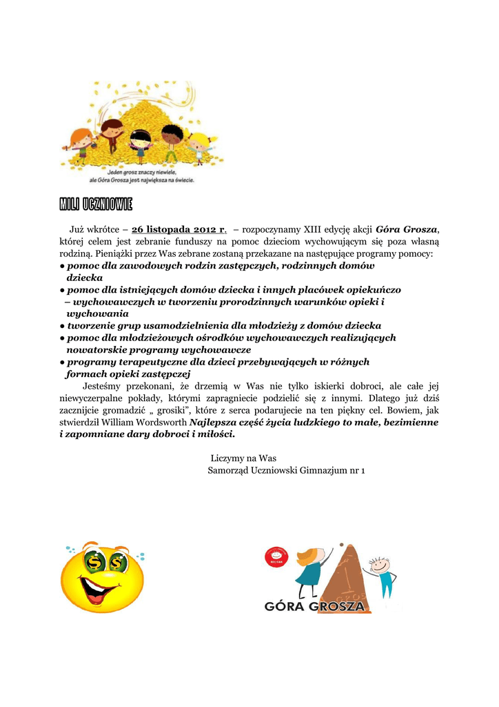 MILI UCZNIOWIE Już wkrótce – 26 listopada 2012 r. – rozpoczynamy XIII edycję akcji Góra Grosza, której celem jest zebranie funduszy na pomoc dzieciom wychowującym się poza własną rodziną. Pieniążki przez Was zebrane zostaną przekazane na następujące programy pomocy: ● pomoc dla zawodowych rodzin zastępczych, rodzinnych domów dziecka ● pomoc dla istniejących domów dziecka i innych placówek opiekuńczo – wychowawczych w tworzeniu prorodzinnych warunków opieki i wychowania ● tworzenie grup usamodzielnienia dla młodzieży z domów dziecka ● pomoc dla młodzieżowych ośrodków wychowawczych realizujących nowatorskie programy wychowawcze ● programy terapeutyczne dla dzieci przebywających w różnych formach opieki zastępczej Jesteśmy przekonani, że drzemią w Was nie tylko iskierki dobroci, ale całe jej niewyczerpalne pokłady, którymi zapragniecie podzielić się z innymi. Dlatego już dziś zacznijcie gromadzić „ grosiki”, które z serca podarujecie na ten piękny cel. Bowiem, jak stwierdził William Wordsworth Najlepsza część życia ludzkiego to małe, bezimienne i zapomniane dary dobroci i miłości. Liczymy na Was Samorząd Uczniowski Gimnazjum nr 1