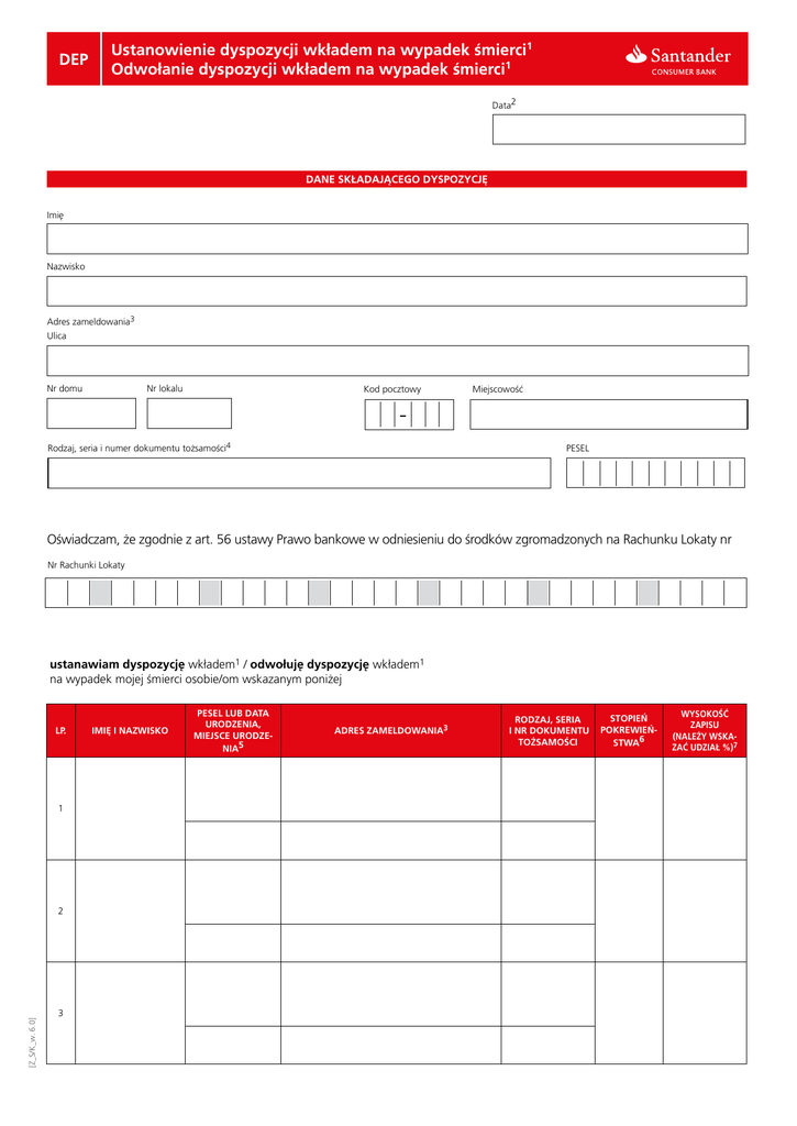 DEP Ustanowienie dyspozycji wkładem na wypadek śmierci1 Odwołanie dyspozycji wkładem na wypadek śmierci1 Data2 DANE SKŁADAJĄCEGO DYSPOZYCJĘ Imię Nazwisko Adres zameldowania3 Ulica Nr domu Nr lokalu Kod pocztowy Rodzaj, seria i numer dokumentu tożsamości4 Miejscowość PESEL Oświadczam, że zgodnie z art. 56 ustawy Prawo bankowe w odniesieniu do środków zgromadzonych na Rachunku Lokaty nr Nr Rachunki Lokaty ustanawiam dyspozycję wkładem1 / odwołuję dyspozycję wkładem1 na wypadek mojej śmierci osobie/om wskazanym poniżej LP. 1 [Z_S/K_w. 6.0] 2 3 IMIĘ I NAZWISKO PESEL LUB DATA URODZENIA, MIEJSCE URODZENIA5 ADRES ZAMELDOWANIA3 RODZAJ, SERIA I NR DOKUMENTU TOŻSAMOŚCI STOPIEŃ POKREWIEŃSTWA6 WYSOKOŚĆ ZAPISU (NALEŻY WSKAZAĆ UDZIAŁ %)7 Przyjmuję do wiadomości, iż: 1. Zwrot kosztów pogrzebu w trybie art. 55 ustawy Prawo bankowe ma pierwszeństwo przed dyspozycją wkładem na wypadek śmierci. 2. Maksymalna kwota wypłaty z dyspozycji wkładem (zapisu) na wypadek śmierci, bez względu na liczbę wydanych dyspozycji, łącznie na rachunkach we wszystkich bankach, nie może być wyższa niż dwudziestokrotne przeciętne miesięczne wynagrodzenie w sektorze przedsiębiorstw bez wypłat nagród z zysku, ogłaszane przez Prezesa Głównego Urzędu Statystycznego za ostatni miesiąc przed śmiercią Posiadacza Lokaty. 3. Osoby, którym na podstawie dyspozycji wkładem na wypadek śmierci, wypłacono kwoty z naruszeniem limitu, o którym mowa w pkt. 2, są zobowiązane do ich zwrotu spadkobiercom Posiadacza Lokaty. 4. Bank nie ponosi odpowiedzialności za ewentualne wypłaty z rachunku bankowego podjęte po śmierci Posiadacza Lokaty przez jego pełnomocnika, jeśli pełnomocnictwo nie zostało odwołane, a Bank nie powziął wiadomości o śmierci Posiadacza Lokaty. 5. Dyspozycja na wypadek śmierci jest ważna do momentu jej odwołania lub zmiany na piśmie, dokonanie niniejszej dyspozycji odwołuje dyspozycję wcześniej dokonaną do wskazanego wyżej rachunku bankowego. Złożona dyspozycja jest wiążąca dla Banku pod warunkiem jej potwierdzenia zgodnie z postanowieniami Regulaminu dotyczącymi formy i trybu składania dyspozycji do rachunku lokaty obowiązującego do lokat/y, do których/ej składana jest dyspozycja. Podpis Posiadacza Lokaty 1 niepotrzebne skreślić 2 data bieżąca w formacie DD. MM. RRRR 3 ulica numer domu, numer lokalu, kod pocztowy, miasto 4 rodzaj dokumentu, seria, numer 5 data urodzenia i miejsce urodzenia są wpisywane w przypadku, gdy wskazana osoba nie posiadana nr PESEL 6 na podst. art. 56.ust.1 osobami, na rzecz, których można dokonać zapisu są: małżonek, zstępni (np. dzieci, wnuki, prawnuki), wstępni (np. rodzice, dziadkowie, pradziadkowie), rodzeństwo 7 suma udziałów wszystkich osób wskazanych w Dyspozycji wkładem na wypadek śmierci nie może przekroczyć 100% zapisu, wypłata z rachunku bankowego na rzecz zapisobiorców będzie dokonana tylko do wysokości zgromadzonych środków ADNOTACJE BANKU [Z_S/K_w. 6.0] Wypełnia Bank Adnotacje Banku Pieczęć i podpis pracownika Banku