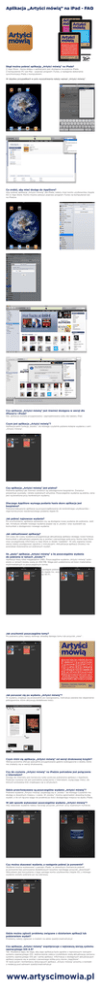 Aplikacja „Artyści mówią” na iPad - FAQ Skąd można pobrać aplikację „Artyści mówią” na iPada? Z App Store - ikona sklepu z aplikacjami jest dostępna na pulpicie iPada. Z komputerów PC lub Mac - poprzez program iTunes, a następnie dokonanie synchronizacji iPada z komputerem. W obydwu przypadkach w polu wyszukiwania należy wpisać „Artyści mówią”. Co zrobić, aby mieć dostęp do AppStore? Aby pobrać aplikację „Artyści mówią” dla iPada, należy mieć konto użytkownika (Apple ID) w App Store. Konto można założyć poprzez program iTunes na komputerze lub na iPadzie. Czy aplikacja „Artyści mówią” jest również dostępna w wersji dla iPhone’a i iPoda? Nie, aplikacja została przygotowana i zaprojektowana tylko dla tabletu iPad. Czym jest aplikacja „Artyści mówią”? Aplikacja pełni funkcję „kiosku”, do którego czytelnik pobiera kolejne wydania z serii „Artyści mówią”. Czy aplikacja „Artyści mówią” jest płatna? Pobranie aplikacji jak również zwiastun są udostępnione bezpłatnie. Zwiastun prezentuje wywiady i dzieła wybranych artystów. Poszczególne wydania są płatne, cena jest wyświetlona przy konkretnym wydaniu. Dlaczego AppStore wymaga podania hasła skoro aplikacja jest bezpłatna? Pobrane/zakupione aplikacje są przyporządkowanie do konkretnego użytkownika – stąd konieczność każdorazowego podania Apple ID. Jak pobrać najnowsze wydanie? Po uruchomieniu, aplikacja sprawdza czy są dostępne nowe wydania do pobrania. Jeśli tak, miniatura okładki nowego wydania pojawi się w „kiosku” oraz wyświetli się komunikat o dostępności nowego wydania. Jak zaktualizować aplikację? Od czasu do czasu wydawca przygotowuje aktualizację aplikacji dodając nowe funkcje. Komunikat o aktualizacji pojawia się w postaci czerwonego pola przy ikonie App Store oraz szczegółowej informacji w App Store w dziale “Updates”. W celu wgrania nowej wersji należy postępować zgodnie z instrukcjami. Aktualizacja aplikacji (kiosku) nie powoduje skasowania już pobranych wydań. Ile „waży” aplikacja „Artyści mówią” a ile poszczególne wydania do pobrania w ramach „kiosku”? Aplikacja waży kilka megabajtów (MB). Poszczególne wydania „Artyści mówią” pobierane w ramach kiosku ważą ok 450 MB. Waga jest uzależniona od ilości materiałów multimedialnych w poszczególnym tomie. Wielkość aplikacji oraz informacja o postępie pobierania jest podana przy miniaturze danego wydania. Zgodnie z zasadami Apple Inc. wszystkie treści o wadze powyżej 20MB muszą zostać pobrane poprzez Wi-Fi. Jak uruchomić poszczególne tomy? Po pobraniu pliku należy dotknąć okładkę danego tomu lub przycisk „view” . Jak poruszać się po wydaniu „Artyści mówią”? W wydaniu znajduje się przewodnik po nawigowaniu. Instrukcja zawiera też objaśnienie piktogramów, które aktywują dodatkowe treści. Czym różni się aplikacja „Artyści mówią” od wersji drukowanej książki? Wersja pozioma oferuje specjalnie przygotowane galerie wzbogacone o dzieła, które nie znalazły się w wersji drukowanej. Czy do czytania „Artyści mówią” na iPadzie potrzebne jest połączenie z internetem? Dostęp do internetu jest konieczny tylko podczas pobierania aplikacji z AppStore. Podczas czytania nie jest potrzebne połączenie z internetem, wyłączając treści, do których prowadzą linki znajdujące się w artykułach. Gdzie przechowywane są poszczególne wydania „Artyści mówią”? Pobrane wydania „Artyści mówią” pojawiają się w „kiosku”, do którego Czytelnik ma dostęp w dowolnym miejscu i czasie. W „kiosku” można zgromadzić dowolną liczbę wydań, o ile ich łączna waga nie przekracza ilości dostępnego miejsca na dysku iPada. W jaki sposób wykasować poszczególne wydania „Artyści mówią”? Aby skasować wydanie należy nacisnąć przycisk „archive” przy wybranym numerze. Czy można skasować wydanie, a następnie pobrać je ponownie? Wydanie można wykasować z pamięci iPada i w dowolnym momencie pobrać je ponownie bez ponoszenia dodatkowych kosztów naciskając przycisk „download”. Warunkiem jest korzystanie z tego samego konta użytkownika (Apple ID), z którego wydanie zostało pobrane po raz pierwszy. Gdzie można zgłosić problemy związane z działaniem aplikacji lub pobieraniem wydań? Problemy należy zgłaszać e-mailem na adres [email protected] Czy aplikacja „Artyści mówią” współpracuje z najnowszą wersją systemu operacyjnego iOS 4.3? Tak. Wydawca dąży do tego, aby jego aplikacja była zgodna z najnowszymi wersjami systemu operacyjnego iOS. Jednocześnie zaleca czytelnikom stałą aktualizację zarówno systemu operacyjnego iOS jak i samej aplikacji. Informacja o dostępnych aktualizacjach aplikacji pojawia się w postaci czerwonego kółka przy ikonie „AppStore”. W razie pytań i komentarzy dotyczących aplikacji „Artyści mówią” prosimy o kontakt z redakcją pod adresem [email protected] www.artyscimowia.pl