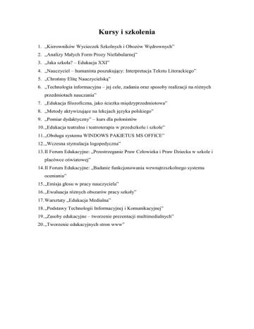 Kursy i szkolenia 1. „Kierowników Wycieczek Szkolnych i Obozów Wędrownych” 2. „Analizy Małych Form Prozy Niefabularnej” 3. „Jaka szkoła? – Edukacja XXI” 4. „Nauczyciel – humanista poszukujący: Interpretacja Tekstu Literackiego” 5. „Chrońmy Elitę Nauczycielską” 6. „Technologia informacyjna – jej cele, zadania oraz sposoby realizacji na różnych przedmiotach nauczania” 7. „Edukacja filozoficzna, jako ścieżka międzyprzedmiotowa” 8. „Metody aktywizujące na lekcjach języka polskiego” 9. „Pomiar dydaktyczny” – kurs dla polonistów 10. „Edukacja teatralna i teatroterapia w przedszkolu i szkole” 11. „Obsługa systemu WINDOWS PAKIETUS MS OFFICE” 12. „Wczesna stymulacja logopedyczna” 13. II Forum Edukacyjne: „Przestrzeganie Praw Człowieka i Praw Dziecka w szkole i placówce oświatowej” 14. II Forum Edukacyjne: „Badanie funkcjonowania wewnątrzszkolnego systemu oceniania” 15. „Emisja głosu w pracy nauczyciela” 16. „Ewaluacja różnych obszarów pracy szkoły” 17. Warsztaty „Edukacja Medialna” 18. „Podstawy Technologii Informacyjnej i Komunikacyjnej” 19. „Zasoby edukacyjne – tworzenie prezentacji multimedialnych” 20. „Tworzenie edukacyjnych stron www”