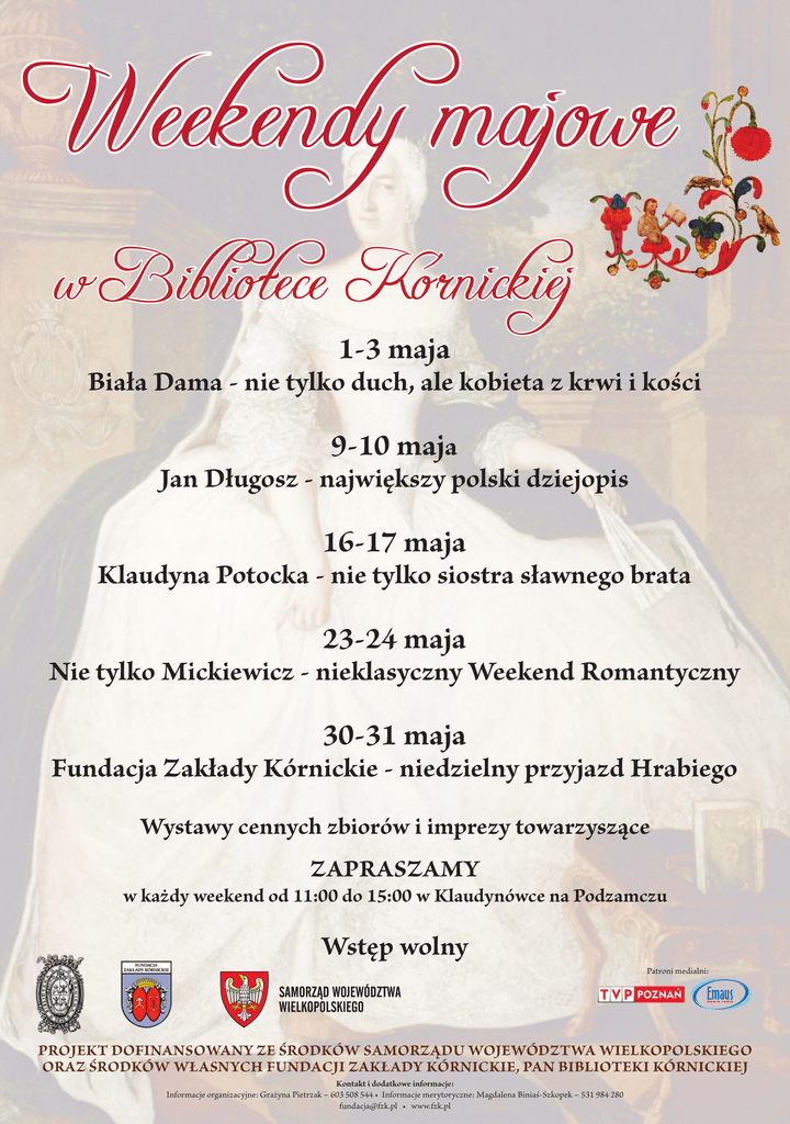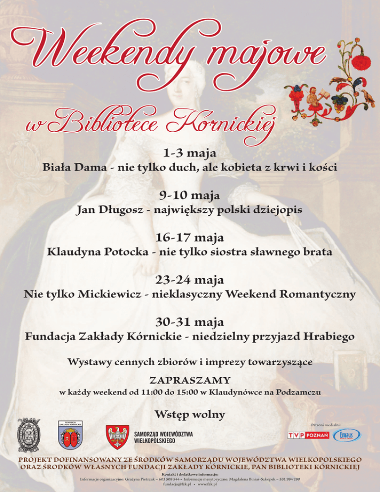 1-3 maja Biała Dama - nie tylko duch, ale kobieta z krwi i kości 9-10 maja Jan Długosz - największy polski dziejopis 16-17 maja Klaudyna Potocka - nie tylko siostra sławnego brata 23-24 maja Nie tylko Mickiewicz - nieklasyczny Weekend Romantyczny 30-31 maja Fundacja Zakłady Kórnickie - niedzielny przyjazd Hrabiego Wystawy cennych zbiorów i imprezy towarzyszące ZAPRASZAMY w każdy weekend od 11:00 do 15:00 w Klaudynówce na Podzamczu Wstęp wolny Patroni medialni: PROJEKT DOFINANSOWANY ZE ŚRODKÓW SAMORZĄDU WOJEWÓDZTWA WIELKOPOLSKIEGO ORAZ ŚRODKÓW WŁASNYCH FUNDACJI ZAKŁADY KÓRNICKIE, PAN BIBLIOTEKI KÓRNICKIEJ Kontakt i dodatkowe informacje: Informacje organizacyjne: Grażyna Pietrzak – 603 508 544 • Informacje merytoryczne: Magdalena Biniaś-Szkopek – 531 984 280 [email protected] • www.fzk.pl