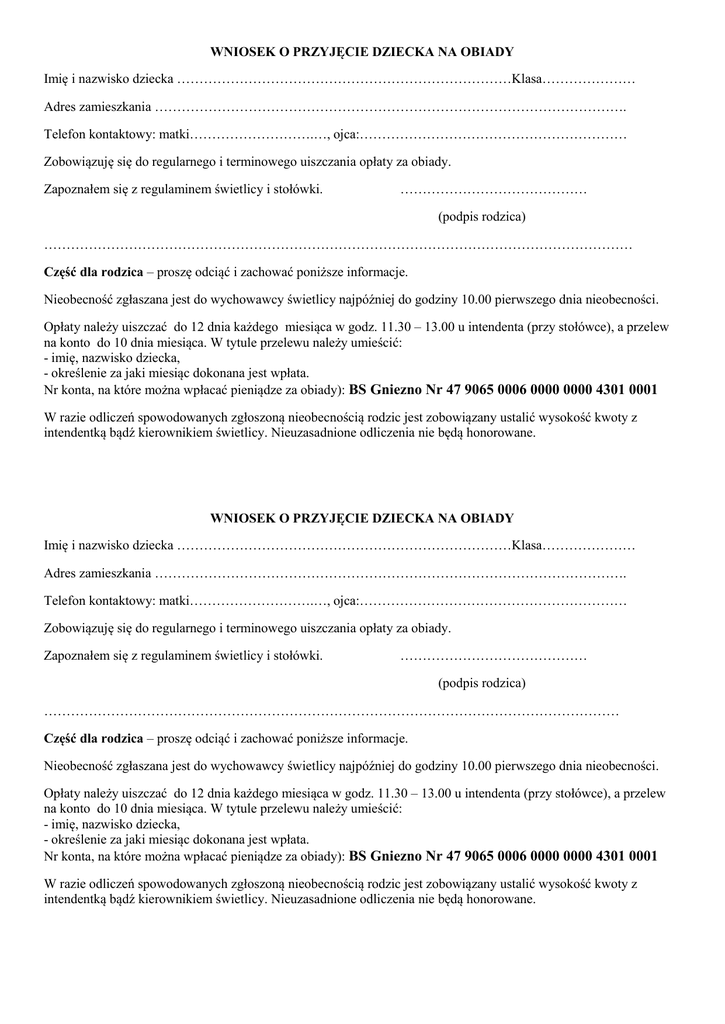 WNIOSEK O PRZYJĘCIE DZIECKA NA OBIADY Imię i nazwisko dziecka …………………………………………………………………Klasa………………… Adres zamieszkania ……………………………………………………………………………………………. Telefon kontaktowy: matki……………………….…, ojca:…………………………………………………… Zobowiązuję się do regularnego i terminowego uiszczania opłaty za obiady. Zapoznałem się z regulaminem świetlicy i stołówki. …………………………………… (podpis rodzica) …………………………………………………………………………………………………………………… Część dla rodzica – proszę odciąć i zachować poniższe informacje. Nieobecność zgłaszana jest do wychowawcy świetlicy najpóźniej do godziny 10.00 pierwszego dnia nieobecności. Opłaty należy uiszczać do 12 dnia każdego miesiąca w godz. 11.30 – 13.00 u intendenta (przy stołówce), a przelew na konto do 10 dnia miesiąca. W tytule przelewu należy umieścić: - imię, nazwisko dziecka, - określenie za jaki miesiąc dokonana jest wpłata. Nr konta, na które można wpłacać pieniądze za obiady): BS Gniezno Nr 47 9065 0006 0000 0000 4301 0001 W razie odliczeń spowodowanych zgłoszoną nieobecnością rodzic jest zobowiązany ustalić wysokość kwoty z intendentką bądź kierownikiem świetlicy. Nieuzasadnione odliczenia nie będą honorowane. WNIOSEK O PRZYJĘCIE DZIECKA NA OBIADY Imię i nazwisko dziecka …………………………………………………………………Klasa………………… Adres zamieszkania ……………………………………………………………………………………………. Telefon kontaktowy: matki……………………….…, ojca:…………………………………………………… Zobowiązuję się do regularnego i terminowego uiszczania opłaty za obiady. Zapoznałem się z regulaminem świetlicy i stołówki. …………………………………… (podpis rodzica) ………………………………………………………………………………………………………………… Część dla rodzica – proszę odciąć i zachować poniższe informacje. Nieobecność zgłaszana jest do wychowawcy świetlicy najpóźniej do godziny 10.00 pierwszego dnia nieobecności. Opłaty należy uiszczać do 12 dnia każdego miesiąca w godz. 11.30 – 13.00 u intendenta (przy stołówce), a przelew na konto do 10 dnia miesiąca. W tytule przelewu należy umieścić: - imię, nazwisko dziecka, - określenie za jaki miesiąc dokonana jest wpłata. Nr konta, na które można wpłacać pieniądze za obiady): BS Gniezno Nr 47 9065 0006 0000 0000 4301 0001 W razie odliczeń spowodowanych zgłoszoną nieobecnością rodzic jest zobowiązany ustalić wysokość kwoty z intendentką bądź kierownikiem świetlicy. Nieuzasadnione odliczenia nie będą honorowane.