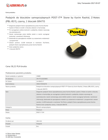 Góry Tarnowskie 2017-03-07 Karta produktu: Podajnik do bloczków samoprzylepnych POST-IT® Stone by Karim Rashid, Z-Notes (PBL-B1Y), czarny, 1 bloczek GRATIS Elegancki podajnik Stone zaprojektowany przez Karima Rashid System Z-Notes to kartki w bloczku złożone w harmonijkę Po wyciągnięciu jednej karteczki z podajnika, kolejne wysuwają się automatycznie Nawet rozmawiając przez telefon jesteś w stanie wyciągnąć karteczkę i zanotować informację Doskonałe do sporządzania notatek czy zostawiania wiadomości i przypomnień Zestaw zawiera: 1x100 karteczek w rozmiarze 76x76mm, podajnik Stone zaprojektowany przez Karima Rashid Kolor podajnika czarny 1 bloczek GRATIS Cena 58,22 PLN brutto Podstawowe parametry produktu Numer produktu w systemie 19889 Nr dostawcy 3M-FT510283805 Nr Celcen 14-00425-7 Kod kreskowy 4046719501878 Nazwa produktu Podajnik do bloczków samoprzylepnych POST-IT® Stone by Karim Rashid, Z-Notes (PBL-B1Y), czarny, 1 bloczek GRATIS Opis Elegancki podajnik Stone zaprojektowany przez Karima Rashid; system Z-Notes to kartki w bloczku złożone w harmonijkę; po wyciągnięciu jednej karteczki z podajnika, kolejne wysuwają się automatycznie; nawet rozmawiając przez telefon jesteś w stanie wyciągnąć karteczkę i zanotować informację; doskonałe do sporządzania notatek czy zostawiania wiadomości i przypomnień; zestaw zawiera: 1x100 karteczek w rozmiarze 76x76mm, podajnik Stone zaprojektowany przez Karima Rashid; kolor podajnika czarny; 1 bloczek GRATIS Kategoria Bloczki samoprzylepne Klasa Premium Marka POST-IT-3M Cecha W ofercie od 2014-02 Produkt Podajnik Kształt B.d. A-Z Biuro Adam Watoła ul. Oświęcimska 3 41-600 Góry Tarnowskie Góry Tarnowskie 2017-03-07 Karta katalogowa produktu cd. Podajnik do bloczków samoprzylepnych POST-IT® Stone by Karim Rashid, Z-Notes (PBL-B1Y), czarny, 1 bloczek GRATIS Rodzaj B.d. Ekologiczność B.d. Typ Standard Materiał Papier Wymiary Pojemność (mm) B.d. Rozmiar B.d. Szerokość (mm) B.d. Grubość (mm) B.d. Gramatura (g/m2) B.d. Wymiary (mm) 76x76 Wspólny słownik zamówień CPV 22816300-6 Bloczki samoprzylepnych karteczek na notatki Certyfikaty Nowy produkt w ofercie Standard Hit Standard Kolor Kolor Czarny Ilość Ilość kartek Pozostałe zdjęcia produktu Serdecznie zapraszamy do współpracy A-Z Biuro Adam Watoła zespół. A-Z Biuro Adam Watoła ul. Oświęcimska 3 41-600 Góry Tarnowskie 100