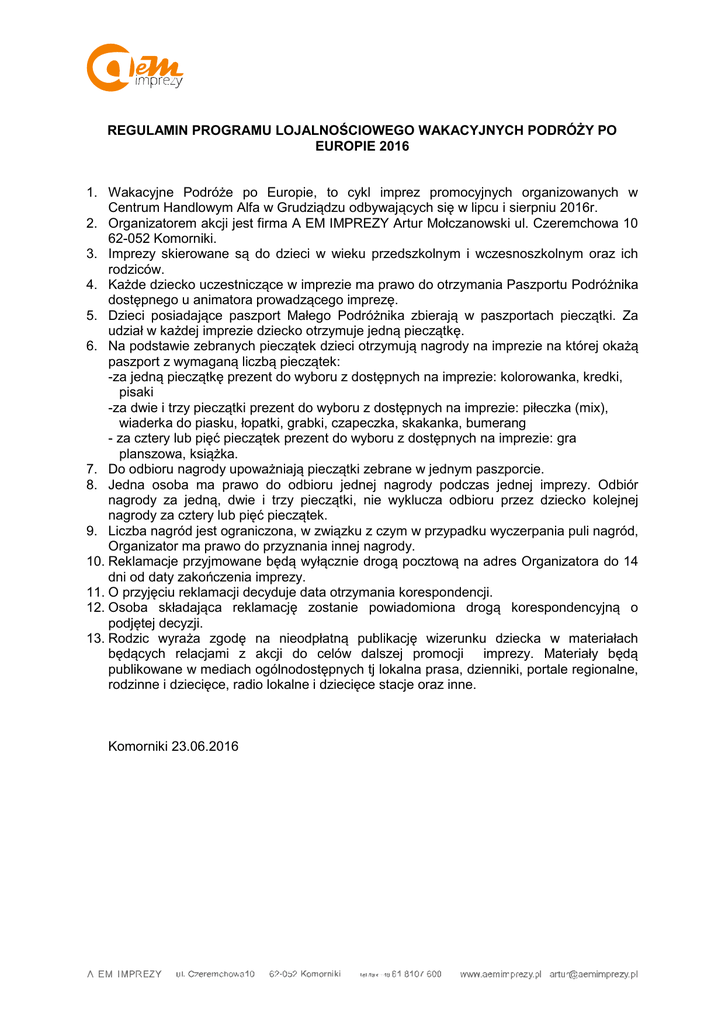 REGULAMIN PROGRAMU LOJALNOŚCIOWEGO WAKACYJNYCH PODRÓŻY PO EUROPIE 2016 1. Wakacyjne Podróże po Europie, to cykl imprez promocyjnych organizowanych w Centrum Handlowym Alfa w Grudziądzu odbywających się w lipcu i sierpniu 2016r. 2. Organizatorem akcji jest firma A EM IMPREZY Artur Mołczanowski ul. Czeremchowa 10 62-052 Komorniki. 3. Imprezy skierowane są do dzieci w wieku przedszkolnym i wczesnoszkolnym oraz ich rodziców. 4. Każde dziecko uczestniczące w imprezie ma prawo do otrzymania Paszportu Podróżnika dostępnego u animatora prowadzącego imprezę. 5. Dzieci posiadające paszport Małego Podróżnika zbierają w paszportach pieczątki. Za udział w każdej imprezie dziecko otrzymuje jedną pieczątkę. 6. Na podstawie zebranych pieczątek dzieci otrzymują nagrody na imprezie na której okażą paszport z wymaganą liczbą pieczątek: -za jedną pieczątkę prezent do wyboru z dostępnych na imprezie: kolorowanka, kredki, pisaki -za dwie i trzy pieczątki prezent do wyboru z dostępnych na imprezie: piłeczka (mix), wiaderka do piasku, łopatki, grabki, czapeczka, skakanka, bumerang - za cztery lub pięć pieczątek prezent do wyboru z dostępnych na imprezie: gra planszowa, książka. 7. Do odbioru nagrody upoważniają pieczątki zebrane w jednym paszporcie. 8. Jedna osoba ma prawo do odbioru jednej nagrody podczas jednej imprezy. Odbiór nagrody za jedną, dwie i trzy pieczątki, nie wyklucza odbioru przez dziecko kolejnej nagrody za cztery lub pięć pieczątek. 9. Liczba nagród jest ograniczona, w związku z czym w przypadku wyczerpania puli nagród, Organizator ma prawo do przyznania innej nagrody. 10. Reklamacje przyjmowane będą wyłącznie drogą pocztową na adres Organizatora do 14 dni od daty zakończenia imprezy. 11. O przyjęciu reklamacji decyduje data otrzymania korespondencji. 12. Osoba składająca reklamację zostanie powiadomiona drogą korespondencyjną o podjętej decyzji. 13. Rodzic wyraża zgodę na nieodpłatną publikację wizerunku dziecka w materiałach będących relacjami z akcji do celów dalszej promocji imprezy. Materiały będą publikowane w mediach ogólnodostępnych tj lokalna prasa, dzienniki, portale regionalne, rodzinne i dziecięce, radio lokalne i dziecięce stacje oraz inne. Komorniki 23.06.2016