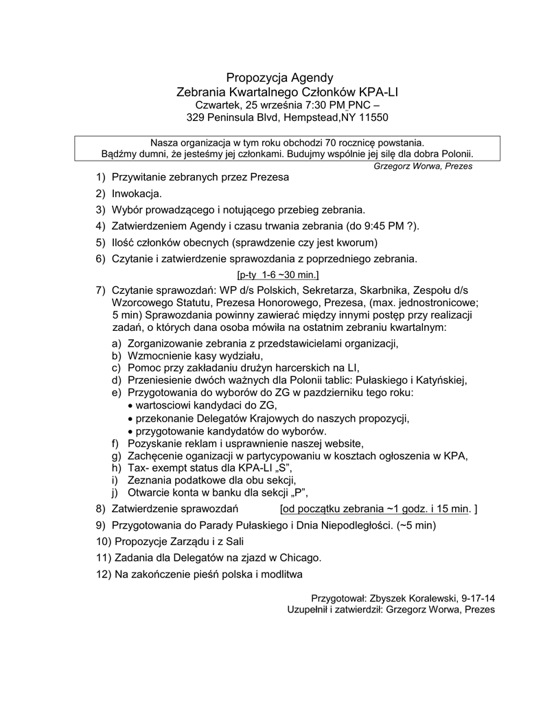 Propozycja Agendy Zebrania Kwartalnego Członków KPA-LI Czwartek, 25 września 7:30 PM PNC – 329 Peninsula Blvd, Hempstead,NY 11550 Nasza organizacja w tym roku obchodzi 70 rocznicę powstania. Bądźmy dumni, że jesteśmy jej członkami. Budujmy wspólnie jej silę dla dobra Polonii. Grzegorz Worwa, Prezes 1) Przywitanie zebranych przez Prezesa 2) Inwokacja. 3) Wybór prowadzącego i notującego przebieg zebrania. 4) Zatwierdzeniem Agendy i czasu trwania zebrania (do 9:45 PM ?). 5) Ilość członków obecnych (sprawdzenie czy jest kworum) 6) Czytanie i zatwierdzenie sprawozdania z poprzedniego zebrania. [p-ty 1-6 ~30 min.] 7) Czytanie sprawozdań: WP d/s Polskich, Sekretarza, Skarbnika, Zespołu d/s Wzorcowego Statutu, Prezesa Honorowego, Prezesa, (max. jednostronicowe; 5 min) Sprawozdania powinny zawierać między innymi postęp przy realizacji zadań, o których dana osoba mówiła na ostatnim zebraniu kwartalnym: a) b) c) d) e) f) g) h) i) j) Zorganizowanie zebrania z przedstawicielami organizacji, Wzmocnienie kasy wydziału, Pomoc przy zakładaniu drużyn harcerskich na LI, Przeniesienie dwóch ważnych dla Polonii tablic: Pułaskiego i Katyńskiej, Przygotowania do wyborów do ZG w pazdzierniku tego roku: wartosciowi kandydaci do ZG, przekonanie Delegatów Krajowych do naszych propozycji, przygotowanie kandydatów do wyborów. Pozyskanie reklam i usprawnienie naszej website, Zachęcenie oganizacji w partycypowaniu w kosztach ogłoszenia w KPA, Tax- exempt status dla KPA-LI „S”, Zeznania podatkowe dla obu sekcji, Otwarcie konta w banku dla sekcji „P”, 8) Zatwierdzenie sprawozdań [od początku zebrania ~1 godz. i 15 min. ] 9) Przygotowania do Parady Pułaskiego i Dnia Niepodległości. (~5 min) 10) Propozycje Zarządu i z Sali 11) Zadania dla Delegatów na zjazd w Chicago. 12) Na zakończenie pieśń polska i modlitwa Przygotował: Zbyszek Koralewski, 9-17-14 Uzupełnił i zatwierdził: Grzegorz Worwa, Prezes