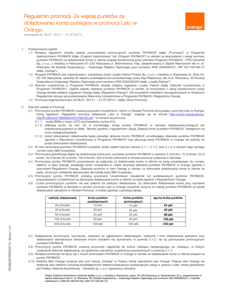 Regulamin promocji promocji 2x więcej punktów za doładowanie konta punktami w promocji Lato w Orange. Orange. obowiązuje od 08.07. 2013 r. - 21.07.2013 r. 1. Postanowienia ogólne 1.1. Niniejszy regulamin określa zasady przyznawania promocyjnych punktów PAYBACK (dalej „Promocja”) w Programie lojalnościowym PAYBACK (dalej „Program lojalnościowy” lub „Program PAYBACK”) w zamian za skorzystanie z usługi wymiany punktów PAYBACK na doładowanie konta w ofercie prepaid świadczonej przez partnera Programu PAYBACK – PTK Centertel Sp. z o.o., z siedzibą w Warszawie (01-230 Warszawa ul. Skierniewicka 10a), zarejestrowaną w Sądzie Rejonowym dla m. st. Warszawy XII Wydział Gospodarczy – Krajowego Rejestru Sądowego pod numerem KRS 0000006107, NIP 527-020-68-72 (dalej „Orange”). 1.2. Program PAYBACK jest organizowany i zarządzany przez Loyalty Partner Polska Sp. z o.o, z siedzibą w Warszawie (ul. Złota 59, 00-105 Warszawa), wpisaną do rejestru przedsiębiorców prowadzonego przez Sąd Rejestrowy dla m.st. Warszawy, XII Wydział Gospodarczy Krajowego Rejestru Sądowego pod numerem KRS 0000290350 (dalej „Loyalty Partner”). 1.3. Warunki uczestnictwa w Programie PAYBACK określa odrębny regulamin Loyalty Partner (dalej „Warunki Uczestnictwa w Programie PAYBACK”). Ogólne zasady zbierania punktów PAYBACK w zamian za korzystanie z usług świadczonych przez Orange określa odrębny regulamin Orange (dalej „Regulamin Orange”). We wszystkich kwestiach nieuregulowanych w niniejszym Regulaminie stosuje się postanowienia Warunków Uczestnictwa w Programie PAYBACK i Regulaminu Orange. 1.4. Promocja organizowana jest od 08.07. 2013 r. – 21.07.2013 r. (dalej: Okres Promocji) 2. Warunki udziału w Promocji 2.1. Promocyjne punkty PAYBACK zostaną przyznane Uczestnikom, którzy w Okresie Promocji skorzystają z promocji Lato w Orange, której regulamin „Regulamin promocji doładowań Lato w Orange” znajduje się na stronie http://www.orange.pl/ocphttp/PL/Binary2/1989828/4075168765.pdf i w ramach tej promocji 2.1.1. wyślą SMSa o treści LATO pod bezpłatny numer 815, 2.1.2. doładują konto na min. 25 zł wymieniając swoje punkty PAYBACK w serwisie doladowania.orange.pl lub doladowania.payback.pl (dalej: Serwis) zgodnie z regulaminem usługi „Doładuj konto punktami PAYBACK” dostępnym na www.orange.pl/payback, 2.1.3. przed dokonaniem doładowania będą posiadać aktywne Konto PAYBACK umożliwiające zbieranie punktów PAYBACK zgodnie z Warunkami Uczestnictwa w Programie PAYBACK oraz aktywują kartę PAYBACK w Orange nie później niż przed dokonaniem doładowania. 2.2. W celu otrzymania punktów PAYBACK Uczestnik winien spełnić łącznie warunki 2.1.1, 2.1.2, oraz 2.1.3 w ramach tego samego numeru karty SIM Uczestnika. 2.3. Promocyjną gratyfikacją objęte są doładowania konta przy wymianie punktów PAYBACK o wartości 5 zł brutto, 10 zł brutto, 25 zł brutto, 40 zł brutto 50 zł brutto, 100 zł brutto, 200 zł brutto dokonane w okresie promocji wyłącznie w Serwisie. 2.4. Promocyjne punkty PAYBACK przyznawane są wyłącznie za doładowanie konta w ofercie na kartę przypisanego do numeru telefonu w sieci Orange, podanego przez Uczestnika w czasie aktywacji zbierania punktów PAYBACK w Orange zgodnie z warunkami Regulaminu Orange. Zbieranie punktów w sieci Orange w zamian za dokonanie doładowania konta w ofercie na kartę winno być oddzielnie aktywowane dla każdej karty SIM Uczestnika. 2.5. Promocyjne punkty PAYBACK zostaną przyznane Uczestnikowi niezależnie od podstawowych punktów PAYBACK, przyznawanych Uczestnikowi za dokonanie doładowania konta w ofercie na kartę zgodnie z Regulaminem Orange. 2.6. Liczba promocyjnych punktów nie jest zależna od wartości doładowania. Za dokonanie doładowania konta przy wymianie punktów PAYBACK w Serwisie w ramach promocji Lato w Orange Uczestnik otrzyma 2x więcej punktów PAYBACK za każde doładowanie zakupione w Okresie Promocji, w liczbie zgodnej z poniższą tabelą. PAYBACK/PDF03/0713 Strona 1 z 2 wartość doładowania liczba punktów promocyjnych 12 pkt łączna liczba punktów 25 zł brutto liczba punktów podstawowych 12 pkt 40 zł brutto 20 pkt 20 pkt 40 pkt 50 zł brutto 25 pkt 25 pkt 50 pkt 24 pkt 100 zł brutto 50 pkt 50 pkt 100 pkt 200 zł brutto 100 pkt 100 pkt 200 pkt 2.7. Doładowania promocyjne, bonusowe, związane ze zgłoszonymi reklamacjami, cykliczne i inne doładowania specjalne oraz doładowania standardowe dokonane innymi kanałami niż wymieniony w punkcie 2.1.2. nie są premiowane promocyjnymi punktami PAYBACK. 2.8. Promocyjne punkty PAYBACK zostaną przyznane najpóźniej do końca miesiąca następującego po miesiącu, w którym użytkownik dokonał doładowania, po spełnieniu warunków uczestnictwa wymienionych w punkcie 2.1.4. 2.9. Niniejsza promocja nie łączy się z innymi promocjami PAYBACK w Orange w zamian za doładowanie konta w ofercie prepaid za punkty PAYBACK. 2.10. Mobilna Sieć Orange oznacza sieć pod nazwą „Orange” w Polsce, której operatorem jest Orange. Pojęcie sieci Orange nie obejmuje sieci telefonii ruchomej przedsiębiorców telekomunikacyjnych świadczących usługi w oparciu o sieć, której operatorem jest Polska Telefonia Komórkowa - Centertel sp. z o.o. (operatorzy wirtualni). Polska Telefonia Komórkowa Centertel Spółka z o.o. z siedzibą w Warszawie, adres: 01-230 Warszawa ul. Skierniewicka 10 a, zarejestrowana w Sądzie Rejonowym dla m. st. Warszawy XII Wydział Gospodarczy – Krajowego Rejestru Sądowego pod numerem KRS 0000006107, o kapitale zakładowym 2.690.501.964,00 PLN, (NIP 527-020-68-72) Przyznanie punktów PAYBACK 3.1. Promocyjne punkty PAYBACK mogą być przyznane wyłącznie osobom fizycznym, które zawarły z Orange umowę o świadczenie usług telekomunikacyjnych w celu bezpośrednio niezwiązanym z prowadzoną działalnością gospodarczą. 4. Postanowienia końcowe 4.1. Wszelkie reklamacje związane z 