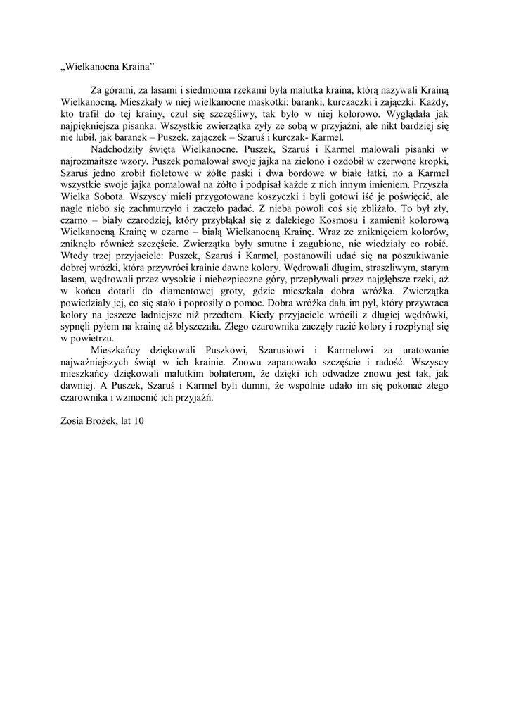 „Wielkanocna Kraina” Za górami, za lasami i siedmioma rzekami była malutka kraina, którą nazywali Krainą Wielkanocną. Mieszkały w niej wielkanocne maskotki: baranki, kurczaczki i zajączki. Każdy, kto trafił do tej krainy, czuł się szczęśliwy, tak było w niej kolorowo. Wyglądała jak najpiękniejsza pisanka. Wszystkie zwierzątka żyły ze sobą w przyjaźni, ale nikt bardziej się nie lubił, jak baranek – Puszek, zajączek – Szaruś i kurczak- Karmel. Nadchodziły święta Wielkanocne. Puszek, Szaruś i Karmel malowali pisanki w najrozmaitsze wzory. Puszek pomalował swoje jajka na zielono i ozdobił w czerwone kropki, Szaruś jedno zrobił fioletowe w żółte paski i dwa bordowe w białe łatki, no a Karmel wszystkie swoje jajka pomalował na żółto i podpisał każde z nich innym imieniem. Przyszła Wielka Sobota. Wszyscy mieli przygotowane koszyczki i byli gotowi iść je poświęcić, ale nagle niebo się zachmurzyło i zaczęło padać. Z nieba powoli coś się zbliżało. To był zły, czarno – biały czarodziej, który przybłąkał się z dalekiego Kosmosu i zamienił kolorową Wielkanocną Krainę w czarno – białą Wielkanocną Krainę. Wraz ze zniknięciem kolorów, zniknęło również szczęście. Zwierzątka były smutne i zagubione, nie wiedziały co robić. Wtedy trzej przyjaciele: Puszek, Szaruś i Karmel, postanowili udać się na poszukiwanie dobrej wróżki, która przywróci krainie dawne kolory. Wędrowali długim, straszliwym, starym lasem, wędrowali przez wysokie i niebezpieczne góry, przepływali przez najgłębsze rzeki, aż w końcu dotarli do diamentowej groty, gdzie mieszkała dobra wróżka. Zwierzątka powiedziały jej, co się stało i poprosiły o pomoc. Dobra wróżka dała im pył, który przywraca kolory na jeszcze ładniejsze niż przedtem. Kiedy przyjaciele wrócili z długiej wędrówki, sypnęli pyłem na krainę aż błyszczała. Złego czarownika zaczęły razić kolory i rozpłynął się w powietrzu. Mieszkańcy dziękowali Puszkowi, Szarusiowi i Karmelowi za uratowanie najważniejszych świąt w ich krainie. Znowu zapanowało szczęście i radość. Wszyscy mieszkańcy dziękowali malutkim bohaterom, że dzięki ich odwadze znowu jest tak, jak dawniej. A Puszek, Szaruś i Karmel byli dumni, że wspólnie udało im się pokonać złego czarownika i wzmocnić ich przyjaźń. Zosia Brożek, lat 10