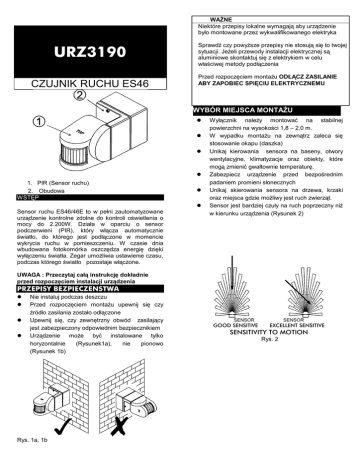 WAśNE Niektóre przepisy lokalne wymagają aby urządzenie było montowane przez wykwalifikowanego elektryka URZ3190 8 CZUJNIK RUCHU ES46 Sprawdź czy powyŜsze przepisy nie stosują się to twojej sytuacji. JeŜeli przewody instalacji elektrycznej są aluminiowe skontaktuj się z elektrykiem w celu właściwej metody podłączenia Przed rozpoczęciem montaŜu ODŁĄCZ ZASILANIE ABY ZAPOBIEC SPIĘCIU ELEKTRYCZNEMU WYBÓR MIEJSCA MONTAśU 1. PIR (Sensor ruchu) 2. Obudowa WSTĘP Sensor ruchu ES46/46E to w pełni zautomatyzowane urządzenie kontrolne zdolne do kontroli oświetlenia o mocy do 2.200W. Działa w oparciu o sensor podczerwieni (PIR), który włącza automatycznie światło, do którego jest podłączone w momencie wykrycia ruchu w pomieszczeniu. W czasie dnia wbudowana fotokomórka oszczędza energię dzięki wyłączeniu światła. Zegar umoŜliwia ustawienie czasu, podczas którego światło pozostaje włączone. Wyłącznik naleŜy montować na stabilnej powierzchni na wysokości 1,8 – 2,0 m. W wypadku montaŜu na zewnątrz zaleca się stosowanie okapu (daszka) Unikaj kierowania sensora na baseny, otwory wentylacyjne, klimatyzacje oraz obiekty, które mogą zmienić gwałtownie temperaturę. Zabezpiecz urządzenie przed bezpośrednim padaniem promieni słonecznych Unikaj skierowania sensora na drzewa, krzaki oraz miejsca gdzie moŜliwy jest ruch zwierząt. Sensor jest bardziej czuły na ruch poprzeczny niŜ w kierunku urządzenia (Rysunek 2) UWAGA : Przeczytaj całą instrukcję dokładnie przed rozpoczęciem instalacji urządzenia PRZEPISY BEZPIECZENSTWA Nie instaluj podczas deszczu Przed rozpoczęciem montaŜu upewnij się czy źródło zasilania zostało odłączone Upewnij się, czy zewnętrzny obwód zasilający jest zabezpieczony odpowiednim bezpiecznikiem Urządzenie moŜe być instalowane tylko horyzontalnie (Rysunek1a), nie pionowo (Rysunek 1b) Rys. 1a, 1b SENSOR GOOD SENSITIVE SENSOR EXCELLENT SENSITIVE SENSITIVITY TO MOTION Rys. 2 INSTALACJA PODŁĄCZENIE PRZEWODÓW ELEKTRYCZNYCH W celu ułatwienia montaŜu przygotuj wiertarkę oraz śrubokręt. Wybierz miejsce do zamontowania w oparciu o kąty pokrycia przedstawione na rysunku 3 Rysunek 3 (1) Wyłącz źródło zasilania lub wyłącznik ścienny (2) jeŜeli jest to konieczne przeprowadź trzy Ŝyłowy kabel od oświetlenia do skrzynki podłączeniowej. Przewody muszą być odpowiednie do obciąŜenia. (3) Ściągnij izolację przewodów na długości około 68 mm. (4) Przed podłączeniem przeciągnij przewody przez otwór z uszczelką. Uwaga: przewód zasilający musi odpowiadać wymogom H05RN-F, 1,0mm² (5) Podłącz przewody: dla typu I/II (ES46): Podłącz przewód brązowy zasilania (prądowy) do przyłącza oznaczonego „↑” Podłącz przewód niebieski zasilania do przyłącza oznaczonego „N” (neutral) Podłącz przewód brązowy lampy do przyłącza oznaczonego "↓" Podłącz przewód niebieski lampy do przyłącza oznaczonego „N” (Rysunek 6,7) Zainstaluj zewnętrzny wyłącznik ścienny w obwodzie źródła zasilania (Rysunek 4,5). UmoŜliwi ci to łatwe obsługiwanie. Dalsze informacje – patrz OBSŁUGIWANIE Typ I/II (ES46) Typ I (ES46) Rysunek 6 dla typu III (ES46E): Rysunek 4 Typ III (ES46E) Rysunek 5 Rysunek 8 Typ II (ES46) Rysunek 7 Podłącz przewód brązowy zasilania (prądowy) do przyłącza oznaczonym „↑” Podłącz przewód niebieski zasilania do przyłącza oznaczonego „N” (neutral) Podłącz przewód brązowy lampy do przyłącza oznaczonego "↓" Podłącz przewód niebieski lampy do przyłącza oznaczonego „N” . Podłącz przewód zielono/ Ŝółty zarówno przewodu zasilającego jak i lampy do przyłącza oznaczonego Uwaga: 4 biegunowy blok przyłączy posiada otwór oznaczony znakiem uziemienia słuŜący do podłączenia zielono/ Ŝółtych przewodów zewnętrznych klasy I reflektora jak tez zewnętrznego źródła zasilania Klasa I reflektorów odnosi się do produktów wymagających uziemienia USTAWIENIE SYSTEMU OŚWIETLENIA (1) TRYB TESTOWANIA Obróć gałki czasu (TIME) oraz oświetlenia (LITE) do oporu w lewo. - pozycja testowania (Rysunek 9) przekręcić gałką czasu (TIME) zgodnie z ruchem wskazówki zegara, zmniejszania w kierunku przeciwnym (min 5 sek.) (Rysunek 10) Rysunek 10 (3) USTAWIENIE OŚWIETLENIA Określa przy jakim oświetleniu zostanie włączone oświetlenie, jeŜeli sensor zostanie ustawiony w połoŜeniu AUTO Wstępnie przekręć gałkę kontrolną oświetlenia (LITE) do końca w kierunku ruchu wskazówek zegara (księŜyc – Rysunek 11). W tej pozycji sensor ruchu pozostaje nieaktywny w ciągu dnia. O zmierzchu jeŜeli uznasz, Ŝe wymagane jest włączenie oświetlenie naleŜy po prostu przekręcić gałkę do pozycji, której urządzenie zostanie włączone gdy zacznie się ściemniać. Rysunek 11 Rysunek 9 Włącz zewnętrzny wyłącznik ścienny Światło zostanie włączone na około 1 min. w celu nagrzania się urządzenia. Następnie się wyłączy Przespaceruj się przez pomieszczenie. Światło włączy się gdy zostanie wykryty ruch oraz wyłączy kiedy ruch zaniknie. Odczekaj, aŜ światło się wyłączy zanim ponownie się poruszysz w celu sprawdzenia sensora. Ustaw sensor tak aby swoim działaniem obejmował planowany obszar. BliŜsza odległość – sensor do dołu, dalsza – do góry. (2) USTAWIENIE CZASU Pozwala kontrolować jak długo światło pozostanie włączone po wykryciu ruchu. W celu zwiększania czasu (max 12 minut) naleŜy UśYTKOWANIE UŜywając wyłącznika ściennego moŜna w prosty sposób włączyć automatyczny tryb pracy Włącz wyłącznik ścienny. W momencie wykrycia ruchu przez sensor światło zostanie zapalone automatycznie. Wbudowana fotokomórka wyłączy lub włączy sensor zgodnie z ustawionym przez nas poziomem oświetlenia MOśLIWE PROBLEMY I ICH USUWANIE Światło się nie włącza Sprawdź czy dobrze podłączono urządzenie Sprawdź czy nie została przepalona Ŝarówka Światło poz