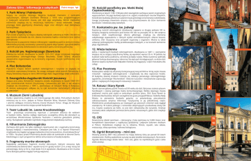 Zielona Góra – informacje o zabytkach Patrz mapa 1. Park Winny i Palmiarnia Stojący na szczycie Winnego Wzgórza budynek Palmiarni z centralnie usytuowanym, dawnym Domkiem Winiarza z 1818 roku przypominającym o tradycjach winiarskich miasta, jest dziś jego wizytówką. Wśród tropikalnej roślinności znajdują się tu: restauracja, kawiarnia i tarasy widokowe. Uwagę przyciąga także gigantyczny drewniany zegar oraz olbrzymi okaz daktylowca kanaryjskiego. 2. Park Tysiąclecia Park został urządzony na miejscu dawnej nekropolii, założonej w 1628 r. Do dziś na jego terenie zachowała się min. dawna murowana kaplica cmentarna oraz tablica pamiątkowa. Obecnie jest to popularne miejsce rekreacyjne i największy park w centrum miasta. Miłośników przyrody zaciekawią z pewnością piękne aleje lipowe i cypryśniki błotne - pomniki przyrody zlokalizowane na obrzeżach parku od strony północnej. 3. Kościół pw. Najświętszego Zbawiciela Eklektyczny kościół zbudowano w latach 1915-1917 dzięki inicjatywie bogatego przemysłowca zielonogórskiego Georga Beuchelta. Dzięki dobrej akustyce okazjonalnie organizowane są tu koncerty organowe, muzyki symfonicznej oraz chóralnej. 4. Plac Bohaterów Popularne miejsce letnich spotkań zielonogórzan i turystów ze względu na centralnie usytuowaną fontannę. Na uwagę zasługuje także pomnik Bohaterów II Wojny Światowej stojący w cieniu 300 letniego dębu węgierskiego (Dąb Lubuszan). 5. Ewangelicko-Augsburski Kościół Jezusowy Stojąca przy placu Bohaterów świątynia została zbudowana w latach 1909-1911 jako staroluterański Kościół Chrystusowy. Ciekawostką jest fakt, iż we wnętrzu znajduje się chrzcielnica z 1844 r., pochodząca ze świątyni Wang w Karpaczu. W okresie wakacyjnym odbywa się tu cykl koncertów kameralnych „Wieczory u Luteranów”. 6. Muzeum Ziemi Lubuskiej Każdy z pewnością znajdzie tu coś interesującego dla siebie. Pod jednym dachem mieszczą się tu m.in.: jedyne w Polsce Muzeum Wina, Muzeum Zielonej Góry i wiernie oddające mroczną historię miasta Muzeum Tortur. Drogę do Muzeum wskazuje prasa winiarska stojąca przed budynkiem. 7. Teatr Lubuski im. Leona Kruczkowskiego Teatr prezentuje urozmaicony repertuar z zamiarem dotarcia do widowni w każdym wieku. Oprócz stałego repertuaru szczególną ofertą dla dorosłych są wrześniowe Winobraniowe Spotkania Teatralne z wieloma gwiazdami polskiej sceny. Na bajkowe spektakle najmłodsi mogą dotrzeć deptakową ciuchcią. 8. Filharmonia Zielonogórska Zachwyca dziś gości nie tylko ciekawym repertuarem ale i oryginalną konstrukcją łączącą tradycję z nowoczesnością. Ciekawym jest fakt, iż w rejonie Filharmonii znajdowała się niegdyś synagoga żydowska zniszczona podczas „Kryształowej Nocy” w 1938 r. Na placu przed Filharmonią doszło także do zamieszek w obronie Domu Katolickiego o czym przypomina tablica wmurowana w fasadę budynku. 9. Fragmenty murów obronnych Największy zachowany fragment murów obronnych, którymi otoczona była średniowieczna Zielona Góra - wysoki na 4,2 m i gruby na 0,8-1,2 m, a więc niższy od pierwotnego, który w XV w. miał około 5-6 m wysokości. Zbudowana w linii murów Kuria Biskupia pełniła niegdyś funkcję więzienia. 10. Kościół parafialny pw. Matki Bożej Częstochowskiej Wzniesiony w latach 1746-1748 jako zbór ewangelicki zachwyca swoim oryginalnym wyposażeniem. Do jego budowy użyto m.in. cegieł z rozebranych murów miejskich. Kościół jest budowlą założoną na planie krzyża greckiego w konstrukcji szkieletowej. Uwagę przykuwają drewniane empory oraz przymocowane do ścian kamienne barokowe i rokokowe płyty epitafijne. 11 11. Konkatedra pw. św. Jadwigi Najstarszy kościół zielonogórski zbudowany zapewne w drugiej połowie XIII w. Gotycką świątynię wzniesiono pod koniec XIV lub na początku XV w. We wnętrzu świątyni, obok współczesnego ołtarza głównego, znajdują się elementy zabytkowego wyposażenia z różnych stylów architektonicznych: ołtarze boczne, ambona, chór muzyczny oraz prospekt organowy z organami. Można tu także zobaczyć późnogotyckie rzeźby przedstawiające świętych, a na ścianach kamienne płyty nagrobkowe. 1 12. Wieża łazienna Jedna z najstarszych budowli zielonogórskich, zbudowana w 1487 r. i pierwotnie wiążąca się ze stojącą tutaj Bramą Nową. Jej wysokość wynosi 35 m. W pobliżu tej budowli stała łaźnia publiczna, od której przejęła nazwę. Wieża Łazienna spełniała głównie funkcję obserwacyjną i obronną. Na wyższych kondygnacjach, na które dziś dzielnie wspina się Bachusik Odpadek mieściły się magazyny i część mieszkalna dla załogi. 13. Plac Pocztowy Nazwa placu wzięła się od poczty funkcjonującej tutaj od XVIII w. W tej części miasta mieszkali najbogatsi zielonogórzanie i znajdowały się dwa najstarsze hotele. W budynku dawnej drukarni mieściła się redakcja pierwszego zielonogórskiego tygodnika „Grünberger Wochenblatt”. Obecnie turystów i mieszkańców zapraszają jedne z najlepszych miejscowych restauracji i kawiarni. 14. Ratusz i Stary Rynek Rynek stanowi główny punkt miasta od XIII wieku do dziś. Był przez stulecia placem handlowym i częścią ważnego traktu komunikacyjnego. Relikty dawnego miasta podziwiać można pod szybą w centralnym punkcie placu. Dziś Stary Rynek to królestwo Bachusików, którym szczególnie do gustu przypadł Ratusz. Siedziba Rady Miasta to pierwotnie budowla gotycka, co potwierdzają pieczołowicie odrestaurowane wnętrza Informacji Turystycznej w jej południowej części. Wielokrotnie przebudowywany po trawiących go pożarach zmieniał swój wygląd zewnętrzny. W trakcie jednego z remontów obejmujących przebudowę wieży (54 m.), krzywo osadzono jej hełm, co jest dziś ciekawostką dla turystów. Atrakcje stanowią także zabytkowe pomieszczenia piwnic ratuszowych, gdzie dziś znajduje się pub. 15. CRS No