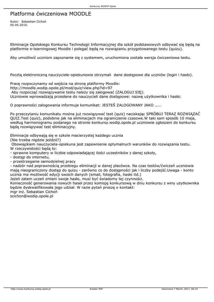 Konkursy WODIiP Opole Platforma ćwiczeniowa MOODLE Autor: Sebastian Cichoń 05.05.2010. Eliminacje Opolskiego Konkursu Technologii Informacyjnej dla szkół podstawowych odbywać się będą na platformie e-learningowej Moodle i polegać będą na rozwiązaniu przygotowanego testu (quizu). Aby umożliwić uczniom zapoznanie się z systemem, uruchomiona została wersja ćwiczeniowa testu. Pocztą elektroniczną nauczyciele-opiekunowie otrzymali dane dostępowe dla uczniów (login i hasło). Pracę rozpoczynamy od wejścia na stronę platformy Moodle: http://moodle.wodip.opole.pl/mod/quiz/view.php?id=97 Aby rozpocząć rozwiązywanie testu należy się zalogować (ZALOGUJ SIĘ): Uczniowie wprowadzają przesłane do nauczycieli dane dostępowe: nazwę użytkownika i hasło: O poprawności zalogowania informuje komunikat: JESTEŚ ZALOGOWANY JAKO ..... Po przeczytaniu komunikatu można już rozwiązywać test (quiz) naciskając SPRÓBUJ TERAZ ROZWIĄZAĆ QUIZ.Test (quiz), podobnie jak na eliminacjach ma ograniczenie czasowe.W taki sam sposób 10 maja, według harmonogramu podanego na stronie konkursy.wodip.opole.pl uczniowie zgłoszeni do konkursu będą rozwiązywać test eliminacyjny. Eliminacje odbywają się w szkole macierzystej każdego ucznia (Nie trzeba nigdzie jeździć!) Obowiązkiem nauczyciela-opiekuna jest zapewnienie optymalnych warunków do rozwiązania testu. W rzeczywistości będą to: - sprawne komputery w liczbie odpowiadającej ilości uczestników z danej szkoły, - dostęp do internetu, - przestrzeganie samodzielnej pracy - nadzór nad poprawnością przebiegu eliminacji w danej placówce. Na czas testów/ćwiczeń uczniowie mają nieograniczony dostęp do quizu - zarówno co do dostępności jak i liczby podejść.Uwaga - konto ucznia ma możliwość edycji swoich danych (email, fotografia, hasło itd.) Jeżeli zatem uczeń zmieni swoje hasło, musi być świadomy tej czynności. Konieczność generowania nowych haseł przez komisję konkursową w dniu konkursu z winy użytkownika będzie dyskwalifikowała jego udział. W razie pytań proszę o kontakt: mgr inż. Sebastian Cichoń [email protected] http://www.konkursy.wodip.opole.pl Kreator PDF Utworzono 7 March, 2017, 08:14