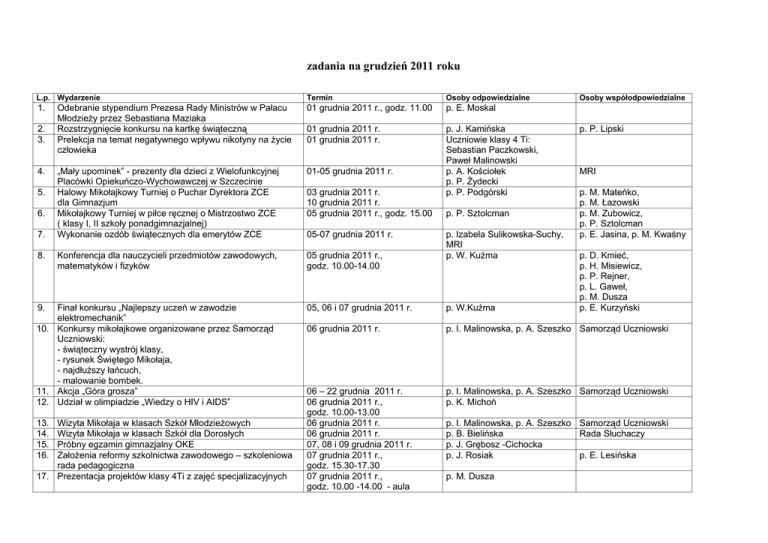 zadania na grudzień 2011 roku L.p. Wydarzenie Termin Osoby odpowiedzialne 1. 01 grudnia 2011 r., godz. 11.00 p. E. Moskal 01 grudnia 2011 r. 01 grudnia 2011 r. p. J. Kamińska Uczniowie klasy 4 Ti: Sebastian Paczkowski, Paweł Malinowski p. A. Kościołek p. P. Żydecki p. P. Podgórski 2. 3. 4. 5. 6. 7. 8. Odebranie stypendium Prezesa Rady Ministrów w Pałacu Młodzieży przez Sebastiana Maziaka Rozstrzygnięcie konkursu na kartkę świąteczną Prelekcja na temat negatywnego wpływu nikotyny na życie człowieka „Mały upominek” - prezenty dla dzieci z Wielofunkcyjnej Placówki Opiekuńczo-Wychowawczej w Szczecinie Halowy Mikołajkowy Turniej o Puchar Dyrektora ZCE dla Gimnazjum Mikołajkowy Turniej w piłce ręcznej o Mistrzostwo ZCE ( klasy I, II szkoły ponadgimnazjalnej) Wykonanie ozdób świątecznych dla emerytów ZCE 03 grudnia 2011 r. 10 grudnia 2011 r. 05 grudnia 2011 r., godz. 15.00 Konferencja dla nauczycieli przedmiotów zawodowych, matematyków i fizyków 05 grudnia 2011 r., godz. 10.00-14.00 9. Finał konkursu „Najlepszy uczeń w zawodzie elektromechanik” 10. Konkursy mikołajkowe organizowane przez Samorząd Uczniowski: - świąteczny wystrój klasy, - rysunek Świętego Mikołaja, - najdłuższy łańcuch, - malowanie bombek. 11. Akcja „Góra grosza” 12. Udział w olimpiadzie „Wiedzy o HIV i AIDS” 13. 14. 15. 16. Wizyta Mikołaja w klasach Szkół Młodzieżowych Wizyta Mikołaja w klasach Szkół dla Dorosłych Próbny egzamin gimnazjalny OKE Założenia reformy szkolnictwa zawodowego – szkoleniowa rada pedagogiczna 17. Prezentacja projektów klasy 4Ti z zajęć specjalizacyjnych 01-05 grudnia 2011 r. 05-07 grudnia 2011 r. p. P. Sztolcman p. Izabela Sulikowska-Suchy, MRI p. W. Kuźma Osoby współodpowiedzialne p. P. Lipski MRI p. M. Mateńko, p. M. Łazowski p. M. Zubowicz, p. P. Sztolcman p. E. Jasina, p. M. Kwaśny p. D. Kmieć, p. H. Misiewicz, p. P. Rejner, p. L. Gaweł, p. M. Dusza p. E. Kurzyński 05, 06 i 07 grudnia 2011 r. p. W.Kuźma 06 grudnia 2011 r. p. I. Malinowska, p. A. Szeszko Samorząd Uczniowski 06 – 22 grudnia 2011 r. 06 grudnia 2011 r., godz. 10.00-13.00 06 grudnia 2011 r. 06 grudnia 2011 r. 07, 08 i 09 grudnia 2011 r. 07 grudnia 2011 r., godz. 15.30-17.30 07 grudnia 2011 r., godz. 10.00 -14.00 - aula p. I. Malinowska, p. A. Szeszko Samorząd Uczniowski p. K. Michoń p. I. Malinowska, p. A. Szeszko Samorząd Uczniowski p. B. Bielińska Rada Słuchaczy p. J. Grębosz -Cichocka p. J. Rosiak p. E. Lesińska p. M. Dusza 18. Mikołajkowy turniej w tenisie stołowym – wszyscy uczniowie 19. 20. 21. 22. 23. 24. 25. 26. 27. 28. 29. 30. 31. 32. 33. Egzaminy semestralne w Szkołach dla Dorosłych Finał ogólnopolskiego projektu „Szlachetna Paczka” Próbny egzamin gimnazjalny z Operonem Finał turnieju tenisa stołowego o mistrzostwo internatu Międzyprzedmiotowy konkurs dla uczniów klas trzecich (wiedza o kulturze) Jasełka i spotkanie przedświąteczne w internacie. Rozstrzygnięcie konkursu na prezentację lub plakat o tematyce antynikotynowej Finał konkursu: Świąteczny wystrój pokoju Wystawienie ocen z zachowania i ocen klasyfikacyjnych. „Pozwólmy zwierzętom przetrwać zimę”- akcja na rzecz TPZ Klasowe spotkania wigilijne Spotkanie wigilijno – noworoczne uczniów i nauczycieli Spotkanie wigilijno – noworoczne pracowników i emerytów Spotkanie świąteczne słuchaczy i nauczycieli Złożenie sprawozdań z pracy komisji przedmiotowych, zespołów zadaniowych i problemowych, pedagoga 34. Złożenie semestralnych kart samooceny 35. Warsztat artystyczny - wieńce adwentowe 07 grudnia 2011 r., godz. 15.30 -17.30 08-20 grudnia 2011 r. 10-11 grudnia 2011 r. 14, 15, 16 grudnia 2011 r. 15 grudnia 2011 r. do 15 grudnia 2011 r. p. A. Ossowicz p. N. Zubowicz nauczyciele Wolontariusze p. J. Grębosz - Cichocka p. A. Kościołek p. J. Curyl 19 grudnia 2011 r. 20 grudnia 2011 r. p. E. Jasina, p A. Stępień p. I. Sulikowska-Suchy MRI MRI 20 grudnia 2011 r. do 22 grudnia 2011 r. grudzień 2011 r. 22 grudnia 2011 r. , godz. 11.00 p. B. Nowak-Krzywania wszyscy nauczyciele p. E. Janiszewicz p. E. Janiszewicz MRI 22 grudnia 2011 r., godz. 9.00 22 grudnia 2011 r., godz. 13.00 22 grudnia 2011 r., godz. 15.30 do 22 grudnia 2011 r. wychowawcy klas p. E. Janiszewicz nauczyciele, opiekunowie klas państwo odpowiedzialni do 22 grudnia 2011 r. do ustalenia wszyscy nauczyciele p. M. Kwaśny p. Z. Kowalski MRI p. B. Bielińska, p. H. Gut, p. K. Klejber, ks. T. Krzanicki wszyscy nauczyciele
