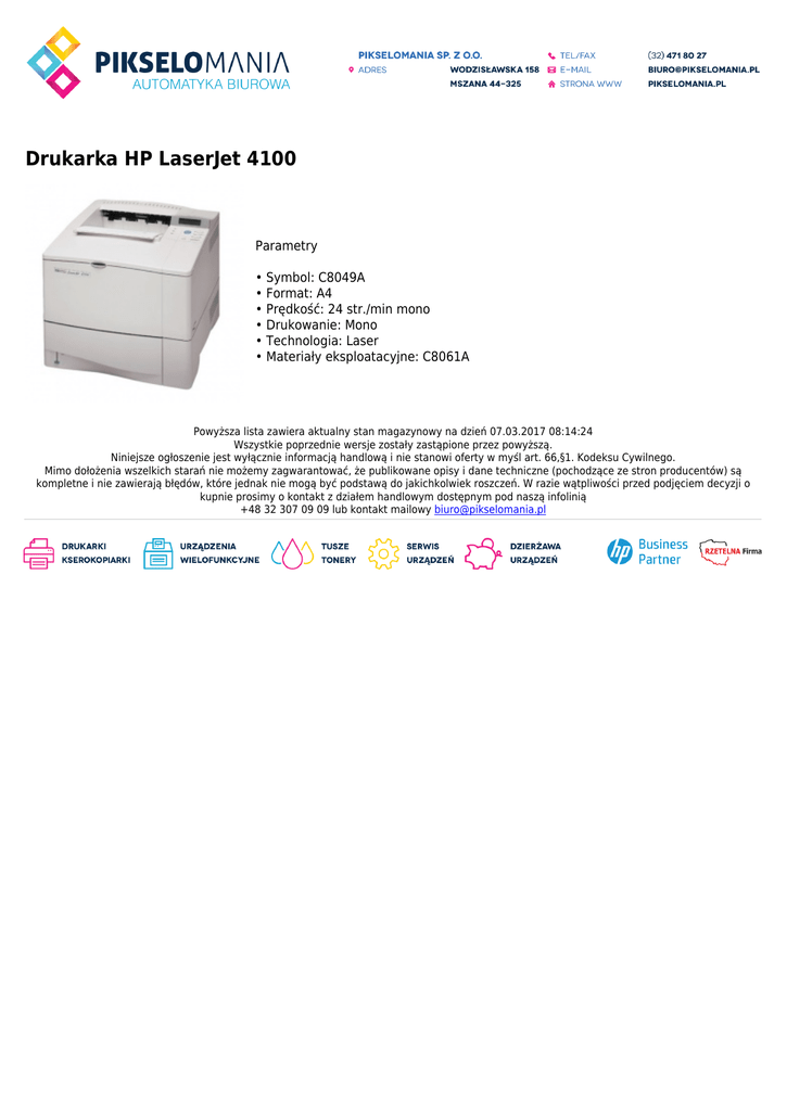 Drukarka HP LaserJet 4100 Parametry • Symbol: C8049A • Format: A4 • Prędkość: 24 str./min mono • Drukowanie: Mono • Technologia: Laser • Materiały eksploatacyjne: C8061A Powyższa lista zawiera aktualny stan magazynowy na dzień 07.03.2017 08:14:24 Wszystkie poprzednie wersje zostały zastąpione przez powyższą. Niniejsze ogłoszenie jest wyłącznie informacją handlową i nie stanowi oferty w myśl art. 66,§1. Kodeksu Cywilnego. Mimo dołożenia wszelkich starań nie możemy zagwarantować, że publikowane opisy i dane techniczne (pochodzące ze stron producentów) są kompletne i nie zawierają błędów, które jednak nie mogą być podstawą do jakichkolwiek roszczeń. W razie wątpliwości przed podjęciem decyzji o kupnie prosimy o kontakt z działem handlowym dostępnym pod naszą infolinią +48 32 307 09 09 lub kontakt mailowy [email protected]