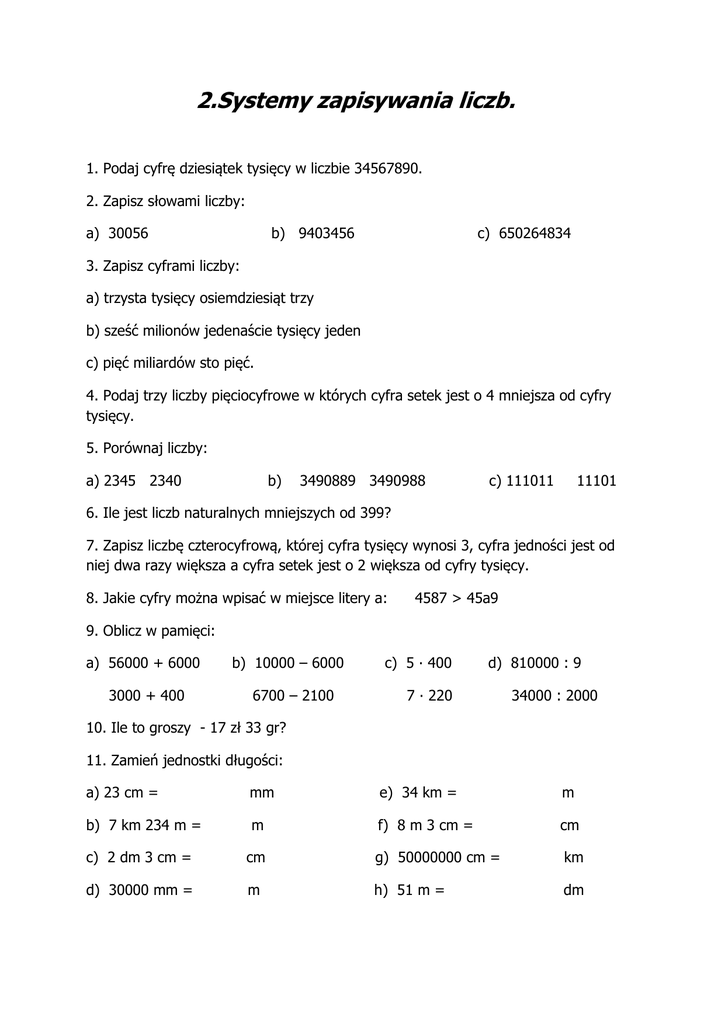 2.Systemy zapisywania liczb. 1. Podaj cyfrę dziesiątek tysięcy w liczbie 34567890. 2. Zapisz słowami liczby: a) 30056 b) 9403456 c) 650264834 3. Zapisz cyframi liczby: a) trzysta tysięcy osiemdziesiąt trzy b) sześć milionów jedenaście tysięcy jeden c) pięć miliardów sto pięć. 4. Podaj trzy liczby pięciocyfrowe w których cyfra setek jest o 4 mniejsza od cyfry tysięcy. 5. Porównaj liczby: a) 2345 2340 b) 3490889 3490988 c) 111011 11101 6. Ile jest liczb naturalnych mniejszych od 399? 7. Zapisz liczbę czterocyfrową, której cyfra tysięcy wynosi 3, cyfra jedności jest od niej dwa razy większa a cyfra setek jest o 2 większa od cyfry tysięcy. 8. Jakie cyfry można wpisać w miejsce litery a: 4587 > 45a9 9. Oblicz w pamięci: a) 56000 + 6000 3000 + 400 b) 10000 – 6000 6700 – 2100 c) 5 ∙ 400 d) 810000 : 9 7 ∙ 220 34000 : 2000 10. Ile to groszy - 17 zł 33 gr? 11. Zamień jednostki długości: a) 23 cm = mm e) 34 km = m b) 7 km 234 m = m f) 8 m 3 cm = cm c) 2 dm 3 cm = cm g) 50000000 cm = km d) 30000 mm = m h) 51 m = dm 12. Zamień jednostki masy: a) 3 t 3 kg = kg e) 45000000 g = kg b) 200000 kg = t f) 45 t = kg c) 2 kg = g g) 12 dag = g d) 11 kg 3 g = g h) 6 kg = dag 13. Zapisz podane liczby w systemie dziesiątkowym: a) MDCLIX b) XCIII c) DCCCLXXXVIII 14. Zapisz podane liczby w systemie rzymskim: a) 87 b) 379 c) 2477 b) 457 r. c) 2091 15. Który to wiek: a) 99 r. 16. Załóżmy, ze teraz jest godzina 19. 36. Odpowiedz która godzina: a) będzie za kwadrans b) będzie za 7 godzin i 16 minut c) była 11 godzin i 3 minuty temu d) była 270 minut temu 17. Załóżmy, że dzisiaj jest środa. Jaki dzień tygodnia będzie za 31 dni? 18. Czy w jakimś miesiącu może być 5 wtorków? 19. Julian urodził się 2 VII a imieniny obchodzi 19 VIII – ile dni mija od jego urodzin do imienin? 20. Pociąg miał odjechać o godzinie 15.47 ale był opóźniony o 134 minuty. O której godzinie odjechał ten pociąg?