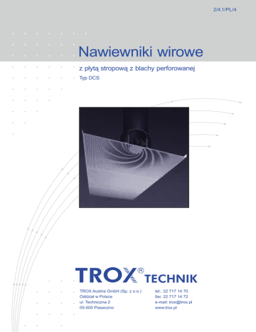 2/4.1/PL/4 Nawiewniki wirowe z płytą stropową z blachy perforowanej Typ DCS TROX Austria GmbH (Sp. z o.o.) Oddział w Polsce ul. Techniczna 2 05-500 Piaseczno tel.: 22 717 14 70 fax: 22 717 14 72 e-mail: [email protected] www.trox.pl Spis treści · Opis Opis Budowa · Wymiary Instalacja · Montaż Materiały Oznaczenia Dane akustyczne Dane aerodynamiczne Informacje do zamawiania Typ DCS-P-... Typ DCS-N-... Typ DCS-C-... 2 2 3 5 5 6 7 8 14 Nawiewniki wirowe z perforowaną płytą stropową, mogą być stosowane zarówno w instalacjach klimatyzacji komfortu, jak i w pomieszczeniach przemysłowych. Konstrukcja nawiewników wirowych zapewnia szybką redukcję temperatury i prędkości przepływu dzięki wirowemu wypływowi i wysokiej indukcji powietrza. Nawiewniki wirowe mogą być stosowane zarówno w instalacjach o stałym strumieniu przepływu jak i w instalacjach o zmiennej ilości powietrza. Prawidłowe działanie nawiewników zapewnione jest w zakresie objętościowego strumienia przepływu od 100% do 25%. Budowa · Wymiary Budowa Kwadratowe nawiewniki typu DCS dostępne są w wielkościach ... x125, 160, 200, 250, 315 i 400 o różnych wielkościach i wariantach wykonania płyty czołowej. Okrągły nawiewnik z dyfuzorem i promieniowo rozmieszczonymi, ustawionymi na stałe kierownicami i kołnierzem przyłącznym. Na zamówienie może być dostarczany z pionowym króćcem przyłącznym lub skrzynką z bocznym, okrągłym podłączeniem. Skrzynka rozprężna opcjonalnie z izolacją akustyczną. Nawiewniki typu DCS-P składają się z perforowanej płyty stropowej z wykładziną dźwiękochłonną od strony wewnętrznej. W typie DCS-N płyta stropowa wykonana jest z gładkiej blachy stalowej z perforowaną częścią centralną przesłaniającą element nawiewny. Wielkość ØA ØB ØC ØD H1 H2 H3 ... x 125 123 200 175 98 156 76 154 180 202 200 ... x 160 158 235 210 123 180 79 159 215 237 250 ... x 200 198 275 250 158 215 79 162 255 277 300 ... x 250 248 325 300 198 255 76 167 305 327 350 ... x 315 313 410 385 248 305 89 184 370 392 450 ... x 400 398 495 470 313 361 89 194 454 476 500 Typ DCS-N-...-K ØC ØC ØR ØB 623) ØR 593 ( 598, ØD 8 8 H3 40 Typ DCS-N-...-US Wielkość ... x 125 i ... x 160 bez płyty perforowanej ØD 40 Typ DCS-P-...-US Wielkość ... x 125 i ... x 160 bez płyty perforowanej 623) H3 593 ( 598, ØR ØA H2 8 H2 ØA K1 8 Typ DCS-P-...-K K ØC ØC ØR 593 ( 598, ØB 623) ØR 593 ( 598, ØD ØD K1 K 8 8 H2 H2 H1 Typ DCS-N-...-A lub Typ DCS-N-...-AK K1 K H1 Typ DCS-P-...-A lub Typ DCS-P-...-AK 623) ØC ØC ØR 593 ( 598, ØB 623) ØR 593 ( 598, 623) 3 Budowa · Wymiary Budowa Nawiewniki typu DCS-C składają się z gładkiej stalowej płyty stropowej, zamontowanego do niej okrągłego nawiewnika wirowego z dyszą i ustawionymi na stałe kierownicami, przykrytego płytą perforowaną i kołnierza przyłącznego. Na zamówienie nawiewniki dostarczane są z pionowym króćcem przyłącznym lub skrzynką rozprężną z bocznym, okrągłym króćcem. Skrzynka rozprężna może być opcjonalnie wyposażona w izolację akustyczną. Typ DCS-C-...-K 8 H2 ØA ØR 593 ( 598, ØD 8 H3 40 Typ DCS-C-...-US Wielkość ... x 125 i ... x 160 bez płyty perforowanej 623) ØR 593 ( 598, 623) 8 H2 H1 ØD K1 K Typ DCS-C-...-A lub Typ DCS-C-...-AK ØR 593 ( 598, 4 623) Instalacja · Montaż · Materiały Montaż Materiały Nawiewniki zawieszane są standardowo za pomocą trzech lub czterech uchwytów. Wariant wykonania bez skrzynki rozprężnej łączony jest z przewodem na budowie. Zgodnie z rysunkami 1 i 3 nawiewniki oparte są na profilach teowych. Wariant wykonania z ukrytymi teownikami - rysunek 2 - nawiewnik przymocowany jest do sufitu za pomocą czterech kątowników z zaczepami. Płyta stropowa, nawiewnik i kołnierz przyłączny wykonane są z blachy stalowej ocynkowanej, dyfuzor ze stali, a pionowy króciec przyłączny z aluminium. Płyty czołowe nawiewników typu DCS-N i DCS-P są wstępnie przygotowane i lakierowane proszkowo na biało (RAL 9010). Nawiewnik malowany na czarno (RAL 9005). Płyta czołowa nawiewników typu DCS-C oraz dyfuzor wstępnie przygotowane i lakierowane proszkowo na biało (RAL 9010). Nawiewnik malowany na czarno (RAL 9005). Skrzynka rozprężna ze stali ocynkowanej, izolacja akustyczna z wełny mineralnej. Rys. 1 Rys. 3 Aufhängeuchwyty do zawieszenia laschen 593 uchwyty do Aufhängezawieszenia laschen 600 Typ DCS-...-V-A lub Typ DCS-...-V-AK 593 600 Typ DCS-...-V-K Rys. 2 Aufhängeuchwyty do zawieszenia laschen 32 lub 38 ok. ca. 10 598 ( 623) 600 ( 625) Typ DCS-...-H-US 5 Oznaczenia Efektywna powierzchnia wypływu A eff w m 2 Oznaczenia L B H1 v-L ∆t L L · V L ∆t Z X H = 2,6...4,0 m 125 160 200 250 315 400 Aeff 0.0034 0.0060 0.0092 0.0150 0.0265 0.0355 v-L ∆t L 75 v- H1 ∆t H1 X A 1,70 m Wielkość...x B · V · V L X w l/s: Objętościowy strumień powietrza na nawiewnik w m3/h: Objętościowy strumień powietrza na nawiewnik w m: Pozioma plus pionowa (X+H1) odległość od nawiewnika do ściany A, B w m: Odstęp pomiędzy dwoma nawiewnikami X w m: Odległość od osi nawiewnika do ściany w m: Odległość od sufitu do strefy przebywania ludzi H1 v-L w m/s: Średnia prędkość przepływu powietrza przy ścianie w m/s: Średnia prędkość przepływu powietrza między dwoma v-H1 nawiewnikami w odległości H 1 od sufitu Δt Z w K: Różnica temperatury pomiędzy powietrzem nawiewanym a pomieszczeniem Δt L w K: Różnica temperatury pomiędzy powietrzem w pomieszczeniu a rdzeniem strumienia w odległości L = A/2 + H 1 L = B/2 + H 1 L = X + H1 L WA w dB(A): Poziom mocy akustycznej w skali A L WNC : Wartość znamionowa NC poziomu mocy akustycznej Δpt w Pa: Strata ciśnienia całkowitego 6 Dane akustyczne 1 Poziom mocy akustycznej i strata ciśnienia Typ DCS-P lub N-...-K Wielkość... x Poprawki dla nawiewników typu DCS-C-... Do wykresu 1: Poprawka dla straty ciśnienia całkowitego Typ DCS-C-...-K Wielkość...x pt 125 160 200 250 
