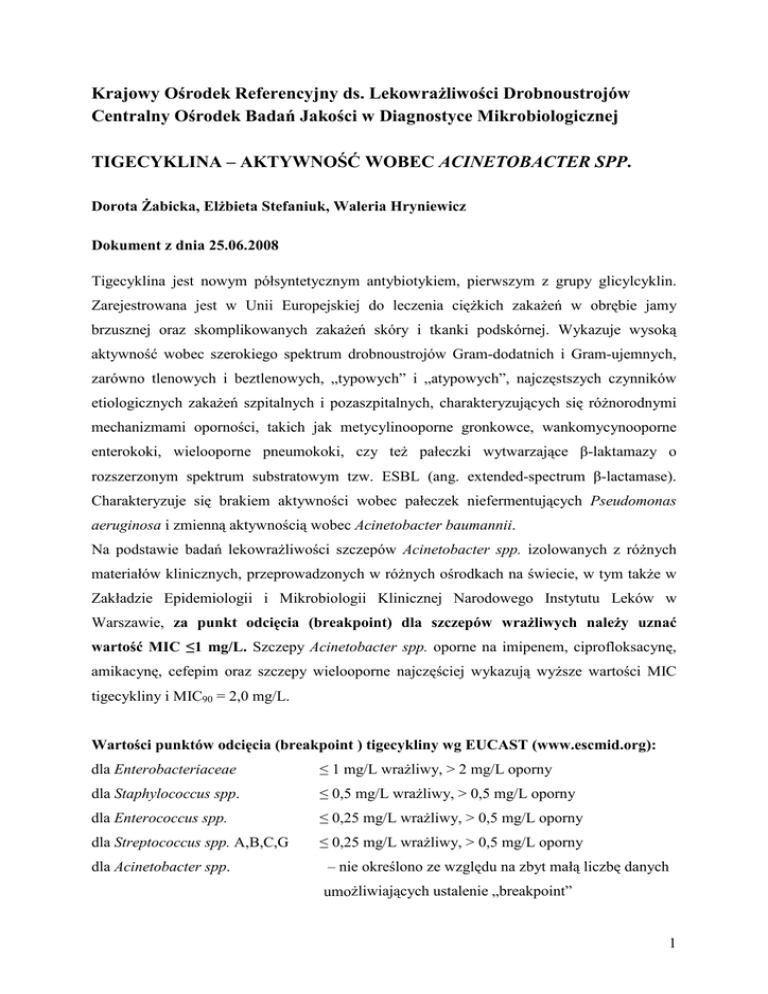 Krajowy Ośrodek Referencyjny ds. LekowraŜliwości Drobnoustrojów Centralny Ośrodek Badań Jakości w Diagnostyce Mikrobiologicznej TIGECYKLINA – AKTYWNOŚĆ WOBEC ACINETOBACTER SPP. Dorota śabicka, ElŜbieta Stefaniuk, Waleria Hryniewicz Dokument z dnia 25.06.2008 Tigecyklina jest nowym półsyntetycznym antybiotykiem, pierwszym z grupy glicylcyklin. Zarejestrowana jest w Unii Europejskiej do leczenia cięŜkich zakaŜeń w obrębie jamy brzusznej oraz skomplikowanych zakaŜeń skóry i tkanki podskórnej. Wykazuje wysoką aktywność wobec szerokiego spektrum drobnoustrojów Gram-dodatnich i Gram-ujemnych, zarówno tlenowych i beztlenowych, „typowych” i „atypowych”, najczęstszych czynników etiologicznych zakaŜeń szpitalnych i pozaszpitalnych, charakteryzujących się róŜnorodnymi mechanizmami oporności, takich jak metycylinooporne gronkowce, wankomycynooporne enterokoki, wielooporne pneumokoki, czy teŜ pałeczki wytwarzające β-laktamazy o rozszerzonym spektrum substratowym tzw. ESBL (ang. extended-spectrum β-lactamase). Charakteryzuje się brakiem aktywności wobec pałeczek niefermentujących Pseudomonas aeruginosa i zmienną aktywnością wobec Acinetobacter baumannii. Na podstawie badań lekowraŜliwości szczepów Acinetobacter spp. izolowanych z róŜnych materiałów klinicznych, przeprowadzonych w róŜnych ośrodkach na świecie, w tym takŜe w Zakładzie Epidemiologii i Mikrobiologii Klinicznej Narodowego Instytutu Leków w Warszawie, za punkt odcięcia (breakpoint) dla szczepów wraŜliwych naleŜy uznać wartość MIC ≤1 mg/L. Szczepy Acinetobacter spp. oporne na imipenem, ciprofloksacynę, amikacynę, cefepim oraz szczepy wielooporne najczęściej wykazują wyŜsze wartości MIC tigecykliny i MIC90 = 2,0 mg/L. Wartości punktów odcięcia (breakpoint ) tigecykliny wg EUCAST (www.escmid.org): dla Enterobacteriaceae ≤ 1 mg/L wraŜliwy, > 2 mg/L oporny dla Staphylococcus spp. ≤ 0,5 mg/L wraŜliwy, > 0,5 mg/L oporny dla Enterococcus spp. ≤ 0,25 mg/L wraŜliwy, > 0,5 mg/L oporny dla Streptococcus spp. A,B,C,G ≤ 0,25 mg/L wraŜliwy, > 0,5 mg/L oporny dla Acinetobacter spp. – nie określono ze względu na zbyt małą liczbę danych umoŜliwiających ustalenie „breakpoint” 1 Dystrybucja wartości MIC dla szczepów dzikich Acinetobacter spp. (wg. EUCAST) 2 Metodyka oznaczania MIC tigecykliny dla Acinetobacter spp. Referencyjną metodą oznaczania wraŜliwości na tigecyklinę pałeczek Enterobacteriaceae oraz pałeczek niefermentujących Acinetobacter spp. jest metoda rozcieńczeniowa lub metoda Etestów pozwalająca na określenie wartości najmniejszych stęŜeń hamujących tzw. MIC (ang. minimal inhibitory concentration). Wynik badania wraŜliwości szczepów bakteryjnych na tigecyklinę zaleŜy od podłoŜa, czasu, jako upłynął od jego przygotowania i napowietrzenia. Bezwzględnie konieczną jest kontrola jakości ze szczepami referencyjnymi W przypadku oznaczania wraŜliwości drobnoustrojów na tigecyklinę naleŜy przestrzegać następujących zaleceń: 1. W przypadku gotowych podłoŜy agarowych na płytkach Petriego, przeznaczonych do badania metodą dyfuzyjno-krąŜkow lub metoda Etestów waŜne są warunki przechowywania podłoŜy: temperatura 2-8ºC i czas przechowywania. Nie naleŜy stosować podłoŜy tuŜ przed upływem ich terminu waŜności. 2. PodłoŜa przygotowywane ze składników suchych, powinny być świeŜe tzn. przygotowane w czasie krótszym niŜ 12 godzin przed rozpoczęciem badania. a. Jeśli podłoŜe agarowe przygotowywane jest wcześniej (< 1 tydzień do rozpoczęcia badania), powinno być przechowywane w temperaturze 2-8ºC, a przed wylaniem na płytki Petriego powinno zostać zagotowane. b. W przypadku oznaczania wartości MIC metoda rozcieńczeniową w agarze, standard tigecykliny naleŜy dodać do podłoŜa przed rozlewaniem podłoŜa na płytki (w czasie krótszym niŜ 12 godzin przed rozpoczęciem badania). Przygotowane płytki titracyjne do badania MIC metodą rozcieńczeń w bulionie, przed uŜyciem naleŜy zamrozić w temp. -70ºC±10ºC. 3. Kontrola jakości ze szczepami referencyjnymi odpowiednimi dla rodzaju testowanego izolatu jest bezwzględną koniecznością. W przypadku badania wraŜliwości Acinetobacter spp. jako kontrole naleŜy stosować szczep Escherichia coli ATCC 25922, zakres watości MIC tigecykliny 0,03-0,265 mg/L UWAGA! Nie zaleca się stosowania metody dyfuzyjno-krąŜkowej oznaczania wraŜliwości na tigecyklinę ze względu na pojawiające się doniesienia o znacznym zróŜnicowaniu wyników oznaczania lekowraŜliwości w zaleŜności od stęŜenia jonów manganu w podłoŜaach Mueller Hintona. róŜnych producentów. 3
