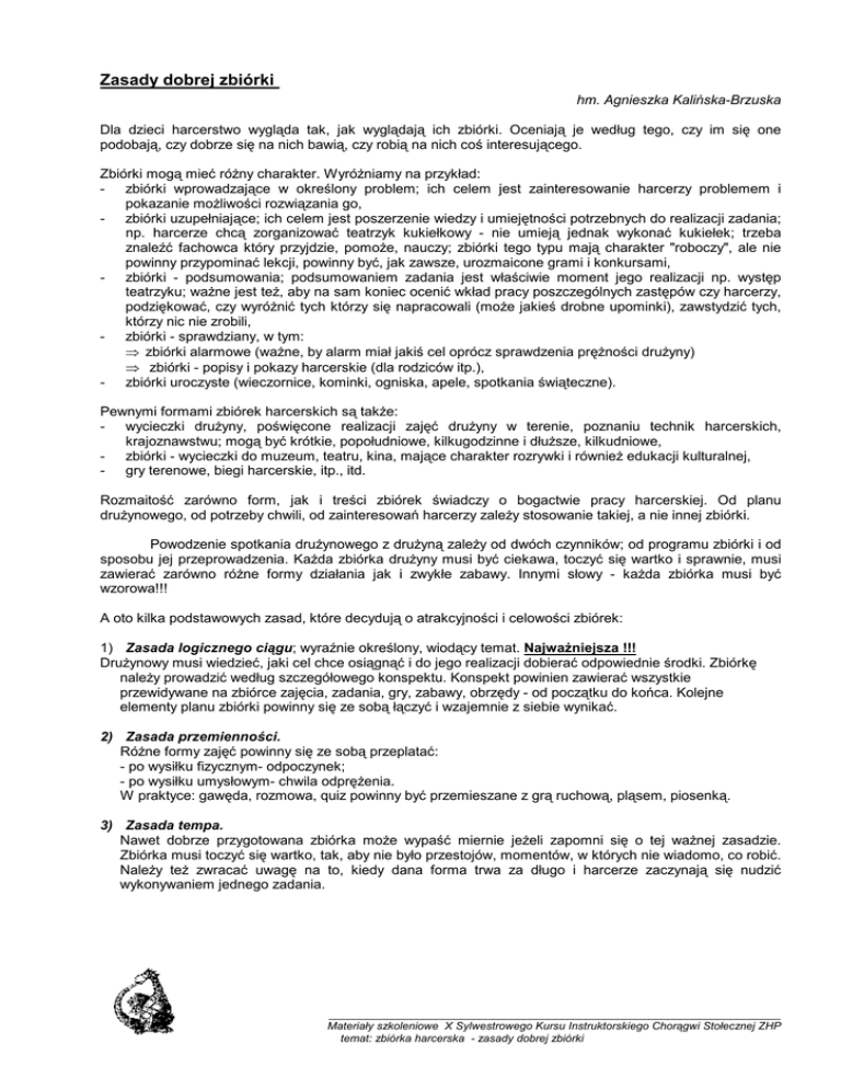 Zasady dobrej zbiórki hm. Agnieszka Kalińska-Brzuska Dla dzieci harcerstwo wygląda tak, jak wyglądają ich zbiórki. Oceniają je według tego, czy im się one podobają, czy dobrze się na nich bawią, czy robią na nich coś interesującego. Zbiórki mogą mieć róŜny charakter. WyróŜniamy na przykład: - zbiórki wprowadzające w określony problem; ich celem jest zainteresowanie harcerzy problemem i pokazanie moŜliwości rozwiązania go, - zbiórki uzupełniające; ich celem jest poszerzenie wiedzy i umiejętności potrzebnych do realizacji zadania; np. harcerze chcą zorganizować teatrzyk kukiełkowy - nie umieją jednak wykonać kukiełek; trzeba znaleźć fachowca który przyjdzie, pomoŜe, nauczy; zbiórki tego typu mają charakter "roboczy", ale nie powinny przypominać lekcji, powinny być, jak zawsze, urozmaicone grami i konkursami, - zbiórki - podsumowania; podsumowaniem zadania jest właściwie moment jego realizacji np. występ teatrzyku; waŜne jest teŜ, aby na sam koniec ocenić wkład pracy poszczególnych zastępów czy harcerzy, podziękować, czy wyróŜnić tych którzy się napracowali (moŜe jakieś drobne upominki), zawstydzić tych, którzy nic nie zrobili, - zbiórki - sprawdziany, w tym: ⇒ zbiórki alarmowe (waŜne, by alarm miał jakiś cel oprócz sprawdzenia pręŜności druŜyny) ⇒ zbiórki - popisy i pokazy harcerskie (dla rodziców itp.), - zbiórki uroczyste (wieczornice, kominki, ogniska, apele, spotkania świąteczne). Pewnymi formami zbiórek harcerskich są takŜe: - wycieczki druŜyny, poświęcone realizacji zajęć druŜyny w terenie, poznaniu technik harcerskich, krajoznawstwu; mogą być krótkie, popołudniowe, kilkugodzinne i dłuŜsze, kilkudniowe, - zbiórki - wycieczki do muzeum, teatru, kina, mające charakter rozrywki i równieŜ edukacji kulturalnej, - gry terenowe, biegi harcerskie, itp., itd. Rozmaitość zarówno form, jak i treści zbiórek świadczy o bogactwie pracy harcerskiej. Od planu druŜynowego, od potrzeby chwili, od zainteresowań harcerzy zaleŜy stosowanie takiej, a nie innej zbiórki. Powodzenie spotkania druŜynowego z druŜyną zaleŜy od dwóch czynników; od programu zbiórki i od sposobu jej przeprowadzenia. KaŜda zbiórka druŜyny musi być ciekawa, toczyć się wartko i sprawnie, musi zawierać zarówno róŜne formy działania jak i zwykłe zabawy. Innymi słowy - kaŜda zbiórka musi być wzorowa!!! A oto kilka podstawowych zasad, które decydują o atrakcyjności i celowości zbiórek: 1) Zasada logicznego ciągu; wyraźnie określony, wiodący temat. NajwaŜniejsza !!! DruŜynowy musi wiedzieć, jaki cel chce osiągnąć i do jego realizacji dobierać odpowiednie środki. Zbiórkę naleŜy prowadzić według szczegółowego konspektu. Konspekt powinien zawierać wszystkie przewidywane na zbiórce zajęcia, zadania, gry, zabawy, obrzędy - od początku do końca. Kolejne elementy planu zbiórki powinny się ze sobą łączyć i wzajemnie z siebie wynikać. 2) Zasada przemienności. RóŜne formy zajęć powinny się ze sobą przeplatać: - po wysiłku fizycznym- odpoczynek; - po wysiłku umysłowym- chwila odpręŜenia. W praktyce: gawęda, rozmowa, quiz powinny być przemieszane z grą ruchową, pląsem, piosenką. 3) Zasada tempa. Nawet dobrze przygotowana zbiórka moŜe wypaść miernie jeŜeli zapomni się o tej waŜnej zasadzie. Zbiórka musi toczyć się wartko, tak, aby nie było przestojów, momentów, w których nie wiadomo, co robić. NaleŜy teŜ zwracać uwagę na to, kiedy dana forma trwa za długo i harcerze zaczynają się nudzić wykonywaniem jednego zadania. ________________________________________________________________________ Materiały szkoleniowe X Sylwestrowego Kursu Instruktorskiego Chorągwi Stołecznej ZHP temat: zbiórka harcerska - zasady dobrej zbiórki 4) Zasada aktywnego uczestnictwa. Harcerze muszą aktywnie uczestniczyć w zbiórce, a nie tylko być kibicami dla druŜynowego i przybocznych. Chodzi o to, aby mogli oni popisać się swoimi umiejętnościami, wiadomościami, a takŜe aby mieli okazję uczyć się pracy w zespole. I o to teŜ, aby w harcerstwie dzieci wyrabiały w sobie inicjatywę i samodzielność, by uczyły się kierować innymi i podporządkowywać, gdy inni kierują. 5) Zasada "coś nowego". Harcerze na zbiórce powinni dowiedzieć się czegoś nowego. KaŜda zbiórka powinna być małą przygodą, w trakcie której harcerze zdobywają nową wiedzę i umiejętności. Zasadę tę naleŜy rozumieć szeroko. Harcerze mogą uczyć się sposobów poruszania w terenie, odczytywania znaków patrolowych, naprawiania roweru, pieczenia ciasta, a takŜe dowiedzieć się, jakie ptaki u nas zimują, jak powstał węgiel itd. Mogą wreszcie nauczyć się czytać mapę, wiązać węzły czy udzielać pierwszej pomocy w nagłych wypadkach. 6) Zasada stałego elementu. Oprócz elementów zmiennych kaŜda zbiórka druŜyny powinna posiadać pewne stałe elementy, takie jak na przykład: powitanie, przeprowadzenie apelu, poŜegnanie, okrzyk. SłuŜą one podkreślaniu osobowości druŜyny i umacnianiu więzi harcerzy z druŜyną. I jeszcze dwie sprawy, które pośrednio tylko moŜna zaliczyć do zasad dobrej zbiórki. Pierwsza z nich to miejsce, w którym zbiórka powinna się odbywać. Zawsze trzeba pamiętać, Ŝe dziewczęta i chłopcy potrzebują ruchu i świeŜego powietrza. Dlatego, o ile jest to moŜliwe, staraj się jak najczęściej organizować zbiórki w lesie, na łące, na boisku. Gdy temat, czy pogoda temu nie sprzyja, przynajmniej część spotkania przeprowadź na powietrzu. Druga sprawa, to rola, jaką na zbiórce odgrywa przyboczny. Na kaŜdym spotkaniu powinien on mieć określone zadania, odpowiadać za określone elementy. Przyboczny nie moŜe czuć się jak "piąte koło u wozu", musi wspólnie z tobą aktywnie uczestniczyć w przygotowaniu i prowadzeniu zbiórki. Pamiętaj!! Przyboczny jest twoim zastępcą, a w przyszłości być moŜe n