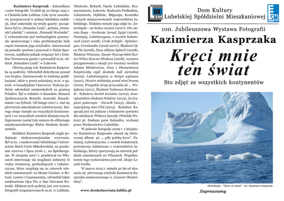 Kazimierz Kasprzak dziennikarz i autor fotografii. Urodził się 22 lutego 1941 r. w Chmielu koło Lublina. Cale życie zawodo we przepracował w jednej lubelskiej redak cji, choć zmieniały się tytuły gazety: począt kowo był to „Sztandar Ludu", później „Dzien nik Lubelski" i ostatnio „Dziennik Wschodni". Z wykształcenia jest technologiem przemy słu spożywczego i taka problematyka była często tematem jego artykułów. Interesował się ponadto sportem i pracował w Dziale Spor towym, najdłużej jednak związany był z Dzia łem Terenowym gazety i prowadził m.in. od dział „Sztandaru Ludu'' w Łukowie. Główną pasją red. Kazimierza Kasprza ka są podróże. Odwiedził dotychczas ponad 100 krajów. Zaowocowało to wieloma publi kacjami, także w prasie polonijnej, m.in. w ga zecie w kanadyjskim Vancouver. Podczas po dróży odwiedzał zamieszkałych za granicą Polaków. Był u rodaków w Kanadzie, Stanach Zjednoczonych, Brazylii, Australii, Kazach stanie i na Syberii. Od lutego 2007 r. stał się pierwszym mieszkańcem Lubelszczyzny, któ rego stopy stanęły na wszystkich kontynen tach i we wszystkich strefach klimatycznych. Zaproszony został tym samym do elitarnego międzynarodowego Klubu Siedmiu Konty nentów. Redaktor Kazimierz Kasprzak ciągle po dejmuje niekonwencjonalne wyzwania. Był m.in. z naukowcami lubelskiego Uniwer sytetu Marii CurieSkłodowskiej, na przeło mie czerwca i lipca 2006 r., na Spitsberge nie. W sierpniu 2007 r. przebywał we Wło szech interesując się mogiłami żołnierzy II wojny światowej, pochodzących z Lubelsz czyzny, które znajdują się na czterech wło skich cmentarzach: na Monte Cassino. w Bo lonii, Loreto i Casamassima, odwiedził także sanktuarium Ojca Pio w San Giovanni Ro tondo. Efektem tych podróży jest 100 wystaw fotografii zorganizowanych m.in. w Lublinie, Olsztynie, Rykach, Opolu Lubelskim, Kra snymstawie, Łukowie, Radzyniu Podlaskim, Lubartowie, Dęblinie, Biłgoraju, Kraśniku i innych miejscowościach województwa lu belskiego. Niektóre tematy jego zdjęć to: An tarktyda na końcu świata (2007), Oto zie mia Boga Jordania. Izrael, Egipt (2006), Pamiętaj, Lubelszczyzno, o swoich bohate rach (20072008), Uroki Arktyki Spitsber gen, Grenlandia (20062007), Śladami Oj ca Pio (2008), Dwa oblicza Syberii (2008), Śladami Wieszcza. ZaosieNowogródekŚwi teźWilnoKownoMoskwa (2008), wystawa przygotowana z okazji 210 rocznicy urodzin Adama Mickiewicza, Noce z Diamentową Księżniczką czyli dookoła kuli ziemskiej (2009), Lubelszczyzna w Katyń wpisana (2010), Otwórz niebieską przed nimi bramę (2010), Wszystkie drogi prowadzą do ... Wa tykanu (2011), Śladami Tadeusza Kościusz ki bohatera dwóch światów (2012), Ame rykańskimi śladami Polaków (2013), Za krę giem polarnym Narwik (2013), Alaska największy stan USA (2013). Redaktor Ka sprzak jest też jednym z bohaterów powieści dla młodzieży Wiktora Zawady (Witolda We lcza) pt. Szukam pana Kalandra, wydanej przez Wydawnictwo Lubelskie. W połowie listopada 2009 r. z inicjaty wy Kazimierza Kasprzaka ukazał się histo ryczny album pt. „…piły polską krew”. Pa miętaj, Lubelszczyzno, o swoich bohaterach, poświęcony żołnierzom z województwa lu belskiego, którzy spoczywają na czterech pol skich cmentarzach we Włoszech. Współau torem tego wydawnictwa jest red. Alojzy Le szek Gzella. W marcu 2013 r. minęło 50 lat od uka zania się pierwszego artykułu Kazimierza Ka sprzaka zamieszczonego w „Gazecie Olsztyń skiej". Dom Kultury Lubelskiej Spółdzielni Mieszkaniowej 100. Jubileuszowa Wystawa Fotografii Kazimierza Kasprzaka Kręci mnie ten świat Sto zdjęć ze wszystkich kontynentów Antarktyda "Okno na świat" tot. Kazimierz Kasprzak www.dookolaswiata.lublin.pl Zapraszamy Dom Kultury Lubelskiej Spółdzielni Mieszkaniowej 100. Jubileuszowa Wystawa Fotografii Kazimierza Kasprzaka Australia - Spotkanie z Aborygenem Afryka - Góra Synaj Kręci mnie ten świat Sto zdjęć ze wszystkich kontynentów Ameryka Północna - Alaska - z kąpieli słonecznych korzystają nie tylko ludzie Ameryka Południowa - Buenos Aires - Katedra Antarktyda - ten kontynent ciągle fascynuje Europa - Bolonia - cmentarz z II wojny światowej Azja - Pekin (pałac cesarski) Wernisaż odbędzie się w poniedziałek 9 grudnia 2013 r. o godz. 18.00 w Galerii Sztuki w Domu Kultury LSM w Lublinie, ul. K. Wallenroda 4a, tel. 81 743 48 29 www.domkulturylsm.pl W s t ę p w ol n y