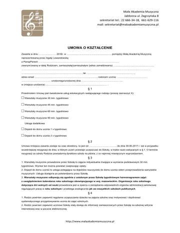 Mała Akademia Muzyczna Jabłonna ul. Zegrzyńska 8 sekretariat tel.: 22 666-34-18, 661-629-116 mail: [email protected] UMOWA O KSZTAŁCENIE Zawarta w dniu ……….......……. 2016r. w …............................................................... pomiędzy Małą Akademią Muzyczną reprezentowaną przez Agatę Lewandowską a Panią/Panem …………………..……………………..…………………….……………..…….… zwanym/zwaną w dalej Rodzicem, zamieszkałą/zamieszkałym (adres zameldowania) ……………………………..…..………... ……….…………………………………………………………………………………………………………….…….….……….…… ……..……….……………………………………….….…….., tel. ……………………………….....…….…………, adres email …..………………………………….…….….…………............, rodzicem ucznia: ……………………………….. ……………..……………….. urodzonego/urodzonej dnia …………..……………………………….. w (miejsce urodzenia) …….………...…..…………..............................................… . §1 Przedmiotem Umowy jest świadczenie usług edukacyjnych następującego rodzaju (proszę zaznaczyć X): □ Warsztaty muzyczne 30 min. tygodniowo □ Warsztaty muzyczne 45 min. tygodniowo □ Warsztaty muzyczne 60 min. tygodniowo □ Warsztaty muzyczne 90 min. tygodniowo Usługa dodatkowa: □ Dojazd do domu ucznia 1 x tygodniowo □ Dojazd do domu ucznia 2 x tygodniowo §2 Umowa niniejsza zawarta zostaje na czas określony, to jest od ….…………….…………... do dnia 30.06.2017 r. lub w przypadku wcześniejszej rezygnacji do dnia, w którym uczeń przestaje uczęszczać do Szkoły, w trybie nauki wskazanym w § 1. O terminie rezygnacji ze szkoły Rodzice powiadomią dyrektora szkoły na piśmie, z co najmniej miesięcznym wyprzedzeniem. §3 1. Warsztaty muzyczne prowadzone przez Szkołę to zajęcia indywidualne trwające w wymiarze podstawowym 30 min. tygodniowo. Wymiar ten można powielać zwiększając opłaty. 2. Dojazd do domu ucznia to usługa polegająca na dojeździe nauczyciela do domu ucznia celem przeprowadzenia warsztatów muzycznych. Usługa dostępna po potwierdzeniu przez Szkołę. 3. Warsztaty muzyczne odbywają się zgodnie z ustalonym przez Szkołę tygodniowym harmonogramem zajęć z uwzględnieniem kalendarza roku szkolnego obowiązującego w woj. mazowieckim. Organizacja roku szkolnego dotycząca dni wolnych od nauki prowadzona jest w oparciu o zarządzenia odpowiednich organów administracji państwowej regulujących pracę w roku szkolnym i przebiega analogicznie jak we wszystkich szkołach publicznych. §4 1. Rodzic powinien zapewnić regularne uczęszczanie dziecka na zajęcia szkolne oraz motywować i dopilnować systematycznego przygotowywania ucznia do zajęć szkolnych. 2. Rodzic powinien zapewnić uczniowi Szkoły stały dostęp do informacji zamieszczanych przez Szkołę na szkolnej witrynie internetowej oraz w poczcie elektronicznej. http://www.malaakademiamuzyczna.pl Mała Akademia Muzyczna Jabłonna ul. Zegrzyńska 8 sekretariat tel.: 22 666-34-18, 661-629-116 mail: [email protected] 3. Rodzic zobowiązany jest do powiadomienia Szkoły o zmianach danych teleadresowych niezbędnych do kontaktu z nim. 4. Rodzice zobowiązani są do dostarczenia dokumentów niezbędnych do przyjęcia i uczęszczania dziecka do Szkoły, w tym zaświadczenia lekarskiego o braku przeciwwskazań do nauki. 5. Rodzic ponosi odpowiedzialność za szkody wyrządzone przez dziecko oraz zobowiązany jest do ich naprawienia lub pokrycia kosztów ich napraw z własnych środków. 6. Rodzic wyraża zgodę na publikację wizerunku dziecka w tym na fotografowanie, rejestrowanie audycji, egzaminów, koncertów, występów itp. wydarzeń organizowanych przez szkołę. §5 1. Warunkiem uczestnictwa w zajęciach Szkoły jest uiszczenie opłat za naukę. 2. Opłaty za uczestnictwo w Warsztatach muzycznych prowadzonych przez Szkołę, dalej zwane Opłaty to: 2.1. Wpisowe: 200 zł płatne jednorazowo w terminie 4 dni od otrzymania niniejszej Umowy o kształcenie. 2.2. Czesne jest opłatą o stałej wysokości, niezależnie od ilości zajęć odbywających się w danym miesiącu i jest to: a) za Warsztaty muzyczne w wymiarze 30 min. zajęć tygodniowo – opłata roczna 1800 zł, płatna w dziesięciu miesięcznych ratach po 180 zł, za każdy miesiąc z góry, b) za Warsztaty muzyczne w wymiarze 45 min. zajęć tygodniowo – opłata roczna 2600 zł, płatna w dziesięciu miesięcznych ratach po 260 zł, za każdy miesiąc z góry, c) za Warsztaty muzyczne w wymiarze 60 min. zajęć tygodniowo – opłata roczna 3400 zł, płatna w dziesięciu miesięcznych ratach po 340 zł, za każdy miesiąc z góry, d) za Warsztaty muzyczne w wymiarze 90 min. zajęć tygodniowo – opłata roczna 5000 zł, płatna w dziesięciu miesięcznych ratach po 500 zł, za każdy miesiąc z góry, e) za Dojazd do domu ucznia 1 x tygodniowo – opłata roczna 600 zł, płatna w dziesięciu miesięcznych ratach po 60 zł, za każdy miesiąc z góry, f) za Dojazd do domu ucznia 2 x tygodniowo – opłata roczna 1200 zł, płatna w dziesięciu miesięcznych ratach po 120 zł, za każdy miesiąc z góry. 3. W uzasadnionych przypadkach na wniosek Rodzica Szkoła ustala inny tryb wnoszenia Opłat. 4. Szkoła zastrzega sobie możliwość zmiany wysokości Opłat i trybu ich wnoszenia w przypadku zmiany kosztów utrzymania szkoły lub innych zewnętrznych przyczyn. Rodzic, o ewentualnych zmianach obowiązującej na dany rok szkolny wysokości miesięcznego czesnego winien być powiadomiony z miesięcznym wyprzedzeniem, a zmiana wysokości opłat zostaje potwierdzona stosownym aneksem do niniejszej umowy. 5. Obowiązek opłacania czesnego rozpoczyna się w miesiącu,