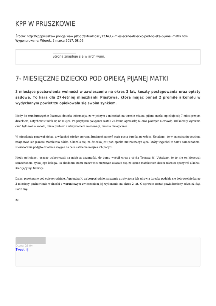 KPP W PRUSZKOWIE Źródło: http://kpppruszkow.policja.waw.pl/ppr/aktualnosci/12343,7-miesieczne-dziecko-pod-opieka-pijanej-matki.html Wygenerowano: Wtorek, 7 marca 2017, 08:06 Strona znajduje się w archiwum. 7- MIESIĘCZNE DZIECKO POD OPIEKĄ PIJANEJ MATKI 3 miesiące pozbawienia wolności w zawieszeniu na okres 2 lat, koszty postępowania oraz opłaty sądowe. To kara dla 27-letniej mieszkanki Piastowa, która mając ponad 2 promile alkoholu w wydychanym powietrzu opiekowała się swoim synkiem. Kiedy do mundurowych z Piastowa dotarła informacja, że w jednym z mieszkań na terenie miasta, pijana matka opiekuje się 7-miesięcznym dzieckiem, natychmiast udali się na miejce. Po przybyciu policjanci zastali 27-letnią Agnieszkę K. oraz płaczące niemowlę. Od kobiety wyraźnie czuć było woń alkoholu, miała problem z utrzymaniem równowagi, mówiła nielogicznie. W mieszkaniu panował nieład, a w kuchni między stertami brudnych naczyń stała pusta butelka po wódce. Ustalono, że w mieszkaniu powinna znajdować sie jeszcze małoletnia córka. Okazało się, że dziecko jest pod opieką nietrzeźwego ojca, który wyjechał z domu samochodem. Niezwłocznie podjęto działania mające na celu ustalenie miejsca ich pobytu. Kiedy policjanci jeszcze wykonywali na miejscu czynności, do domu wrócił wraz z córką Tomasz W. Ustalono, że to nie on kierował samochodem, tylko jego kolega. Po zbadaniu stanu trzeźwości mężczyzn okazało się, że ojciec małoletnich dzieci również spożywał alkohol. Kierujący był trzeźwy. Dzieci przekazano pod opiekę rodzinie. Agnieszka K. za bezpośrednie narażenie utraty życia lub zdrowia dziecka poddała się dobrowolnie karze 3 miesięcy pozbawienia wolności z warunkowym zwieszeniem jej wykonania na okres 2 lat. O sprawie został powiadomiony również Sąd Rodzinny. ag Ocena: 0/5 (0) Tweetnij