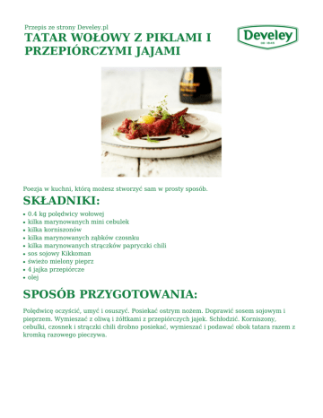 Przepis ze strony Develey.pl TATAR WOŁOWY Z PIKLAMI I PRZEPIÓRCZYMI JAJAMI Poezja w kuchni, którą możesz stworzyć sam w prosty sposób. SKŁADNIKI: ● ● ● ● ● ● ● ● ● 0.4 kg polędwicy wołowej kilka marynowanych mini cebulek kilka korniszonów kilka marynowanych ząbków czosnku kilka marynowanych strączków papryczki chili sos sojowy Kikkoman świeżo mielony pieprz 4 jajka przepiórcze olej SPOSÓB PRZYGOTOWANIA: Polędwicę oczyścić, umyć i osuszyć. Posiekać ostrym nożem. Doprawić sosem sojowym i pieprzem. Wymieszać z oliwą i żółtkami z przepiórczych jajek. Schłodzić. Korniszony, cebulki, czosnek i strączki chili drobno posiekać, wymieszać i podawać obok tatara razem z kromką razowego pieczywa.