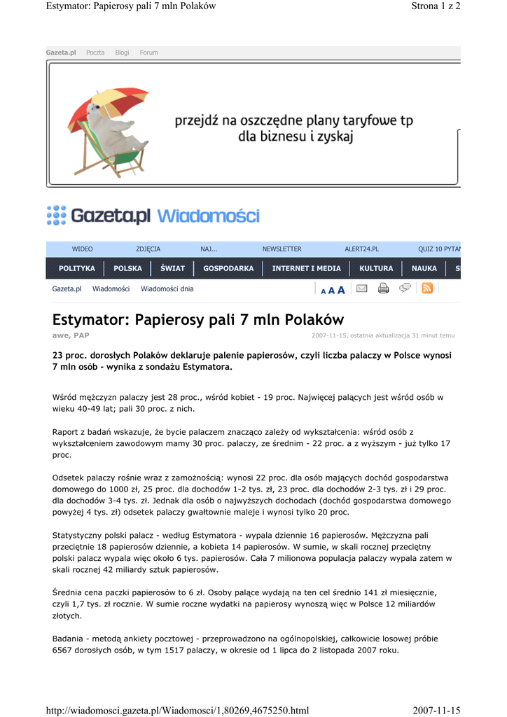 Estymator: Papierosy pali 7 mln Polaków Gazeta.pl Poczta Blogi WIDEO POLITYKA Gazeta.pl Forum ZDJĘCIA POLSKA Wiadomości Strona 1 z 2 NAJ... ŚWIAT GOSPODARKA NEWSLETTER ALERT24.PL INTERNET I MEDIA Wiadomości dnia A KULTURA QUIZ 10 PYTAŃ NAUKA SP AA Estymator: Papierosy pali 7 mln Polaków awe, PAP 2007-11-15, ostatnia aktualizacja 31 minut temu 23 proc. dorosłych Polaków deklaruje palenie papierosów, czyli liczba palaczy w Polsce wynosi 7 mln osób - wynika z sondażu Estymatora. Wśród mężczyzn palaczy jest 28 proc., wśród kobiet - 19 proc. Najwięcej palących jest wśród osób w wieku 40-49 lat; pali 30 proc. z nich. Raport z badań wskazuje, że bycie palaczem znacząco zależy od wykształcenia: wśród osób z wykształceniem zawodowym mamy 30 proc. palaczy, ze średnim - 22 proc. a z wyższym - już tylko 17 proc. Odsetek palaczy rośnie wraz z zamożnością: wynosi 22 proc. dla osób mających dochód gospodarstwa domowego do 1000 zł, 25 proc. dla dochodów 1-2 tys. zł, 23 proc. dla dochodów 2-3 tys. zł i 29 proc. dla dochodów 3-4 tys. zł. Jednak dla osób o najwyższych dochodach (dochód gospodarstwa domowego powyżej 4 tys. zł) odsetek palaczy gwałtownie maleje i wynosi tylko 20 proc. Statystyczny polski palacz - według Estymatora - wypala dziennie 16 papierosów. Mężczyzna pali przeciętnie 18 papierosów dziennie, a kobieta 14 papierosów. W sumie, w skali rocznej przeciętny polski palacz wypala więc około 6 tys. papierosów. Cała 7 milionowa populacja palaczy wypala zatem w skali rocznej 42 miliardy sztuk papierosów. Średnia cena paczki papierosów to 6 zł. Osoby palące wydają na ten cel średnio 141 zł miesięcznie, czyli 1,7 tys. zł rocznie. W sumie roczne wydatki na papierosy wynoszą więc w Polsce 12 miliardów złotych. Badania - metodą ankiety pocztowej - przeprowadzono na ogólnopolskiej, całkowicie losowej próbie 6567 dorosłych osób, w tym 1517 palaczy, w okresie od 1 lipca do 2 listopada 2007 roku. http://wiadomosci.gazeta.pl/Wiadomosci/1,80269,4675250.html 2007-11-15