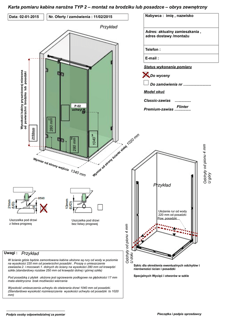Karta pomiaru kabina narożna TYP 2 – montaż na brodziku lub posadzce – obrys zewnętrzny Data: 02-01-2015 Nabywca : imię , nazwisko Nr. Oferty / zamówienia : 11/02/2015 Przykład Adres: aktualny zamieszkania , adres dostawy /montażu Telefon : E-mail : Do wyceny Do zamówienia nr …....................... Model okuć Classic-zawias P-02 uchwyt …............ Flinter Premium-zawias …............ 280 mm stro ny w ejśc ia 134 0m m 1040 3 2 ym W r ia od ny ro st i śc ta is k an j łe 20 10 m m Przykład Uwagi : Uszczelka pod drzwi bez listwy progowej Przykład W ścianie gdzie będzie zamontowana kabina ułożone są rury od wody w poziomie na wysokości 220 mm od powierzchni posadzki . Proszę o umieszczenie zawiasów.2. i mocowań.1. dolnych do ściany na wysokości 280 mm od krawędzi szkła (standardowy rozstaw 250 mm od krawędzi dolnej i górnej szkła) p Pod posadzką z płytek ułożone jest ogrzewanie podłogowe na głębokości 17 mm mata elektryczna brak możliwości wiercenia Odchyły od pionu 4 mm U dołu Uszczelka pod drzwi z listwa progową Ułożenie rur od wody 220 mm od posadzki Pow. posadzki Szkic dla określenia ewentualnych odchyłów i nierówności ścian i posadzki Specjalnych Wycięć i otworów w szkle Wysokość umieszczenia uchwytu do otwierania drzwi 1040 mm od posadzki. (Standardowa wysokość rozmieszczenia wysokości uchwytu od posadzki to 1020 mm) Podpis osoby odpowiedzialnej za pomiar Pieczątka i podpis sprzedawcy Odchyły od pionu 4 mm U góry Wym iar o d 280 mm 1 2150mm Wysokość kabiny prysznicowej mierzona od powierzchni brodzika lub posadzki Status wykonania pomiaru Rzut sytuacji montażowej- obrys zewnętrzny kabiny prysznicowej lub brodzika wersja lewa lub prawa Sytuacja montażowa przedstawia wejście od strony lewej możliwa zamiana na wejście od strony prawej . Widok kabiny prysznicowej posadowionej na brodziku z wymiarem zewnętrznym brodzika. W przypadku kabiny posadowionej bezpośrednio na posadzce obrys brodzika będzie obrysem zewnętrznym wymiarów gabarytowych kabiny prysznicowej. ( rys. 1 i 2 poniżej ) 1020 Szerokość od strony ścianki stałej …................. mm Strona prawa Mocowanie TS-1 Przykład Mocowanie TS-1 Zawias Flinter 180st Uszczelka PGF 90ST Strona lewa Uszczelka WS-08 RB 16 RB 16 650 Szerokość wejścia / drzwi ….............. mm 1340 Szerokość od strony wejścia …............................ mm Wejście od strony lewej Montaż na posadzce Wejście od strony prawej Montaż na brodziku 2150 Wysokość od strony wejścia ….........mm Wysokość od strony ścianki stałej ….........mm Rys. 1 Podpis osoby odpowiedzialnej za pomiar RB 16 mm rant brodzika 2150 Rys. 2 Pieczątka i podpis sprzedawcy