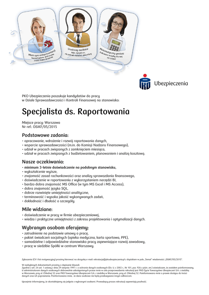 PKO Ubezpieczenia poszukuje kandydatów do pracy w Dziale Sprawozdawczości i Kontroli Finansowej na stanowisko: Specjalista ds. Raportowania Miejsce pracy: Warszawa Nr ref.: DSiKF/05/2015 Podstawowe zadania: • opracowanie, wdrożenie i rozwój raportowania danych, • wsparcie sprawozdawczości (m.in. do Komisji Nadzoru Finansowego), • udział w pracach związanych z zamknięciem miesiąca, • udział w pracach związanych z budżetowaniem, planowaniem i analizą kosztową. Nasze oczekiwania: • minimum 3-letnie doświadczenie na podobnym stanowisku, • wykształcenie wyższe, • znajomość zasad rachunkowości oraz analizy sprawozdania finansowego, • doświadczenie w raportowaniu z wykorzystaniem narzędzi BI, • bardzo dobra znajomość MS Office (w tym MS Excel i MS Access), • dobra znajomość języka SQL, • dobrze rozwinięte umiejętności analityczne, • terminowość i wysoka jakość wykonywanych zadań, • dokładność i dbałość o szczegóły. Mile widziane: • doświadczenie w pracy w firmie ubezpieczeniowej, • wiedza i praktyczne umiejętności z zakresu projektowania i optymalizacji danych. Wybranym osobom oferujemy: • zatrudnienie na podstawie umowy o pracę, • pakiet świadczeń socjalnych (opieka medyczna, karta sportowa, PPE), • samodzielne i odpowiedzialne stanowisko pracy zapewniające rozwój zawodowy, • pracę w siedzibie Spółki w centrum Warszawy. Zgłoszenia (CV i list motywacyjny) prosimy kierować na skrzynkę e-mail: [email protected] z dopiskiem w polu „Temat” wiadomości „DSiKF/05/2015”. W nadsyłanych dokumentach prosimy o dopisanie klauzuli: Zgodnie z art. 24 ust. 1 ustawy z dnia 29 sierpnia 1997 r. o ochronie danych osobowych (Dz. U. z 2002 r., Nr 101, poz. 926 z późn. zm.) oświadczam, że zostałem poinformowany, iż administratorem danych osobowych dobrowolnie udostępnionych przeze mnie w celu przeprowadzenia rekrutacji jest PKO Życie Towarzystwo Ubezpieczeń S.A. z siedzibą w Warszawie, przy ul. Chłodnej 52 oraz PKO Towarzystwo Ubezpieczeń S.A. z siedzibą w Warszawie, przy ul. Chłodnej 52. Poinformowano mnie o prawie dostępu do treści danych oraz ich poprawiania. Poinformowano mnie, że dane osobowe nie będą przekazywane innym odbiorcom. Uprzejmie informujemy, że skontaktujemy się jedynie z wybranymi osobami. Prowadzący proces rekrutacji zapewniają poufność.
