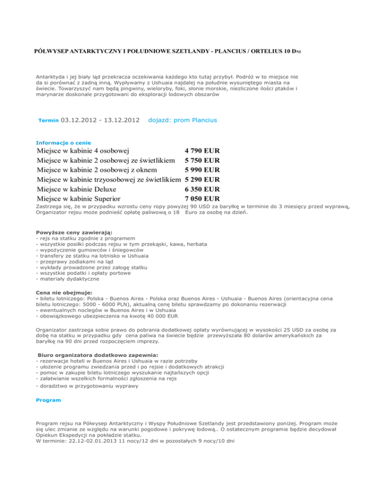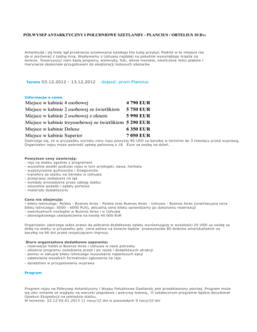 PÓŁWYSEP ANTARKTYCZNY I POŁUDNIOWE SZETLANDY - PLANCIUS / ORTELIUS 10 DNI Antarktyda i jej biały ląd przekracza oczekiwania każdego kto tutaj przybył. Podróż w to miejsce nie da si porównać z żadną inną. Wypływamy z Ushuaia najdalej na południe wysuniętego miasta na świecie. Towarzyszyć nam będą pingwiny, wieloryby, foki, słonie morskie, niezliczone ilości ptaków i marynarze doskonale przygotowani do eksploracji lodowych obszarów Termin 03.12.2012 - 13.12.2012 dojazd: prom Plancius Informacje o cenie Miejsce w kabinie 4 osobowej Miejsce w kabinie 2 osobowej ze świetlikiem Miejsce w kabinie 2 osobowej z oknem Miejsce w kabinie trzyosobowej ze świetlikiem Miejsce w kabinie Deluxe Miejsce w kabinie Superior 4 790 EUR 5 750 EUR 5 990 EUR 5 290 EUR 6 350 EUR 7 050 EUR Zastrzega się, że w przypadku wzrostu ceny ropy powyżej 90 USD za baryłkę w terminie do 3 miesięcy przed wyprawą, Organizator rejsu może podnieść opłatę paliwową o 18 Euro za osobę na dzień. Powyższe ceny zawierają: - rejs na statku zgodnie z programem - wszystkie posiłki podczas rejsu w tym przekąski, kawa, herbata - wypożyczenie gumowców i śniegowców - transfery ze statku na lotnisko w Ushuaia - przeprawy zodiakami na ląd - wykłady prowadzone przez załogę statku - wszystkie podatki i opłaty portowe - materiały dydaktyczne Cena nie obejmuje: - biletu lotniczego: Polska - Buenos Aires - Polska oraz Buenos Aires - Ushuaia - Buenos Aires (orientacyjna cena biletu lotniczego: 5000 - 6000 PLN), aktualną cenę biletu sprawdzamy po dokonaniu rezerwacji - ewentualnych noclegów w Buenos Aires i w Ushuaia - obowiązkowego ubezpieczenia na kwotę 40 000 EUR Organizator zastrzega sobie prawo do pobrania dodatkowej opłaty wyrównującej w wysokości 25 USD za osobę za dobę na statku w przypadku gdy cena paliwa na świecie będzie przewyższała 80 dolarów amerykańskich za baryłkę na 90 dni przed rozpoczęciem imprezy. Biuro organizatora dodatkowo zapewnia: - rezerwacje hoteli w Buenos Aires i Ushuaia w razie potrzeby - ułożenie programu zwiedzania przed i po rejsie i dodatkowych atrakcji - pomoc w zakupie biletu lotniczego wyszukanie najtańszych opcji - załatwianie wszelkich formalności zgłoszenia na rejs - doradztwo w przygotowaniu wyprawy Program Program rejsu na Półwysep Antarktyczny i Wyspy Południowe Szetlandy jest przedstawiony poniżej. Program może się ulec zmianie ze względu na warunki pogodowe i pokrywę lodową.. O ostatecznym programie będzie decydował Opiekun Ekspedycji na pokładzie statku. W terminie: 22.12-02.01.2013 11 nocy/12 dni w pozostałych 9 nocy/10 dni 1 dzień Zaokrętowanie w Ushuaia (Argentyna). Przeprawa przez Kanał Beagle. 2-3 dzień (na morzu) Podczas tych dwóch dni przepłyniemy przez Cieśninę Draka. Kiedy przetniemy antarktyczny front polarny dopłyniemy do Białego Kontynentu. Zobaczymy tutaj różne gatunki albatrosów, petreli i innych ptaków. W pobliżu Południowych Szetlandów zobaczymy pierwsze góry lodowe. 4 – 8 dzień Antarktyda –płyniemy obok Wysp Melchiora i Kanału Schollaert pomiędzy wyspami Brabant i Anvers. Na Wyspie Cuverville, która znajduje się pomiędzy Białym kontynentem a Wyspą Danco zobaczymy dużą kolonie pingwinów szarobrewych. Jeśli uda nam się zacumować na Wyspie Danco będzie okazja do obserwacji innych gatunków pingwinów i fok. W zatoce Neko postawimy wreszcie naszą nogę na kontynencie we wspaniałej scenerii olbrzymich lodowców. Tutaj również będziemy pływać zodiakami. Następnie mijając góry lodowe, pływając fiordem będzie możliwość wypatrzenia różnych gatunków wielorybów. Następnie przepłyniemy przez Kanał Lemaire do Pleneru i Wysp Petermann gdzie napotkamy prawdopodobnie pingwiny Adeli i kormorany niebieskookie.. Odwiedzimy stacje badawcze i będziemy mieli okazje przyjrzeć się ludziom żyjącym i pracującym na Antarktydzie. Następnie w drodze na północ w końcu dopłyniemy na Wyspy Południowe Szetlandy. Dalej udajemy sie do Deception Island. Nasz statek odważy się wpłynąć do krateru przez Neptune” Bellon w pierścień Deception Island. Mamy nadzieje, że uda nam się tutaj pospacerować i popływać kajakami, ale wszystko zależy od warunków pogodowych. Deception to krater, który otwiera sie na morze, tworząc naturalną zatokę dla statku. Tutaj znajdują się gorące źródła, opuszczona stacja wielorybnicza, w tym miejscu żyje tysiące gatunków ptaków Stamtąd udamy się na Wyspe Half Moon Island, gdzie mieszkają kolonie pingwinów. Można również przyjrzeć się fokom wylegującym się na plaży. Wulkaniczne wyspy Południowych Szetlandów są często pokryte mgłą, ale dostarczają wspaniałych przeżyć. Można zobaczyć również florę Antarktydy (kwitnącą trawę, mchy, porosty) Nasza podróż trwa dalej poprzez wąską cieśninę wpływamy na otwarte morze i dalej do Ushuaia. 9-10 dzień Na morzu- w drodze na północ ponownie napotkamy niezliczone ilości ptaków podczas przeprawy Cieśniną Drake. 11 dzień Ushuaia –przypłyniemy rano do Ushuaia i wyokrętujemy się. Dodatkowe Informacje Zaokrętownie: Ushuaia (Argentyna) Zakończenie: Ushuaia (Argentyna) Przykładowe opcje wycieczek jednodniowych: 1. Park Narodowy Ziemi Ognistej, gdzie można podziwiać niezmienioną przez człowieka przyrodę, a w szczególności lasy notofagusów (buków południowych), bądź wspiąć się na szczyt Cerro Guanako. 2. Rejs promem do Colonii de Sacramento w Urugwaju, słynącej z kolonialnej zabudowy. Przykładowe wycieczki kilkudniowe 3 dniowa wycieczka do wodospadów Iguazu. 4 dniowa wycieczka do lodowca Perito Moreno w El Calafate.