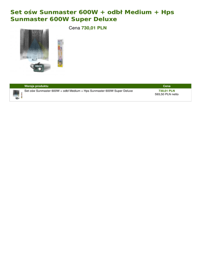 Set ośw Sunmaster 600W + odbł Medium + Hps Sunmaster 600W Super Deluxe Cena 730,01 PLN Wersja produktu Set ośw Sunmaster 600W + odbł Medium + Hps Sunmaster 600W Super Deluxe Powered by TCPDF (www.tcpdf.org) Cena 730,01 PLN 593,50 PLN netto