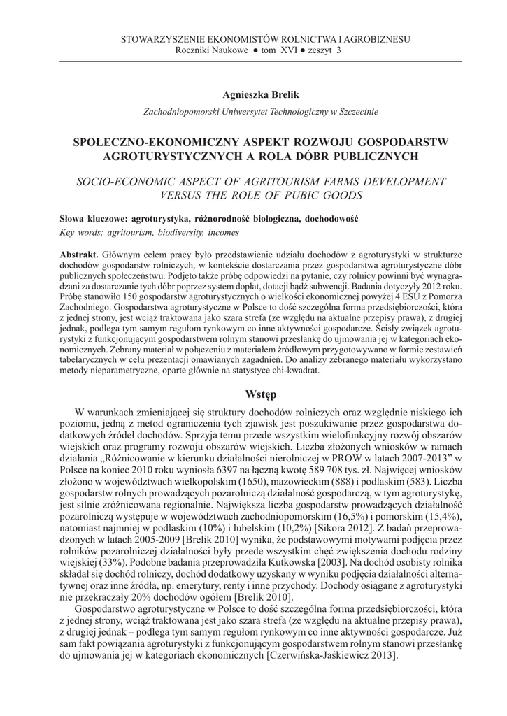 STOWARZYSZENIE EKONOMISTÓW ROLNICTWA I aAGROBIZNESU Społeczno-ekonomiczny aspekt rozwoju gospodarstw agroturystycznych rola dóbr publicznych Roczniki Naukowe ● tom XVI ● zeszyt 3 43 Agnieszka Brelik Zachodniopomorski Uniwersytet Technologiczny w Szczecinie SPOŁECZNO-EKONOMICZNY ASPEKT ROZWOJU GOSPODARSTW AGROTURYSTYCZNYCH A ROLA DÓBR PUBLICZNYCH SOCIO-ECONOMIC ASPECT OF AGRITOURISM FARMS DEVELOPMENT VERSUS THE ROLE OF PUBIC GOODS Słowa kluczowe: agroturystyka, różnorodność biologiczna, dochodowość Key words: agritourism, biodiversity, incomes Abstrakt. Głównym celem pracy było przedstawienie udziału dochodów z agroturystyki w strukturze dochodów gospodarstw rolniczych, w kontekście dostarczania przez gospodarstwa agroturystyczne dóbr publicznych społeczeństwu. Podjęto także próbę odpowiedzi na pytanie, czy rolnicy powinni być wynagradzani za dostarczanie tych dóbr poprzez system dopłat, dotacji bądź subwencji. Badania dotyczyły 2012 roku. Próbę stanowiło 150 gospodarstw agroturystycznych o wielkości ekonomicznej powyżej 4 ESU z Pomorza Zachodniego. Gospodarstwa agroturystyczne w Polsce to dość szczególna forma przedsiębiorczości, która z jednej strony, jest wciąż traktowana jako szara strefa (ze względu na aktualne przepisy prawa), z drugiej jednak, podlega tym samym regułom rynkowym co inne aktywności gospodarcze. Ścisły związek agroturystyki z funkcjonującym gospodarstwem rolnym stanowi przesłankę do ujmowania jej w kategoriach ekonomicznych. Zebrany materiał w połączeniu z materiałem źródłowym przygotowywano w formie zestawień tabelarycznych w celu prezentacji omawianych zagadnień. Do analizy zebranego materiału wykorzystano metody nieparametryczne, oparte głównie na statystyce chi-kwadrat. . Wstęp W warunkach zmieniającej się struktury dochodów rolniczych oraz względnie niskiego ich poziomu, jedną z metod ograniczenia tych zjawisk jest poszukiwanie przez gospodarstwa dodatkowych źródeł dochodów. Sprzyja temu przede wszystkim wielofunkcyjny rozwój obszarów wiejskich oraz programy rozwoju obszarów wiejskich. Liczba złożonych wniosków w ramach działania „Różnicowanie w kierunku działalności nierolniczej w PROW w latach 2007-2013” w Polsce na koniec 2010 roku wyniosła 6397 na łączną kwotę 589 708 tys. zł. Najwięcej wniosków złożono w województwach wielkopolskim (1650), mazowieckim (888) i podlaskim (583). Liczba gospodarstw rolnych prowadzących pozarolniczą działalność gospodarczą, w tym agroturystykę, jest silnie zróżnicowana regionalnie. Największa liczba gospodarstw prowadzących działalność pozarolniczą występuje w województwach zachodniopomorskim (16,5%) i pomorskim (15,4%), natomiast najmniej w podlaskim (10%) i lubelskim (10,2%) [Sikora 2012]. Z badań przeprowadzonych w latach 2005-2009 [Brelik 2010] wynika, że podstawowymi motywami podjęcia przez rolników pozarolniczej działalności były przede wszystkim chęć zwiększenia dochodu rodziny wiejskiej (33%). Podobne badania przeprowadziła Kutkowska [2003]. Na dochód osobisty rolnika składał się dochód rolniczy, dochód dodatkowy uzyskany w wyniku podjęcia działalności alternatywnej oraz inne źródła, np. emerytury, renty i inne przychody. Dochody osiągane z agroturystyki nie przekraczały 20% dochodów ogółem [Brelik 2010]. Gospodarstwo agroturystyczne w Polsce to dość szczególna forma przedsiębiorczości, która z jednej strony, wciąż traktowana jest jako szara strefa (ze względu na aktualne przepisy prawa), z drugiej jednak – podlega tym samym regułom rynkowym co inne aktywności gospodarcze. Już sam fakt powiązania agroturystyki z funkcjonującym gospodarstwem rolnym stanowi przesłankę do ujmowania jej w kategoriach ekonomicznych [Czerwińska-Jaśkiewicz 2013]. 44 Agnieszka Brelik Głównym celem badań było przedstawienie struktury dochodów z agroturystyki w kontekście dostarczania przez gospodarstwa agroturystyczne dóbr publicznych społeczeństwu oraz odpowiedź na pytanie, czy rolnicy powinni być wynagradzani za dostarczanie tych dóbr poprzez system dopłat, dotacji bądź subwencji. Materiał i metodyka badań Charakter analiz realizowanych w pracy wymagał przeprowadzenia badań własnych, którymi objęte zostały gospodarstwa agroturystyczne Pomorza Zachodniego. Badania zrealizowano w 2012 roku przez wykwalifikowanych ankieterów współpracujących z ośrodkami doradztwa rolniczego, tzn. inspektorów, mających długoletnie doświadczenie w realizacji tego typu badań. Pozwoliło to na uzyskanie wiarygodnego materiału statystycznego o relatywnie wysokiej wiarygodności oraz poprawności formalnej. Na pierwszym etapie ustalono liczebność próby – 450 gospodarstw agroturystycznych, spośród których wybrano gospodarstwa agroturystyczne o wielkości ekonomicznej powyżej 4 ESU. Istotny był bowiem element aktywności ekonomicznej wynikający z produkcji rolnej. Liczebność próby w efekcie końcowym wyniosła 150 gospodarstw. Przeprowadzone badania mogą dawać sygnalne wnioski odnośnie badanych zjawisk w skali ogólnopolskiej dla gospodarstw agroturystycznych o sile ekonomicznej powyżej 4 ESU. Normalność rozkładu cech mierzalnych zbadano przy pomocy testu zgodności. Posłużono się następującymi testami zgodności w zależności, czy badana cecha spełniała założenia stosowalności danego testu. Okazało się, że we wszystkich badanych przypadkach hipotezę o normalności rozkładu badanej cechy przy błędzie I rodzaju α = 0,05 należało odrzucić. z tego względu w analizie zebranego materiału posługiwano się metodami nieparametrycznymi, głównie testem niezależności. Użyto także testu nieparametrycznego Kruskala-Wallisa, a grupy jednorodne uzyskano z testu wielokrotnego porównania średnich rang dla wszystkich grup, co umożliwiło wykonanie porównań post-hoc dla średnich rang wszystkich par grup [Siegel, Castellan 1988]. Dla 