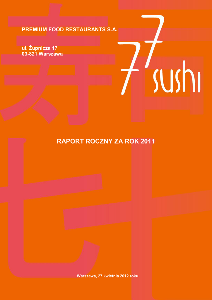 RAPORT ROCZNY SPÓLKI PREMIUM FOOD RESTAURANTS S.A. za rok zakończony 31 grudnia 2010 roku PREMIUM FOOD RESTAURANTS S.A. ul. Żupnicza 17 03-821 Warszawa RAPORT ROCZNY ZA ROK 2011 Warszawa, 27 kwietnia 2012 roku 1 RAPORT ROCZNY SPÓLKI PREMIUM FOOD RESTAURANTS S.A. za rok zakończony 31 grudnia 2011 roku SPIS TREŚCI A. LIST PREZESA ZARZĄDU EMITENTA DO AKCJONARIUSZY ....................................................... 3 B. WYBRANE DANE FINANSOWE ............................................................................................................ 4 C. SPRAWOZDANIE FINANSOWE ............................................................................................................ 5 I. WPROWADZENIE DO SPRAWOZDANIA FINANSOWEGO ..................................................... 5 II. BILANS.............................................................................................................................................. 13 III. RACHUNEK ZYSKÓW I STRAT ................................................................................................... 16 IV. ZESTAWIENIE ZMIAN W KAPITALE WŁASNYM ..................................................................... 17 V. RACHUNEK PRZEPŁYWÓW PIENIĘŻNYCH ............................................................................ 18 VI. DODATKOWE INFORMACJE I OBJAŚNIENIA. ........................................................................ 19 D. SPRAWOZDANIE ZARZĄDU Z DZIAŁALNOŚCI SPÓŁKI ............................................................... 31 E. RAPORT W PRZEDMIOCIE STOSOWANIA ZASAD ŁADU KORPORACYJNEGO .................36 F. OŚWIADCZENIA ZARZĄDU EMITENTA ............................................................................................ 41 2 RAPORT ROCZNY SPÓLKI PREMIUM FOOD RESTAURANTS S.A. za rok zakończony 31 grudnia 2011 roku A. LIST PREZESA ZARZĄDU EMITENTA DO AKCJONARIUSZY Szanowni Państwo! Przekazujemy Państwu raport roczny Premium Food Restaurants S.A. za rok 2011. Rok 2011 był pierwszym, który przyniósł zysk, znaczący zysk. Rentowność sprzedaży netto wyniosła 8 procent. W styczniu 2011 kiedy objęłam stery Prezesa Zarządu skupiłam się na poprawie efektywności biznesu w tym na umiejętnym obniżeniu kosztów i zwiększeniu sprzedaży. Praktycznie od razu, znając Spółkę od wielu lat, dokonałam największych ale istotnych zmian. Te działania już w pierwszym kwartale zmieniły firmę, która traci pieniądze, na wysoko rentowny interes. Wg mnie i w odróżnieniu od tego, co mówi wiele innych spółek z branży, 2012 i lata kolejne to dobry czas na dalszy rozwój w segmencie gastronomicznym. Utrzymując dyscyplinę praktycznie w każdym aspekcie naszej działalności, jestem przekonana, że możemy znacząco poprawiać nasze wyniki. Przełoży się na to zarówno dalszy rozwój sieci 77 Sushi jak i nowy brand MeLikeSushi, który zaoferuje gotowe zestawy. Dziękuję wszystkim pracownikom za zaangażowanie i dopinguję do dalszej ciężkiej pracy w budowaniu naszej firmy. Dziękuje akcjonariuszom, w tym mojemu mężowi, za dane mi zaufanie. Z poważaniem, Aleksandra Tymińska Prezes Zarządu 3 RAPORT ROCZNY SPÓLKI PREMIUM FOOD RESTAURANTS S.A. za rok zakończony 31 grudnia 2011 roku B. WYBRANE DANE FINANSOWE Dane bilansowe przeliczono według średniego kursu ogłoszonego przez Prezesa NBP na dzień sporządzenia sprawozdania finansowego, który na dzień bilansowy wynosił: na dzień 31/12/2011- 4,4168 zł/ EUR, na dzień 31/12/2010- 3,9603 zł/ EUR. Dane rachunku zysków i strat oraz rachunku przepływów pieniężnych przeliczono na EURO według kursu ustalonego jako średnia arytmetyczna średnich kursów ogłaszanych przez Prezesa NBP na ostatni dzień każdego miesiąca roku: za rok 2011- 4,1401 zł/ EUR, za rok 2010- 4,0044 zł/ EUR. 2011 2010 2011 w zł Przychody netto ze sprzedaży produktów towarów i mat. 2010 w EUR 11 064 063 9 508 777 2 672 398 2 374 607 1 044 005 -230 463 252 168 -57 553 Zysk (strata) netto 885 025 -351 843 213 768 -87 865 Przepływy pieniężne z działalności operacyjnej 583 896 8 626 141 033 2 154 Przepływy pieniężne netto z działalności inwestycyjnej -144 713 91 266 -34 954 22 792 Przepływy pieniężne netto z działalności finansowej -271 056 -146 870 -65 470 -36 678 168 127 -46 978 40 609 -11 732 Aktywa obrotowe 1 181 518 731 670 267 505 184 751 Aktywa trwałe 2 621 284 2 852 997 593 480 720 399 Aktywa razem 3 802 801 3 584 667 860 986 905 150 Kapitał podstawowy 565 000 565 000 127 921 142 666 Kapitał własny 415 033 -469 992 93 967 -118 676 Zobowiązania długoterminowe 2 177 229 2 185 349 492 943 551 814 Zobowiązania krótkoterminowe 1 181 081 1 841 658 267 407 465 030 Zobowiązania i rezerwy na zobowiązania 3 387 768 4 054 659 767 019 1 023 826 Zysk (strata) na sprzedaży Przepływy pieniężne netto razem 4 RAPORT ROCZNY SPÓLKI PREMIUM FOOD RESTAURANTS S.A. za rok zakończony 31 grudnia 2011 roku Wprowadzenie do sprawozdania finansowego C. SPRAWOZDANIE FINANSOWE I. WPROWADZENIE DO SPRAWOZDANIA FINANSOWEGO 1. INFORMACJE OGÓLNE a) Premium Food Restaurants SA powstała w wyniku przekształcenia Premium Food Restauracje Sp. z o.o. Przekształcenie to zostało zarejestrowane w dniu 1 kwietnia 2008 roku. Premium Food Restauracje Sp. z o.o. została utworzona aktem notarialnym z dnia 12 listopada 2003 r. nr Rep. A 9081/2003. Siedziba spółki mieści się w Warszawie przy ulicy Żupniczej 17. Do października 2005 r. spółka nosiła nazwę Tsubame Dystrybucja Sp. z o.o. W dniu 07 października 2005 r., Nadzwyczajne Zgromadzenie Wspólników podjęło uchwałę w sprawie zmiany nazwy spółki na „Premium Food Restauracje”. b) Spółka wpisana jest do Rejestru Przedsiębiorców prowadzonego przez Sąd Rejonowy dla Miasta Stołecznego Warszawy, XIII Wydział Gospodarczy Krajowego Rejestru Sądowego pod numerem KRS 0000302804, NIP 113-253-75-59. c) Wg Statutu spółki przedmiotem działania spółki jest: