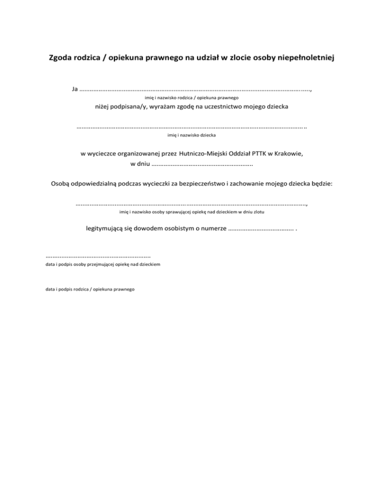 Zgoda rodzica / opiekuna prawnego na udział w zlocie osoby niepełnoletniej Ja ….............................................................................................................................., imię i nazwisko rodzica / opiekuna prawnego niżej podpisana/y, wyrażam zgodę na uczestnictwo mojego dziecka ….............................................................................................................................. imię i nazwisko dziecka w wycieczce organizowanej przez Hutniczo-Miejski Oddział PTTK w Krakowie, w dniu …...................................................... Osobą odpowiedzialną podczas wycieczki za bezpieczeństwo i zachowanie mojego dziecka będzie: ….............................................................................................................................., imię i nazwisko osoby sprawującej opiekę nad dzieckiem w dniu zlotu legitymującą się dowodem osobistym o numerze ….................................. . …........................................................ data i podpis osoby przejmującej opiekę nad dzieckiem data i podpis rodzica / opiekuna prawnego