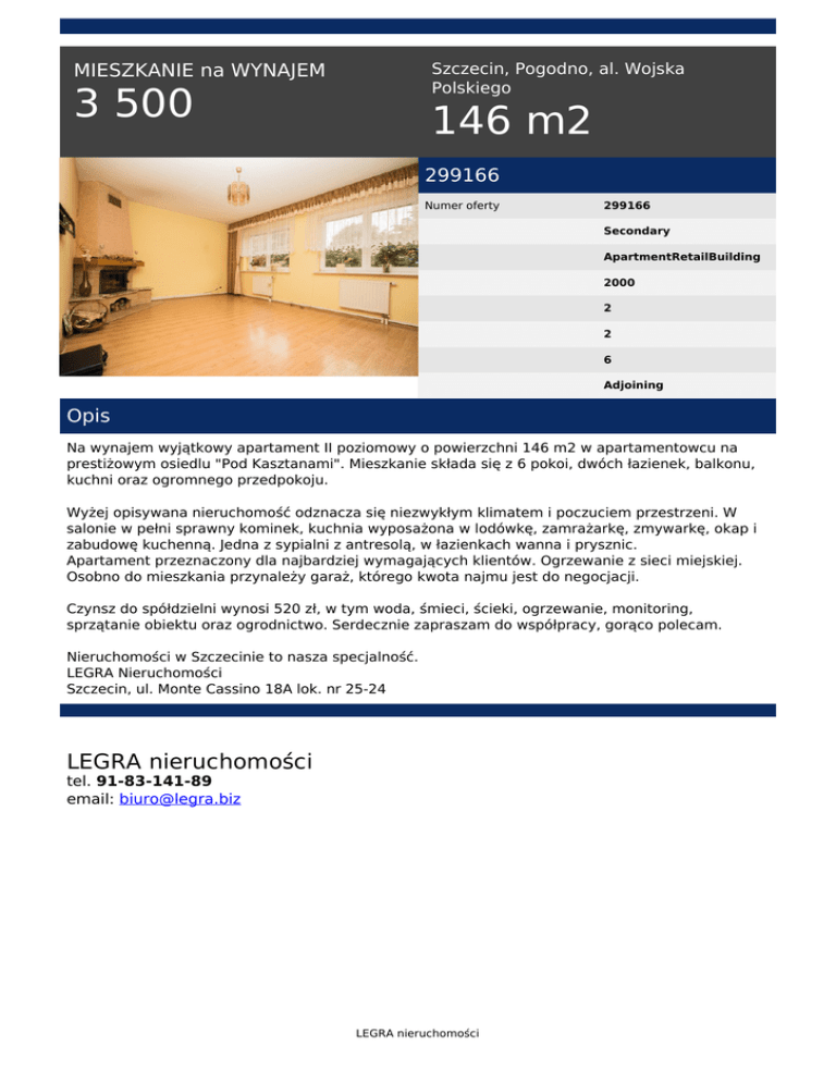 Szczecin, Pogodno, al. Wojska Polskiego MIESZKANIE na WYNAJEM 3 500 146 m2 299166 Numer oferty 299166 Secondary ApartmentRetailBuilding 2000 2 2 6 Adjoining Opis Na wynajem wyjątkowy apartament II poziomowy o powierzchni 146 m2 w apartamentowcu na prestiżowym osiedlu "Pod Kasztanami". Mieszkanie składa się z 6 pokoi, dwóch łazienek, balkonu, kuchni oraz ogromnego przedpokoju. Wyżej opisywana nieruchomość odznacza się niezwykłym klimatem i poczuciem przestrzeni. W salonie w pełni sprawny kominek, kuchnia wyposażona w lodówkę, zamrażarkę, zmywarkę, okap i zabudowę kuchenną. Jedna z sypialni z antresolą, w łazienkach wanna i prysznic. Apartament przeznaczony dla najbardziej wymagających klientów. Ogrzewanie z sieci miejskiej. Osobno do mieszkania przynależy garaż, którego kwota najmu jest do negocjacji. Czynsz do spółdzielni wynosi 520 zł, w tym woda, śmieci, ścieki, ogrzewanie, monitoring, sprzątanie obiektu oraz ogrodnictwo. Serdecznie zapraszam do współpracy, gorąco polecam. Nieruchomości w Szczecinie to nasza specjalność. LEGRA Nieruchomości Szczecin, ul. Monte Cassino 18A lok. nr 25-24 LEGRA nieruchomości tel. 91-83-141-89 email: [email protected] LEGRA nieruchomości Powered by TCPDF (www.tcpdf.org)
